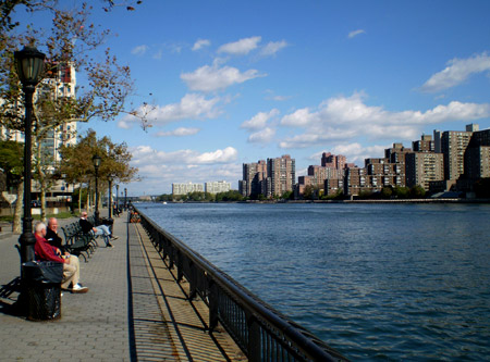 The bike trail heads north along the East River passing through the upscale residential neighbourhoods of Sutton Place, Yorkville and the rest of the Upper East Side. It is much more a shared path here than anywhere else. Bicyclists, runners, strollers, dog walkers, the young and the old jostle for space with one another. Benches line most of the pathway greatly reducing the usable area making any kind of speed biking not only dangerous but virtually impossible.
