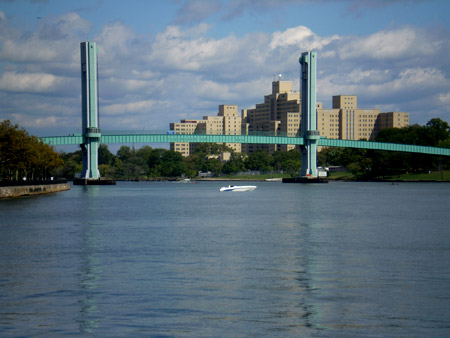 Near Randall’s Island, the East River’s channel bifurcates to form the Harlem River which eventually connects with the Hudson River about 8 miles away. In doing so it separates Manhattan Island from the Bronx. There are over 10 Bridges of varying design, size and use which span the Harlem River. Almost all of them connect Manhattan with the Bronx. The only one that doesn’t is an unusual ‘lift bridge‘ for pedestrians (the first that I’ve come across) which connects Manhattan with Randall’s Island.
