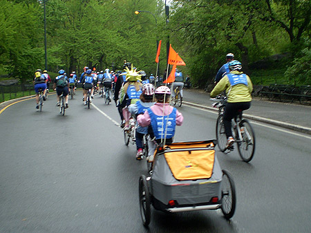 The front of the tour maintains a brisk pace of 15 mph (the more competitive and often aggressive road bikes) and a more leisurely pace of 6 mph brings up the rear. In between are cyclists and cycles of every hue, shape and colour but the one which easily drew the most admiration was this one I spotted riding through Central Park. A father leading 3 kids and a wagon in tow – a ‘cycle train’ if you will!