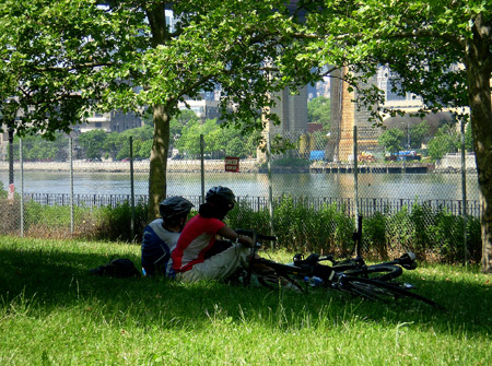 Following Vernon Blvd along the East River we entered Long Island City (my last hood) and just short of the Queensboro Bridge, made a much needed rest stop at Queens Bridge Park. Corn Muffins, Bananas, energy bars, lots of water and some much needed shade were just what the doc had ordered and the 20 minute break gave some much needed respite from the extreme weather that day.