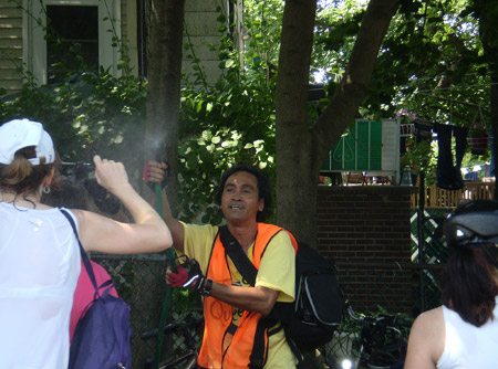 The much more residential neighbourhood of Middle Village was next and boasted some of the most undulating terrain along our route. Unfortunately for us bikers, the frequent ‘ups’ and the all to scarce ‘downs’ had to be tackled around noon – when heat and humidity were at their very best! At one intersection, which was thoughtfully (!) planned on one of the steepest ascents in the area, there was bunching and we had to wait it out for what seemed like eternity. But as with most other neighbourhoods along our route, the residents of Middle Village were out in large numbers, to greet us with garden hoses and cyclists took turns reveling in the cold spray!