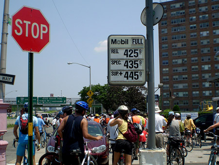 Corona was the last neighbourhood we would pass through that day and the area itself is separated from the Flushing Meadows-Corona Park by the Long Island Expressway (LIE). As we bunched up to gain access to the pedestrian over pass, the scene couldn’t have been more apt. Cyclists swarming through a gas station where gas prices were displayed at their all time high and a perfectly placed Stop sign which sent home the message loud and clear – Ditch your cars! Sustainable transport is here to stay!!