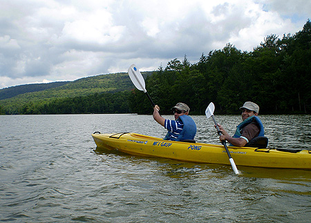 After being sufficiently dehydrated by that bit of indulgence, a lot of water was imbibed, a bath was had and a hearty breakfast consumed. And then, it was time to work off some of the excesses from the night before! What followed was an hour’s worth of kayaking in the tranquil environs of Mongaup Pond.