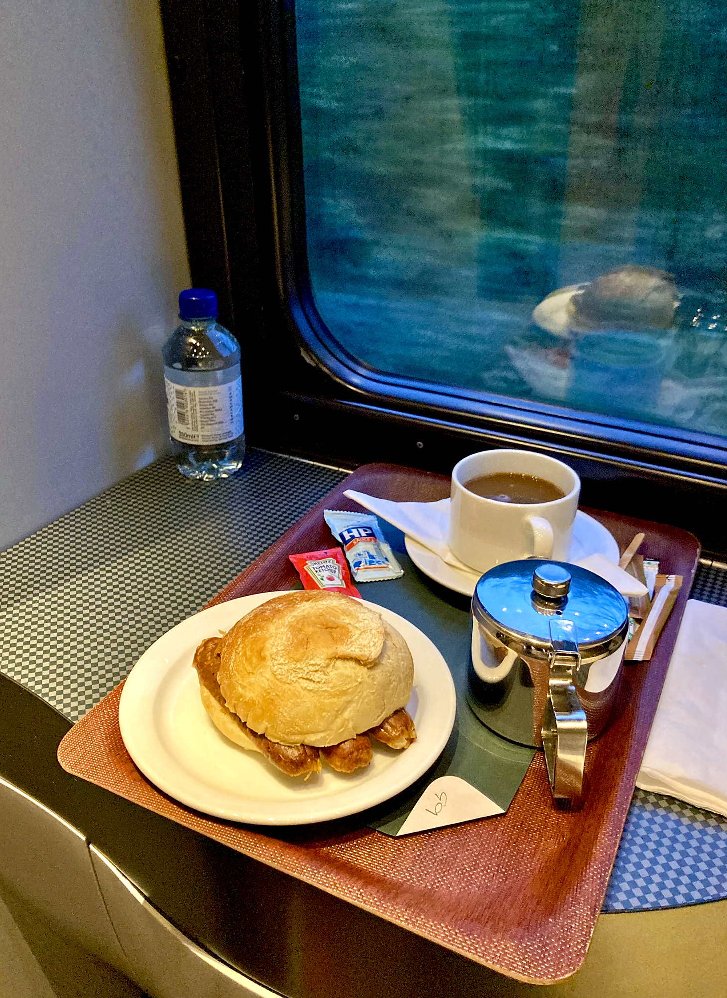 A knock on my door at 6:30 cheers me up somewhat. It’s Emma with my breakfast. Included in the price of my sleeper fare, and delivered to my cabin at precisely the time I’d requested, it consists of a sausage roll, or a breakfast bap as it’s known in the UK, and a pot of coffee. Everything’s nice and hot, of a high standard, and the presentation is a considerable step up from the Caledonian.