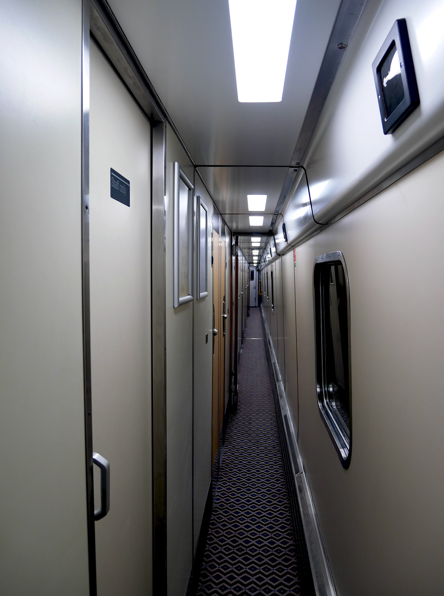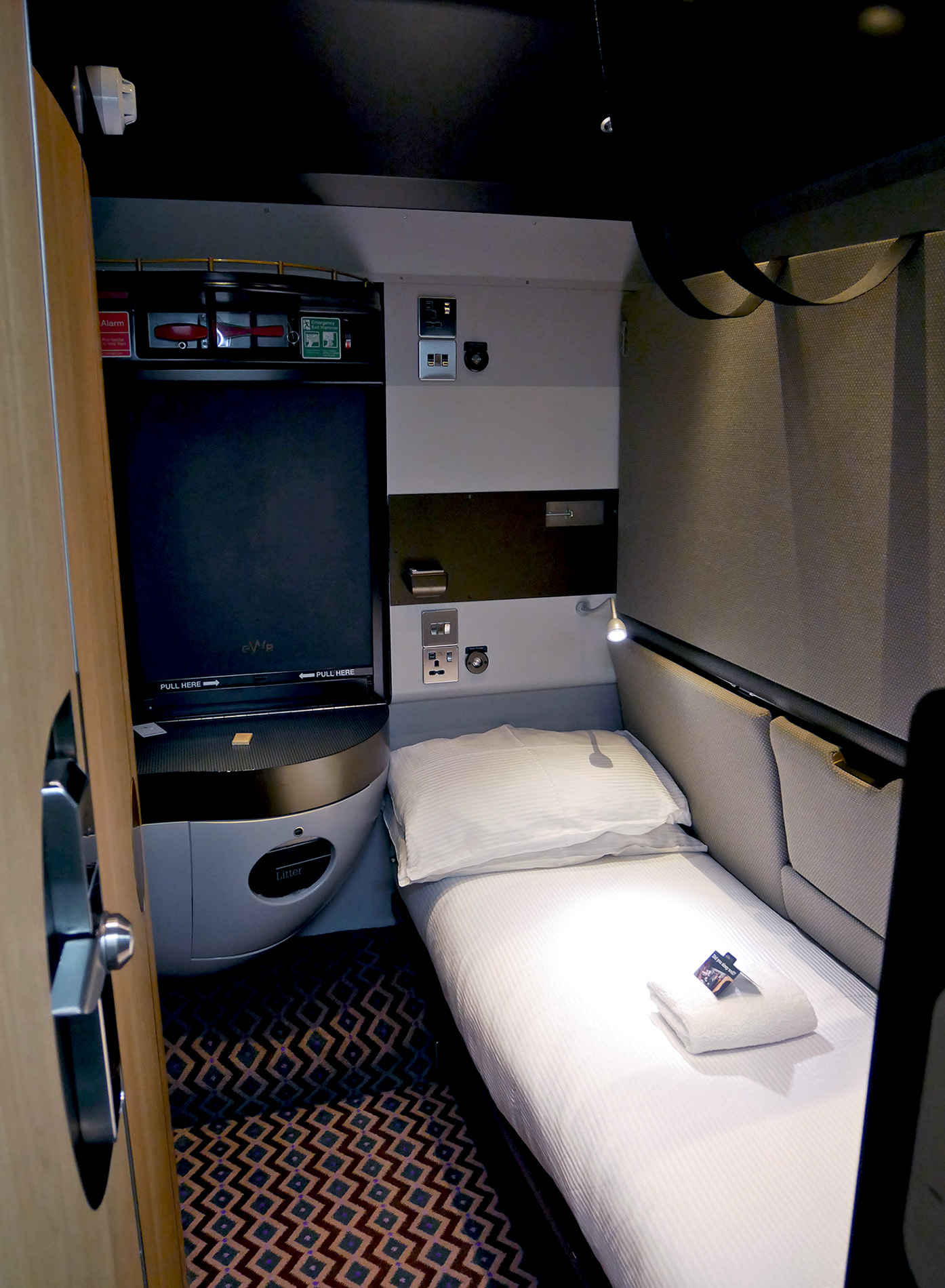 Satisfied with my look around the old waiting room, and after having scrutinized platform 1 from end to end, I eventually make my way to my overnight digs in carriage G. A rather narrow corridor leads to my cabin for two, that’s already been set up in single mode. Following close on my heels is the carriage attendant, who introduces herself as Emma, gives me a minute to settle in, and then runs me through the various amenities in my cabin, as well as the safety features within.