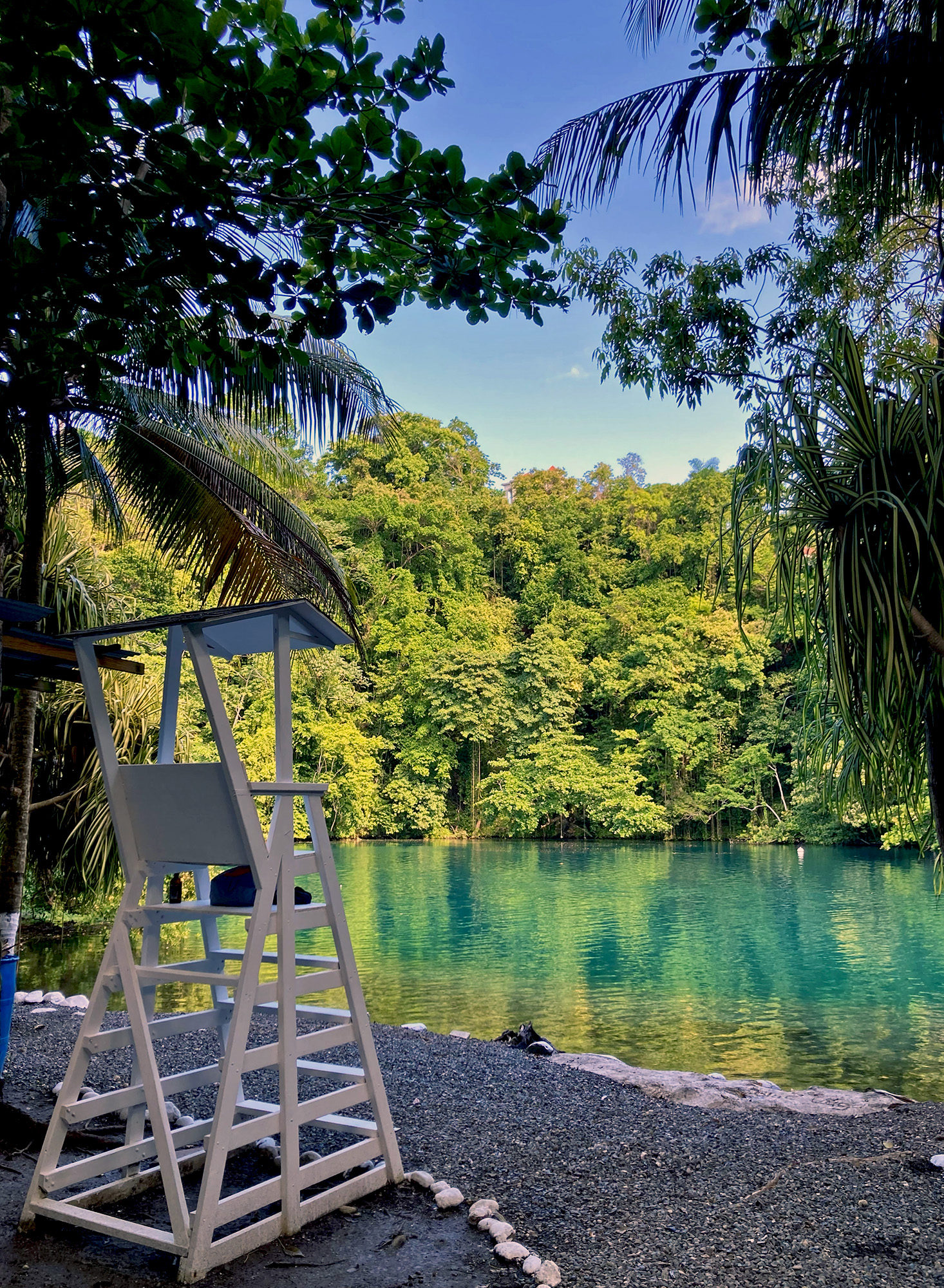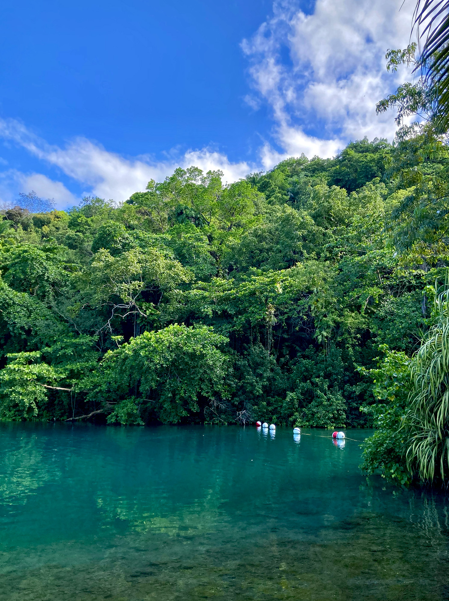 The Blue Lagoon, or “Blue Hole” as it’s referred to locally, is located a few miles east of Port Antonio, and we stop there for a brief visit post lunch. Fun fact: the namesake film that launched Brooke Shields career was filmed mostly on an island in Fiji, with very few scenes shot in Jamaica. But Hollywood trivia aside, the Blue Lagoon is a spectacle, from practically any angle. Set in a narrow cove that’s cradled by forested cliffs, the water at the lagoon is 180-feet deep at its deepest point, giving it its color and name. Located at the shallowest end of the cove is a earmarked swimming area, for those who fancy a dip. It’s only a few feet deep so appears tempting at first, till you see that flimsy rope float separating you and that precipitous drop. We quickly pass.