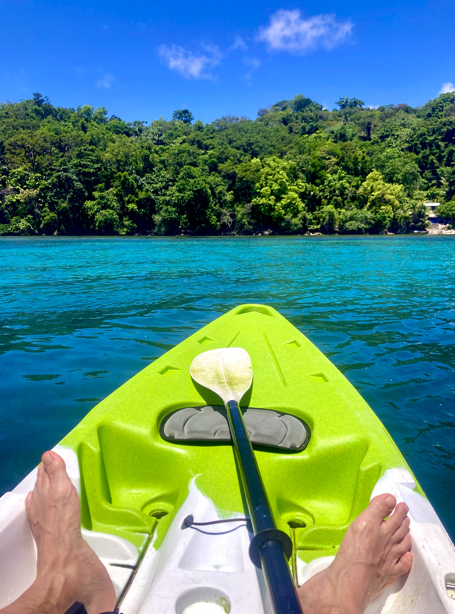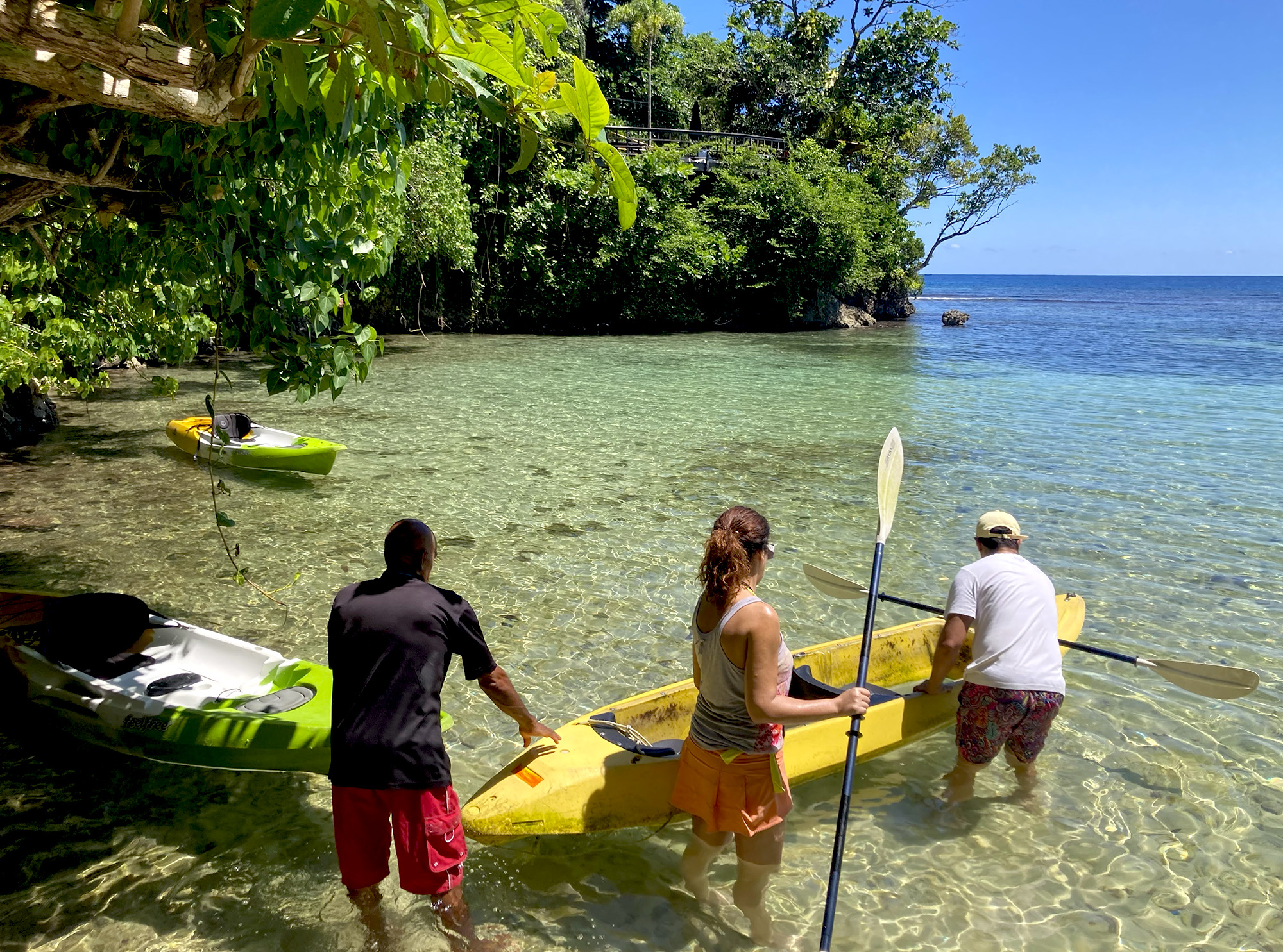 After breakfast, we make our way down the two hundred or so steps that lead to Geejam’s private beach club, where a final landing brings us into the warm embrace of the Caribbean. Arthur is the lifeguard at the Geejam, and under his tutelage we kayak into the incredibly calm waters of Geejam bay, which we have entirely to ourselves this morning. First, the sights. Arthur points in the direction of Fishermen’s Cove, a much coveted strip of sand in these parts; and closer to us, the stunning property that was used as a filming locale for the Bond flick, No Time to Die. Then come the drumbeats. Using the sides of his kayak to good effect, Arthur lures a sea turtle to the surface of the water.