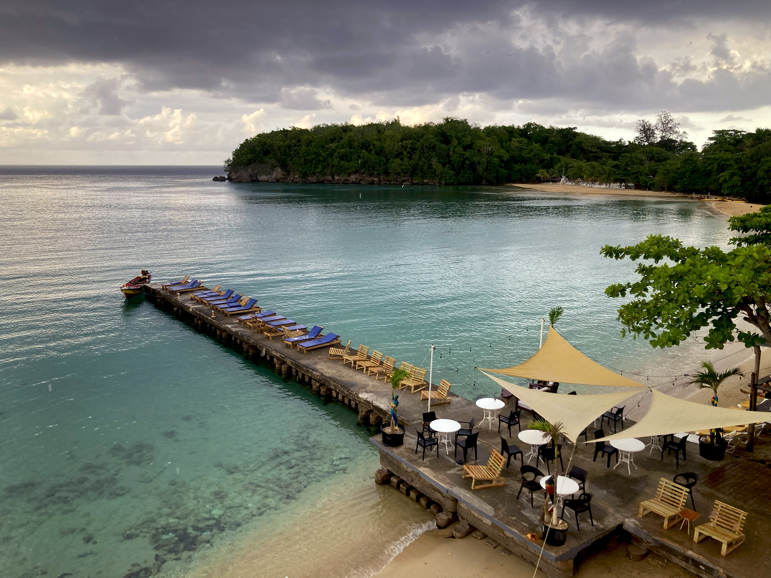The guides had warned us, if at all it rained, which is typically accompanied by lightning in these parts, the trip up the falls would be called off immediately. Not a drop fell on our ascent, thankfully, but by the time we get to our rental car, the heavens open up. A double speed wiper adventure, and one last FU from Google later, we’ve made it to the Sand and Tan Beach Hotel. It’s a far cry from the Geejam, or even the swish AC Hotel in Kingston, but it’s also sufficiently removed from tourist central in Ocho Rios. Offering ocean views from every room that beg for a longer stay, it has its own strip of sand adjacent to a public beach, and best of all, a delightfully rustic tiki bar abutting a ramshackle pier full of well-worn loungers.