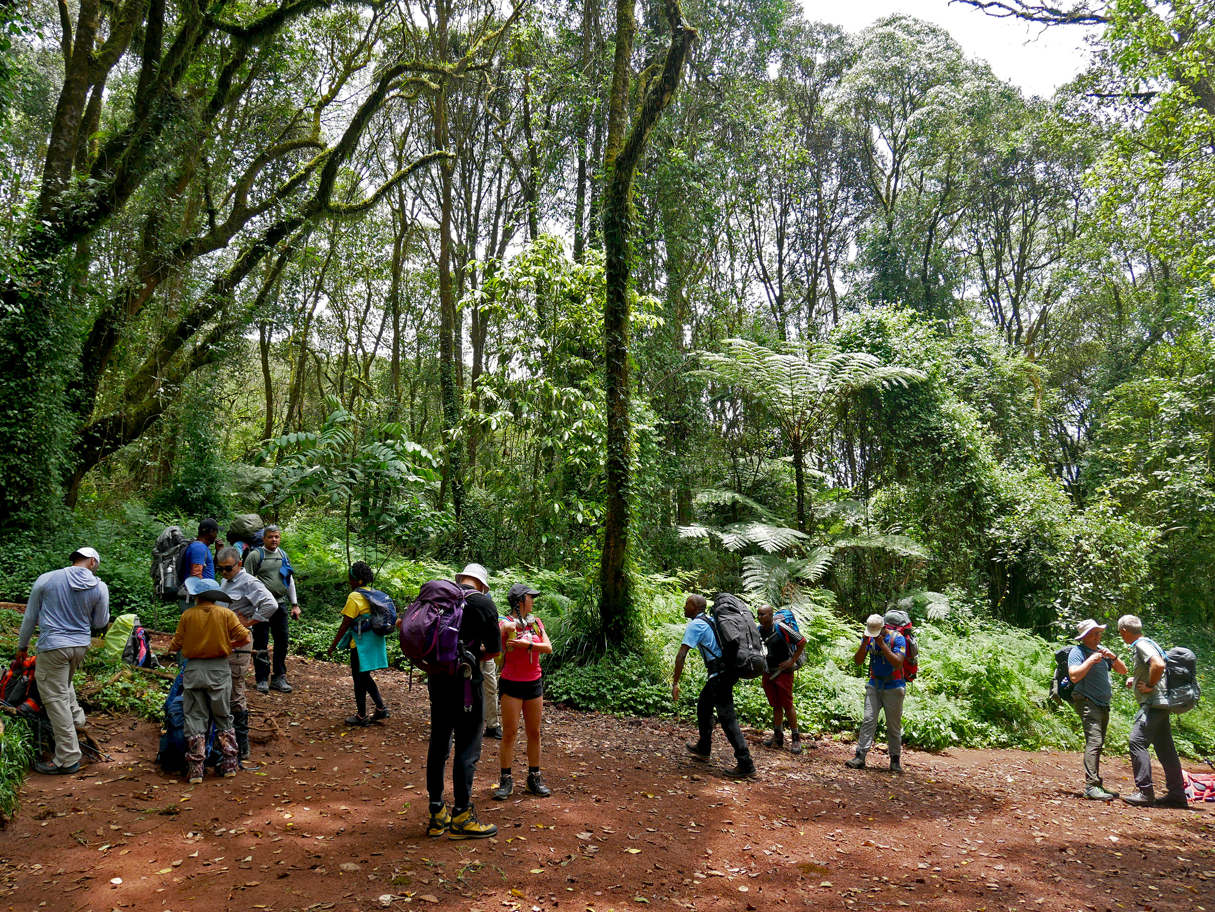 Twende Twende, Michael exclaims. We’ll pick up more than a smattering of Swahili by the end of our trek, but for now this is an important one. It’s our guide’s way of urging us to get a move on. It’s 1130 am local time and as we begin our hike, we leave the relative comforts of Machame Gate (5900 ft / 1800 m) behind. Ahead of us lies a magical canopy of ferns, lichens and clinging mosses; giant Camphorwood trees, and the occasional sighting of a Colobus Monkey. Through it all, seven grueling miles of a relentless uphill ascent. The Rainforest is the first of four distinct ecosystems we will experience over the course of our climb, and as beautiful as it is, we can hardly do it any justice; focussing instead on the drudgery of the first day’s incline, and the hours of walking that lie ahead. A break for lunch couldn’t be more welcome.