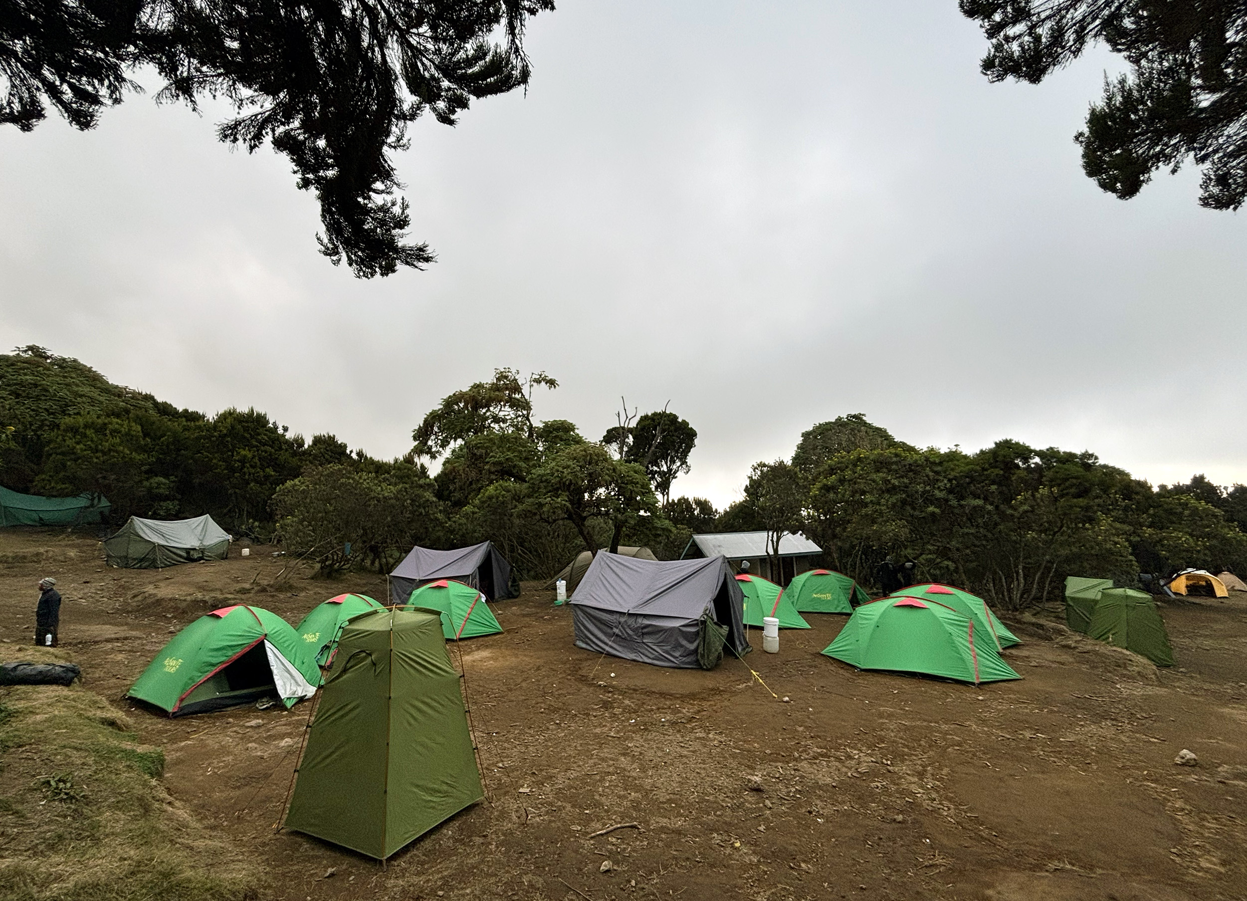 Today’s lunch is a packed one that we carried with us, but every other meal on the trek will be freshly prepared. A real luxury that. Five and a half hours after leaving Machame Gate, and with almost 3500-feet gained in elevation, we arrive rather beat at Machame Camp (9300 ft / 2835 m). Our campsite is already set up, and the six of us are perplexed as to when our porters might have overtaken us. Were we that slow? This would be a recurring theme every day, no doubt.