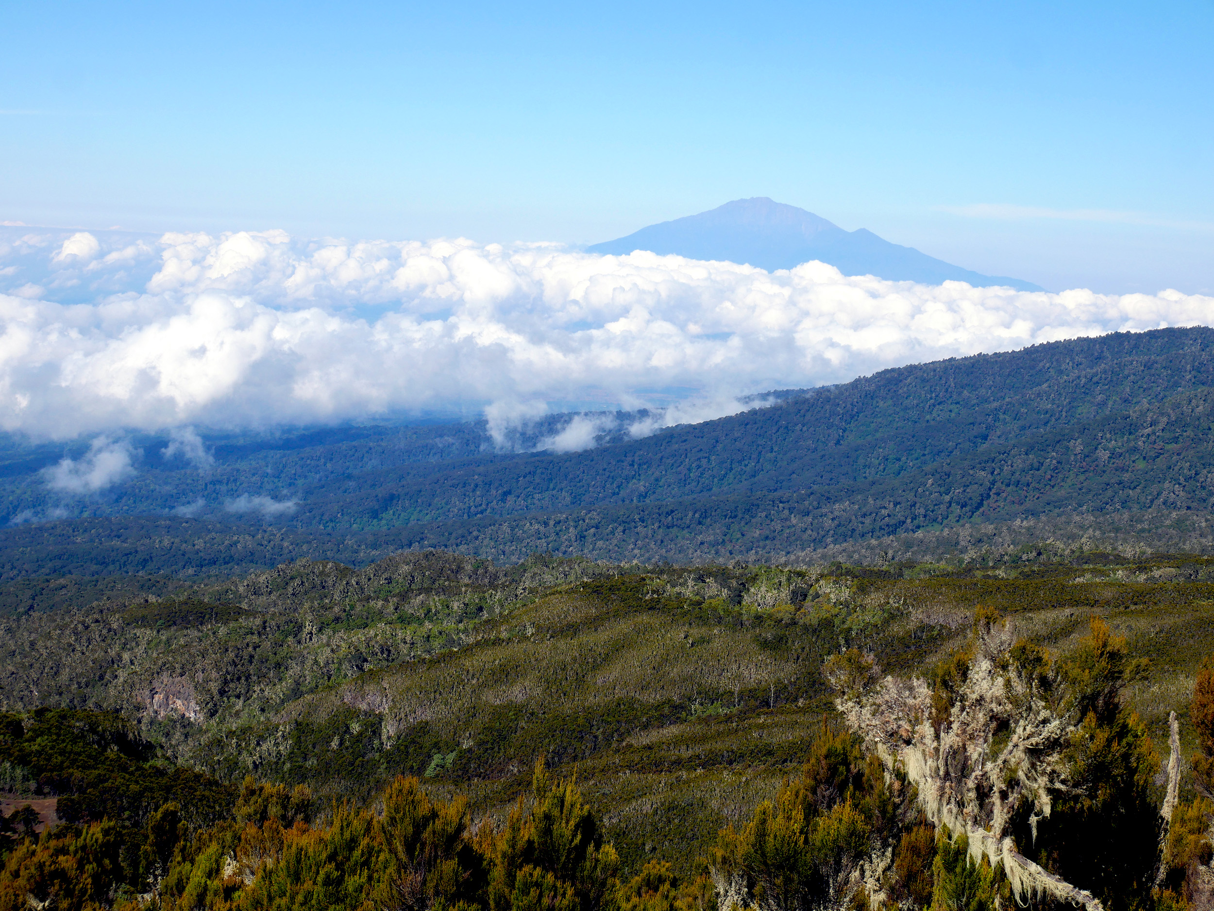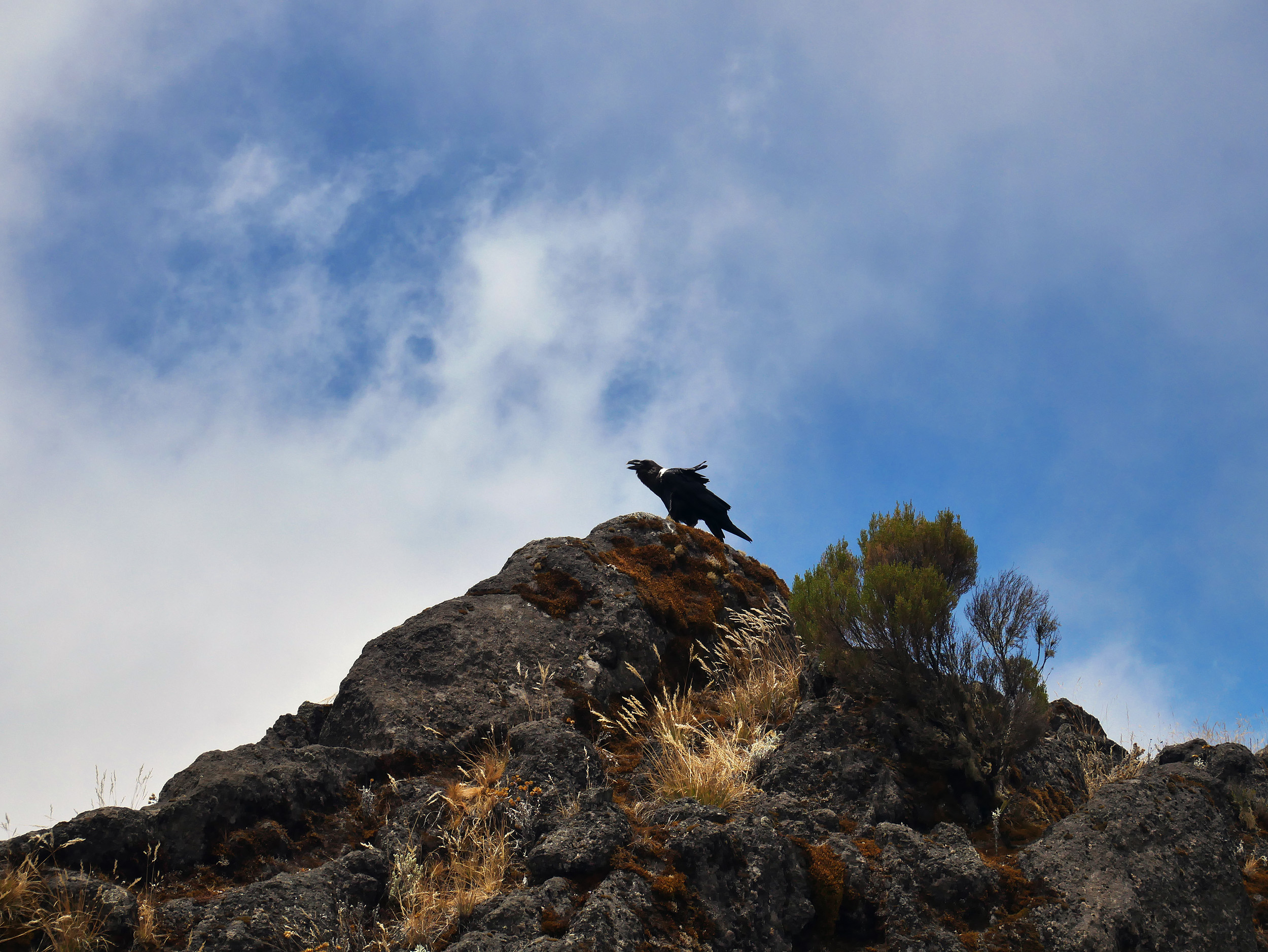 The tree line on Mt. Kilimanjaro extends to over 10,000 feet, so it takes about an hour of hiking from Machame Camp before we’ve gotten above it. Emerging from the depths of the Rainforest, we get our first glimpse of Mount Meru, the continent’s fifth tallest (14,980 ft / 4565 m), and over to our west, the imposing Shira Plateau, from which our next campsite gets its name. We’re now in the Moorland or Heath ecosystem of Kilimanjaro, and the vegetation here is decidedly different. Mosses and lichens cover exposed rock surfaces, succulents of all varieties thrive here, and we get our first introduction to the Plumeless Thistle and the aptly named, Everlasting Flower. At our first break, Vincent, one of our assistant guides, points towards a four-striped mouse, a unique breed that has adapted itself well to these high elevations. Soaring high above us and in striking contrast to the diminutive dimensions of the rodent, are a pair of White-Necked Ravens. Scavengers extraordinaire, they dominate the birdscape in the Moorland and will be a permanent fixture as we climb higher.