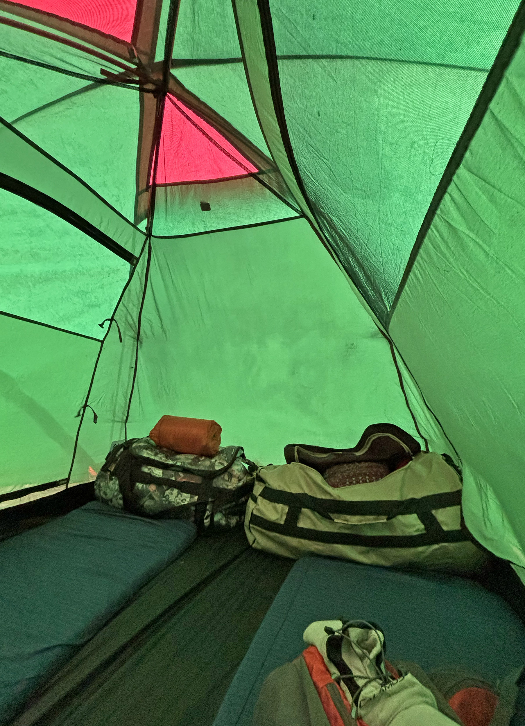 SM and I arrive at camp to find our tent on hopelessly uneven ground, but given that there’s literally no room to negotiate, we improvise somehow. Evening tea is accompanied by an ethereal light show, with the clouds parting just in time for magic hour, and the silhouette of Mt. Meru helping frame a perfect sunset.