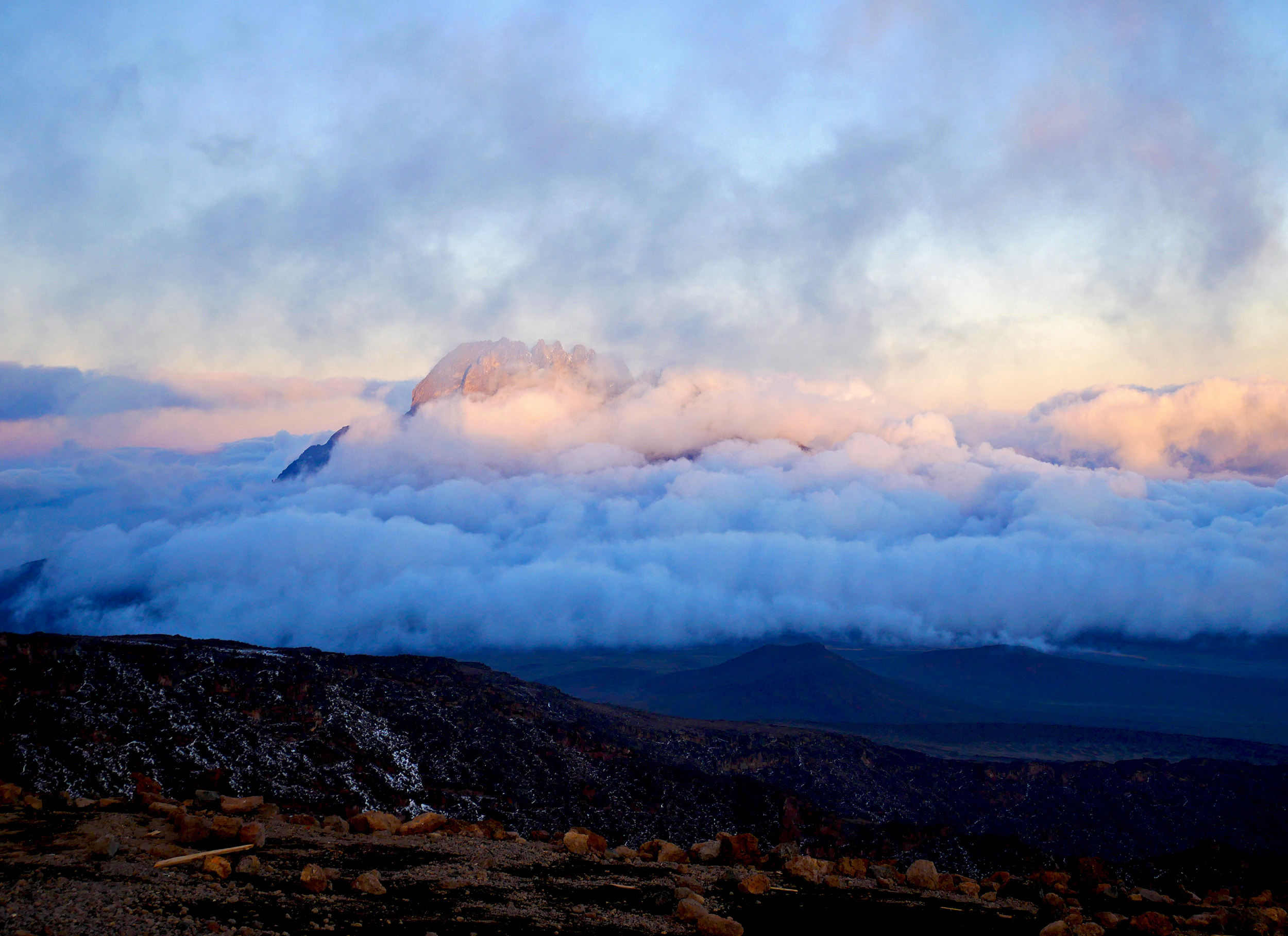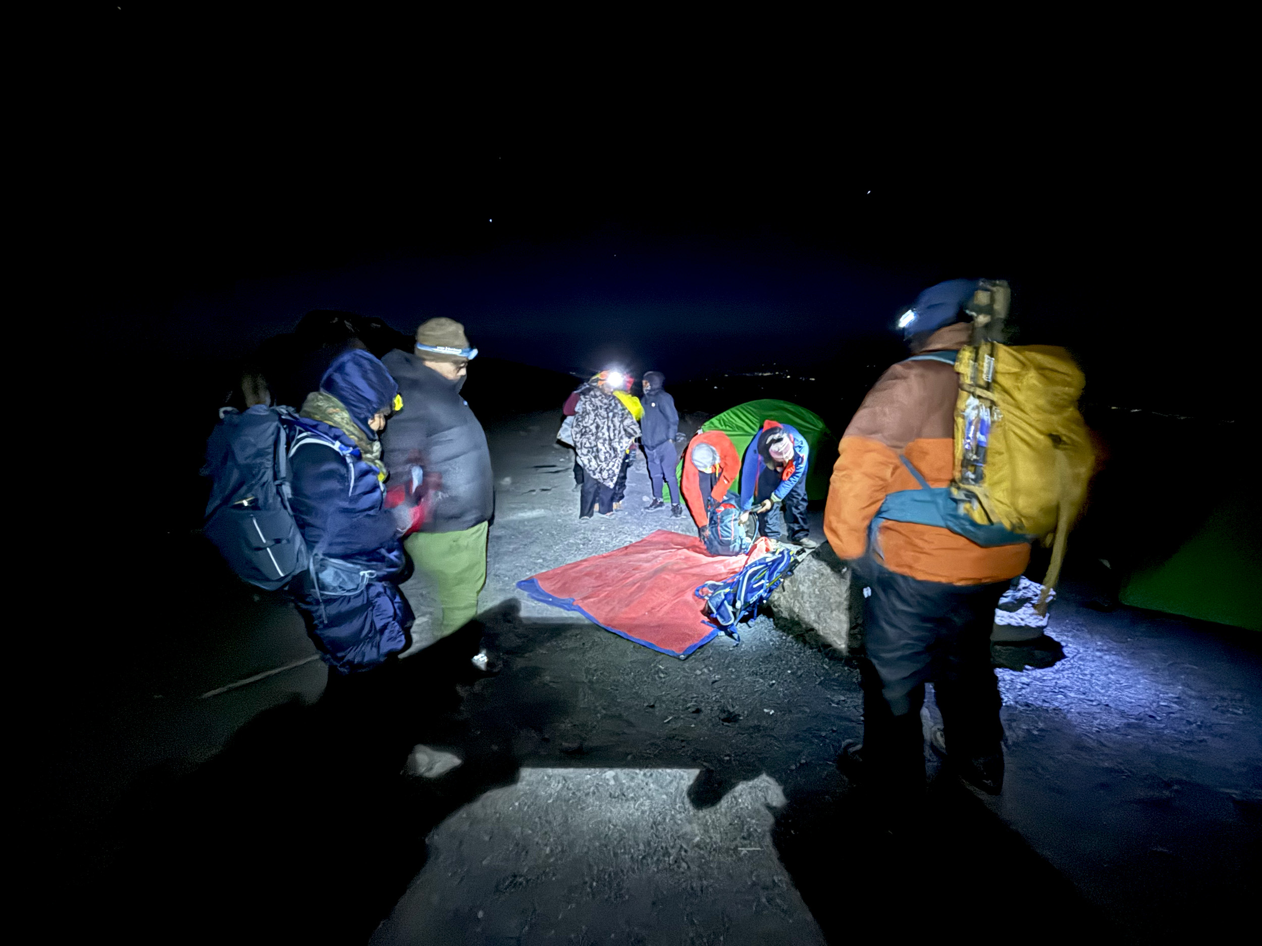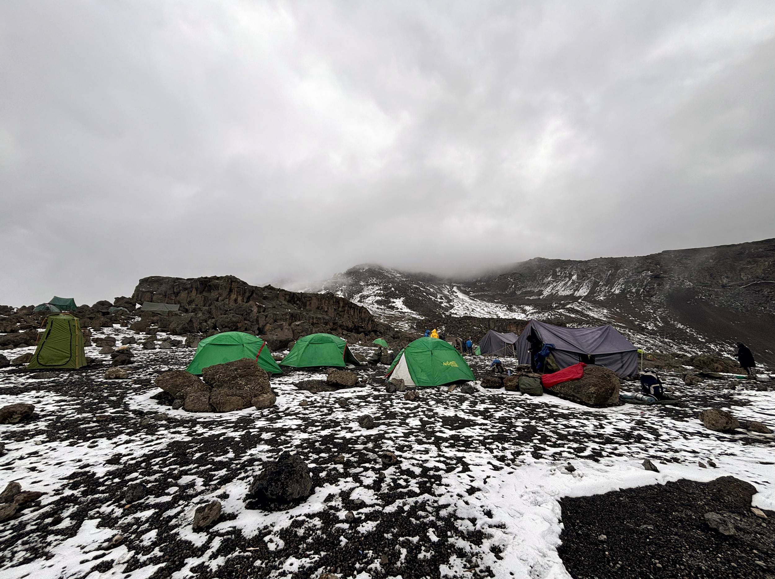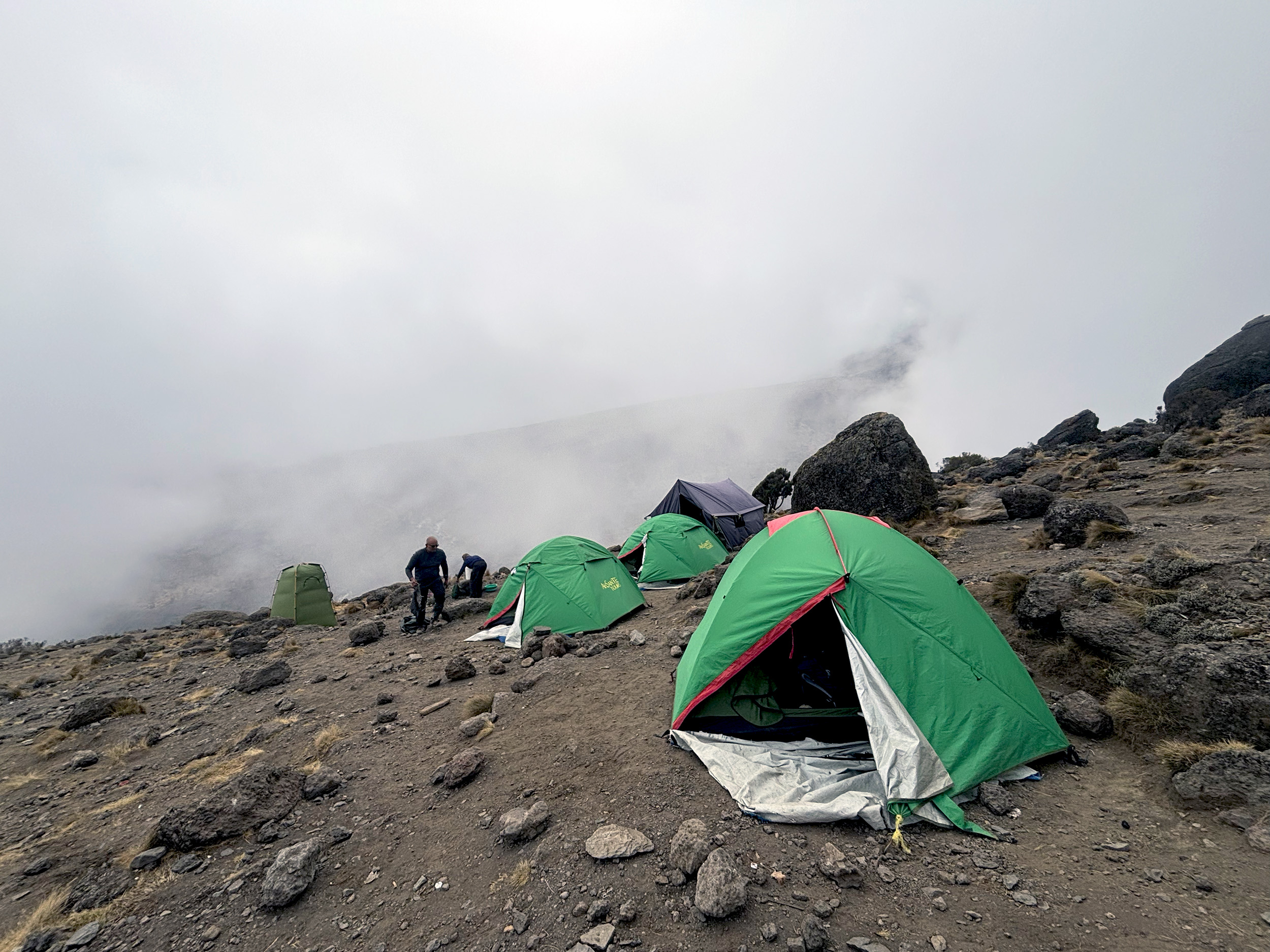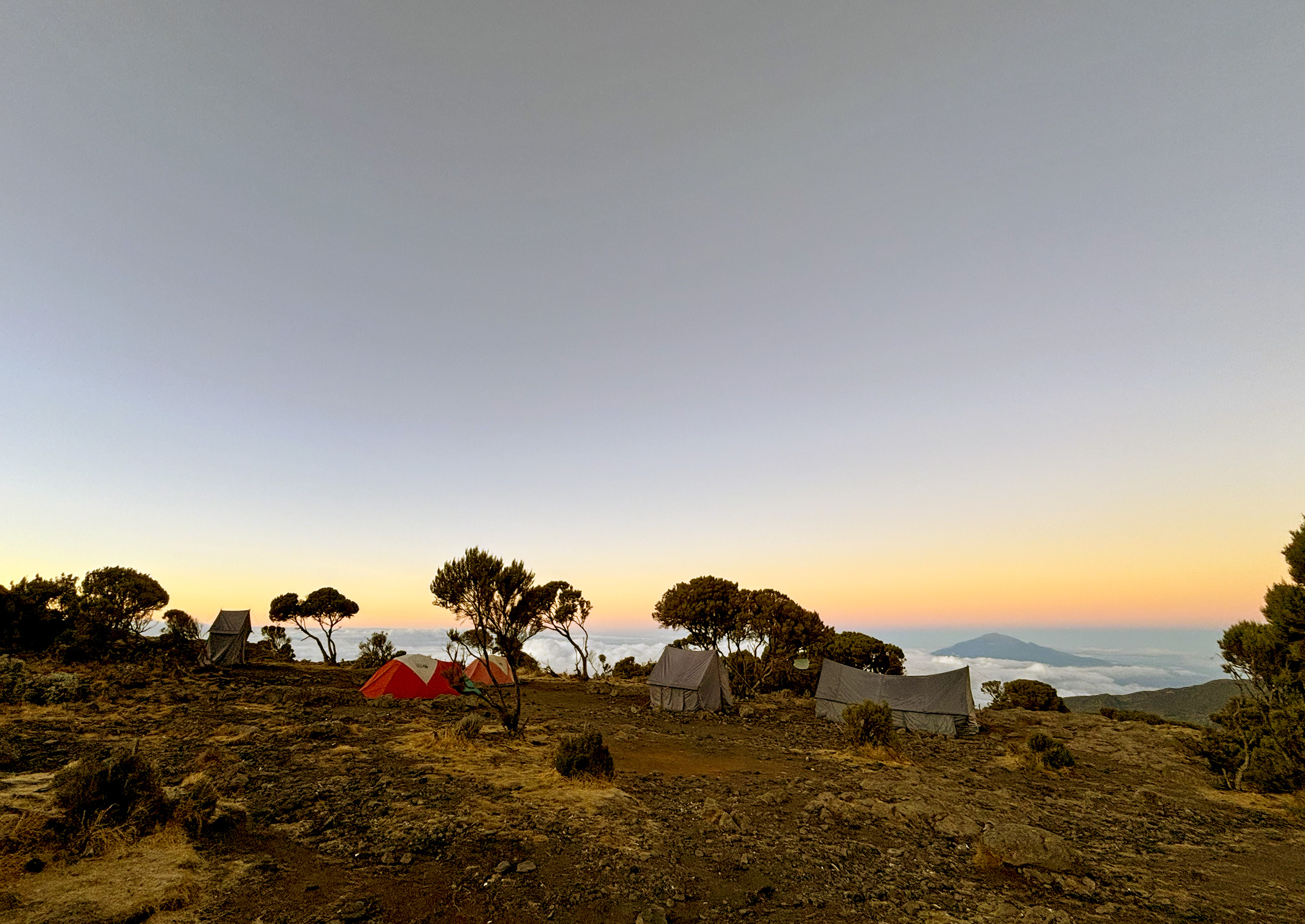 A light lunch of chicken stew and cheese toasties is washed down with ginger tea, and that is followed by a compulsory nap, but sleep at this altitude is fleeting. Pottering around the campsite just prior to dinner, I’m rewarded with a truly mesmerizing cloud show, and a brief reveal of majestic Mawenzi, Kilimanjaro’s second highest peak. Dinner at 6 pm is on the early side today, and is a simple affair of pasta and red sauce. Over another flask of ginger tea, Michael briefs us on the summit ascent and introduces us to our summit porters. Readings our taken. O2 levels have dropped across the board. We’re also unanimously miserable in the cold. Wake up call is in three hours so it’s lights out by 8 pm.