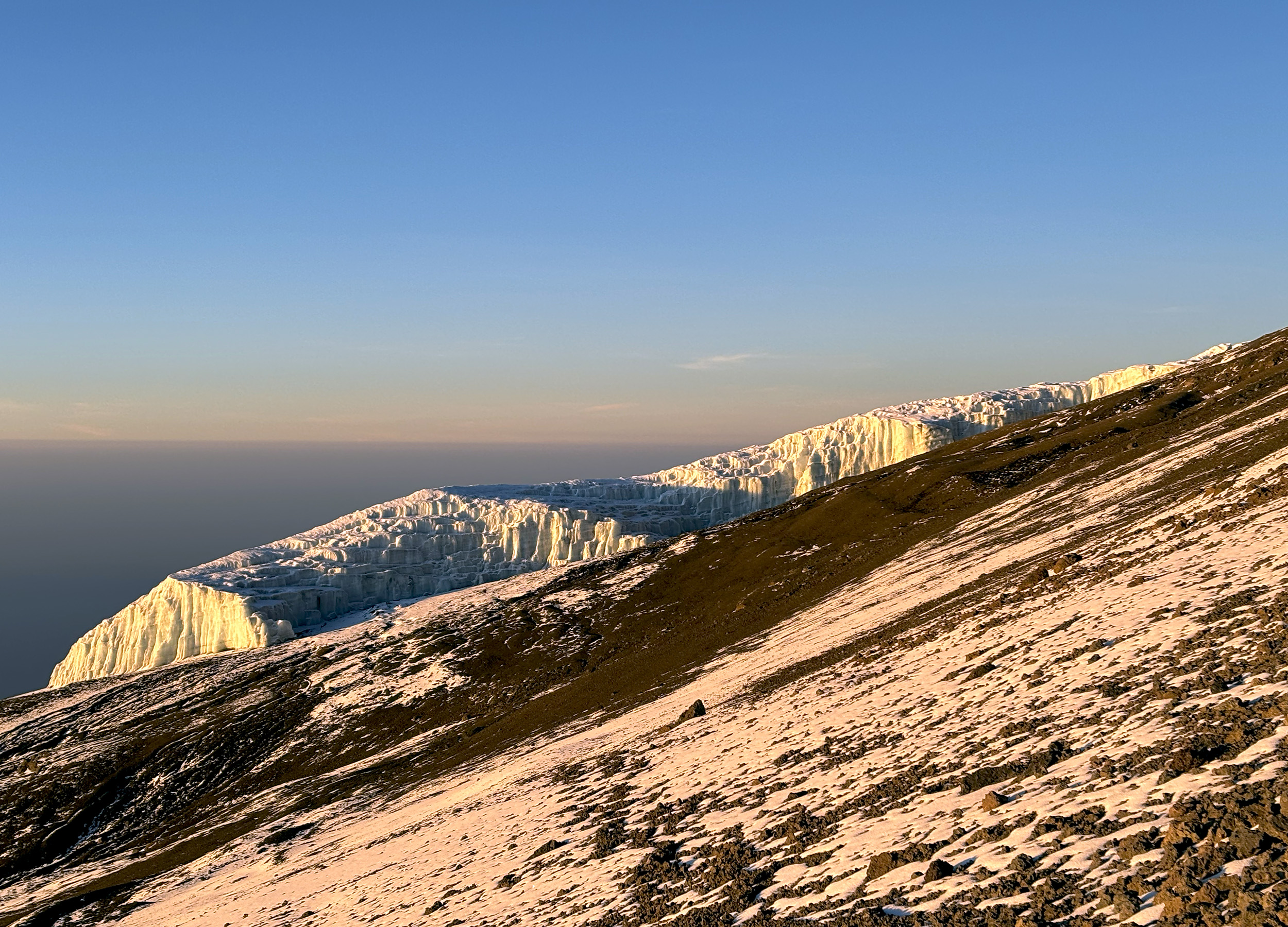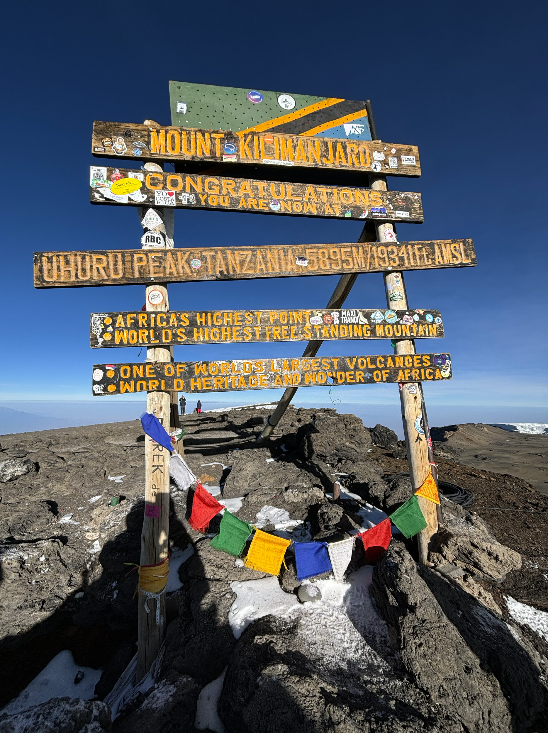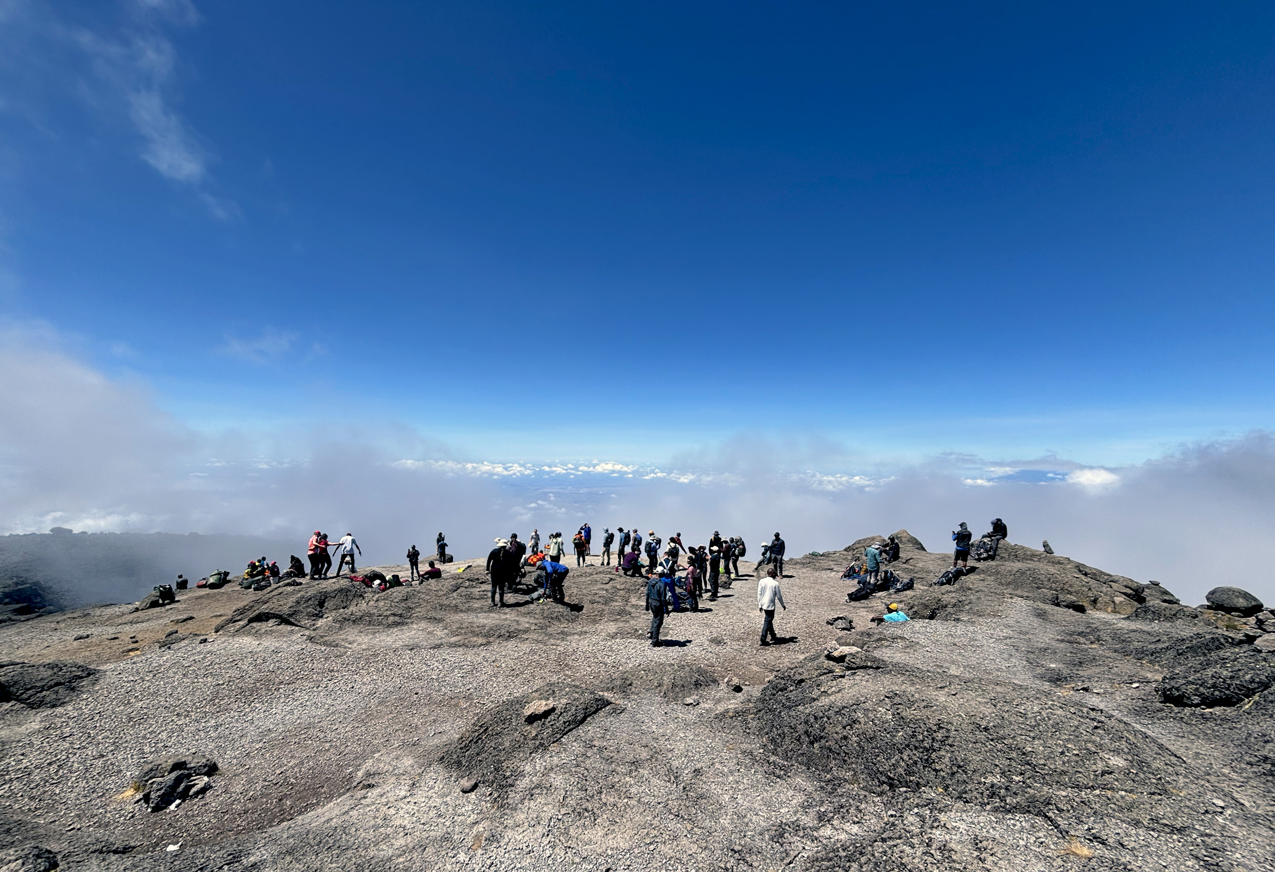 Uhuru Peak, now discernible in the distance, is the highest point on Mount Kilimanjaro, and is also located on the rim of Kibo Crater, making the last mile or so from Stella Point relatively flat. The most impressive sight on this stretch is the imposing southern icefield, overshadowing Mawenzi, and even Mount Meru in the distance. I was certainly not expecting to see so much snow or ice here. But the glaciers on Kilimanjaro are in rapid retreat, the mountain having lost over 80% of its ice mass in the last century alone, and it’s anyone’s guess how long this stunning view would remain. Before we know it, we’re standing in a long queue, waiting for our group photo to be taken against the official sign for Uhuru Peak. It’s 0710 East African Time. We’ve made it to the summit.