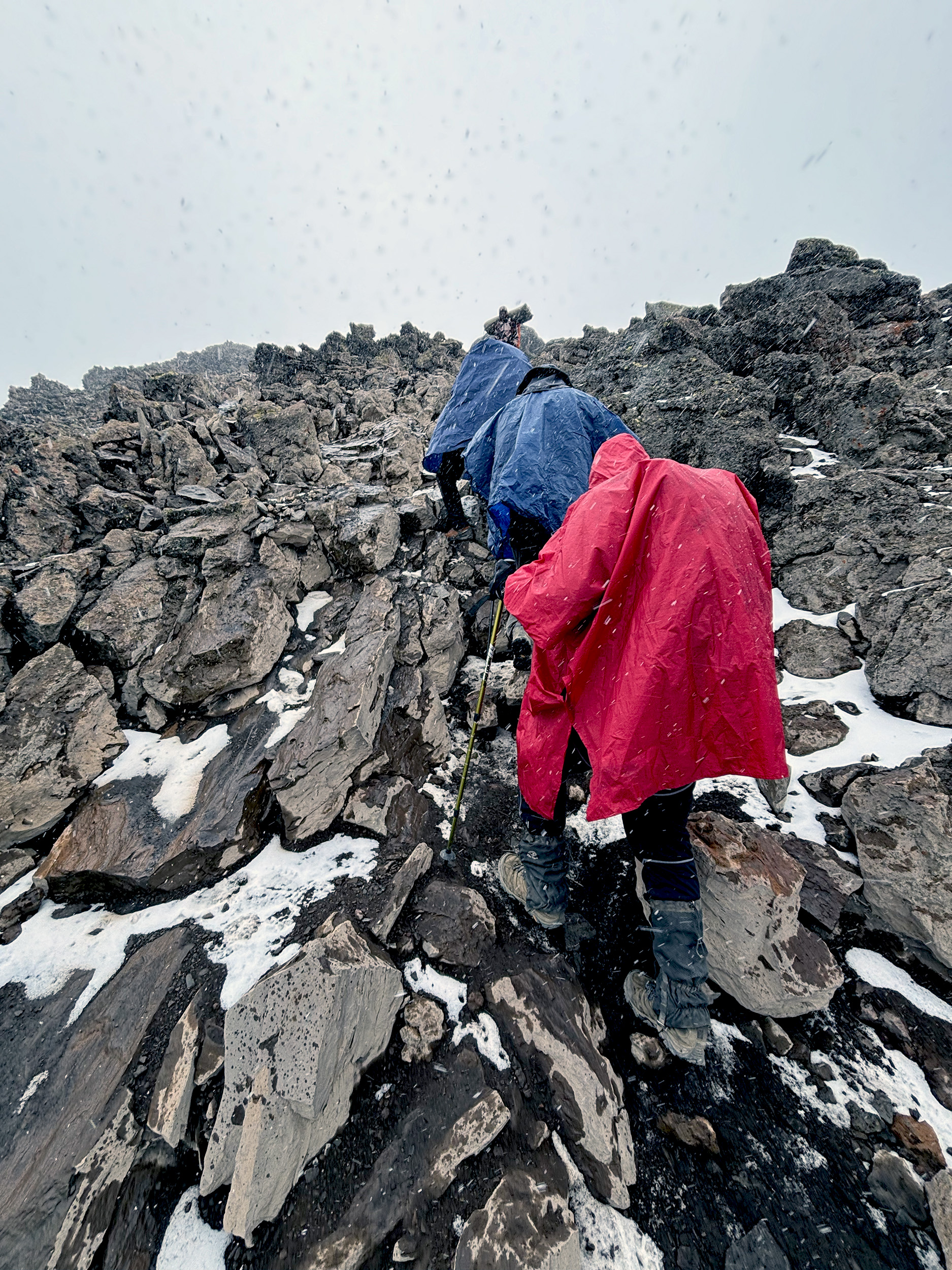 Coming up on Barafu Camp, the weather takes a turn for the worse with hail and high winds. If you lived here, you’d be home by now, AS reminds us, as we file past the sprawling campsite. Unlike everyone else finishing the day at Barafu, our group is climbing an additional 700-feet, along a dauntingly steep path to Kosovo, a higher basecamp that requires advance permits and an additional fee. The mountainsides are already covered with the white stuff as we inch further, and soon enough the hail turns into full blown snow; the precipitation accompanying us till our campsite is reached. Conditions at Kosovo, sitting just shy of 16,000 feet, can only be described as hostile.