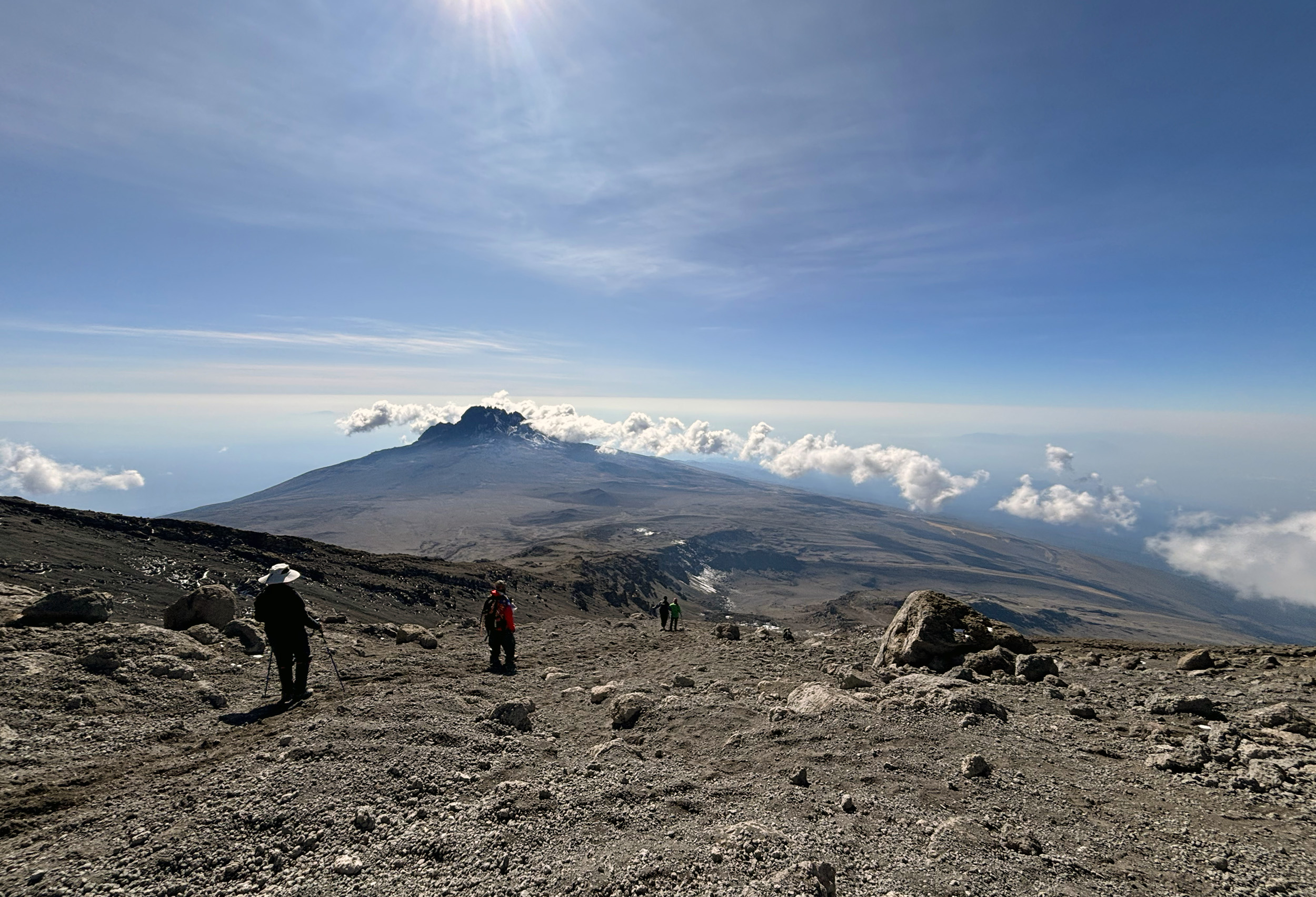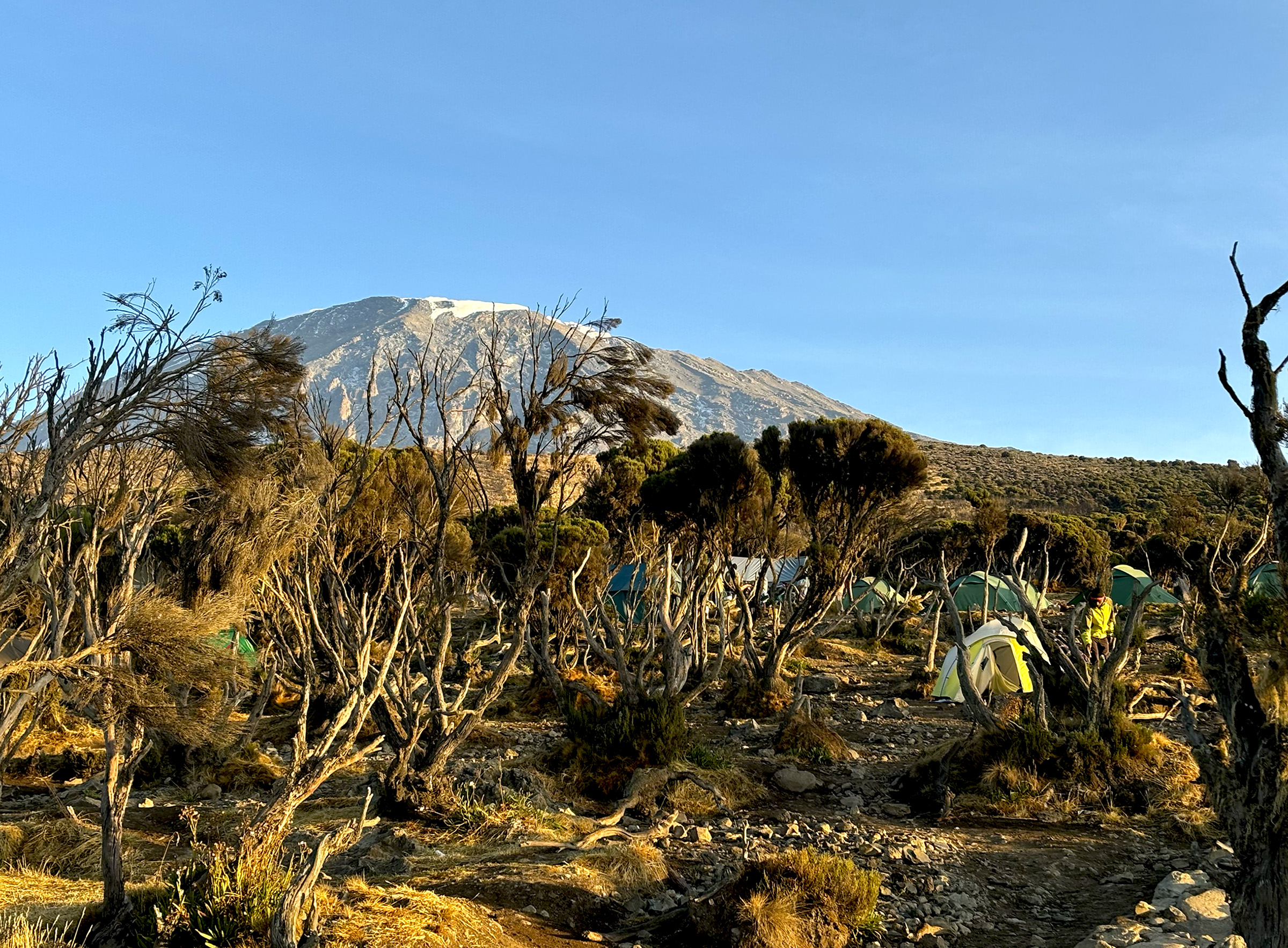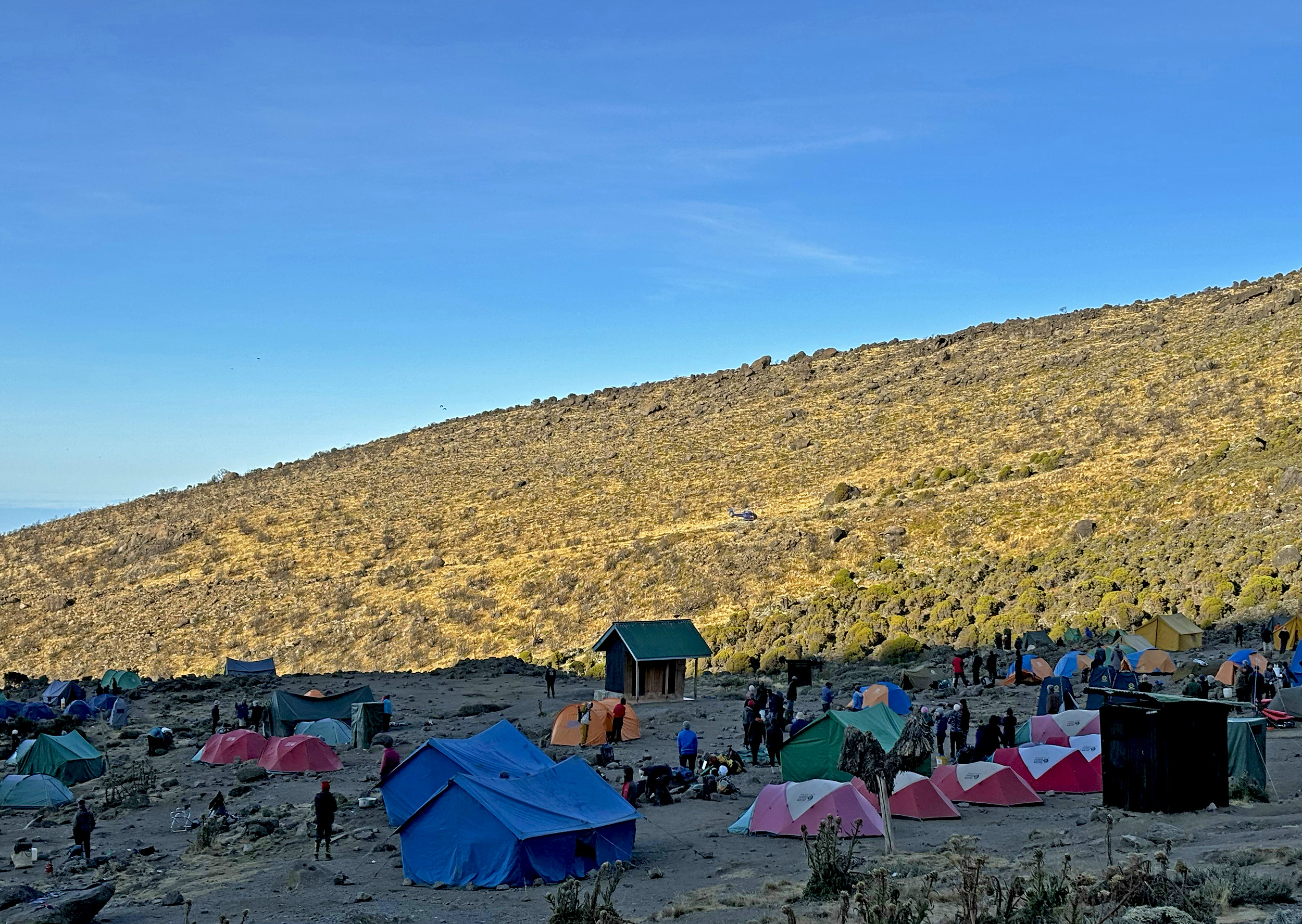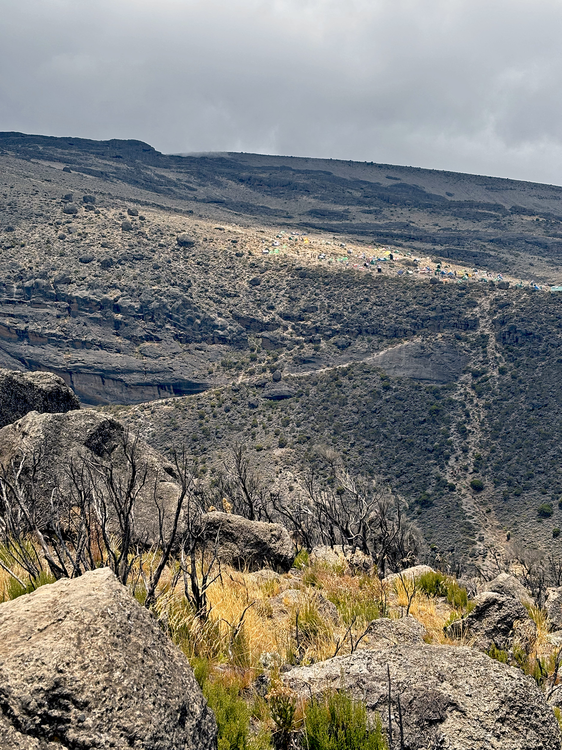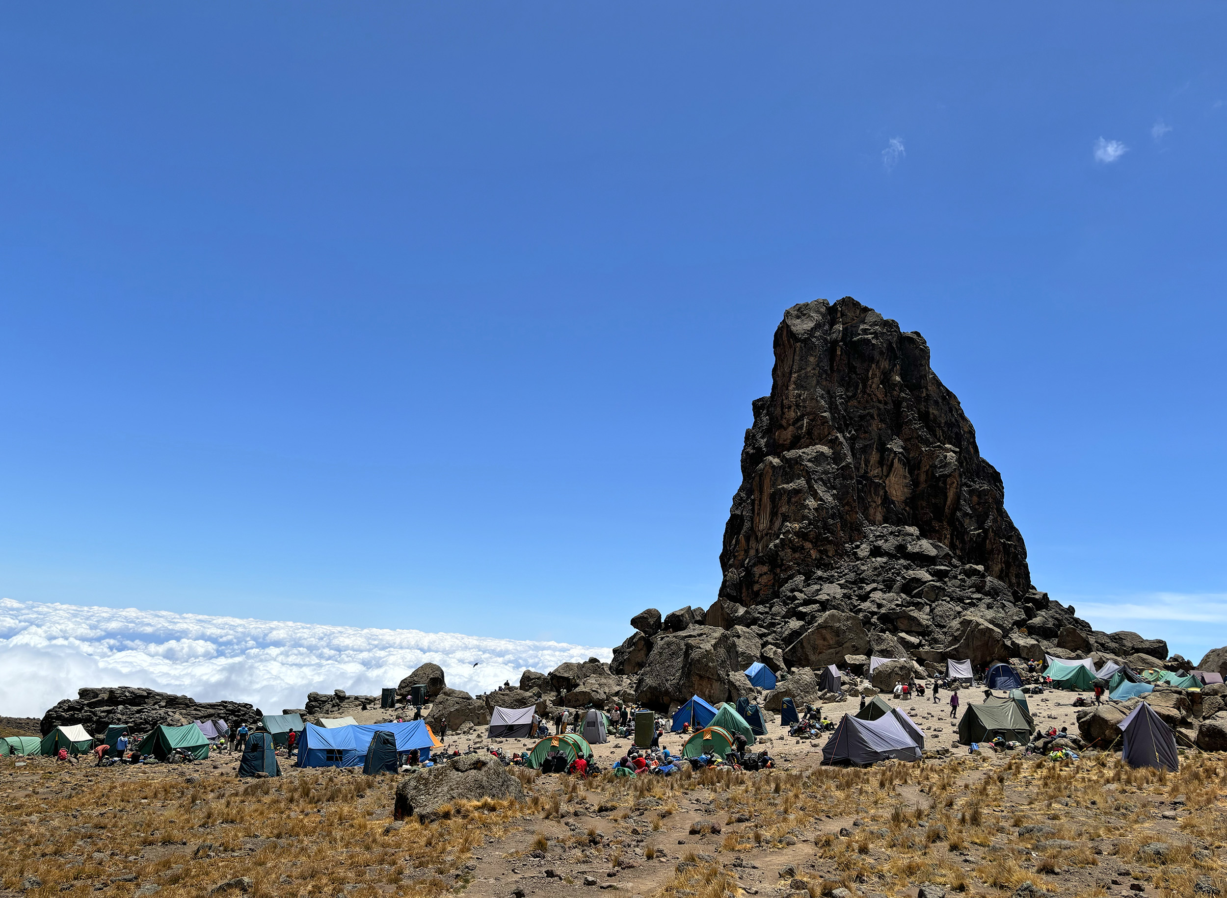 Approaching it from the west, we get our first clear look at the Kilimanjaro massif, its crater rim easily discernible. Two rest stops down and we can see the Lemosho route in the distance about to merge with ours. The trail is now a lot more crowded. Ahead lies Lava Tower, a hard to miss geological formation, and a major landmark on Kilimanjaro. While no one actually camps there, it’s where climbers on the Machame, Lemosho and Northern Circuit routes typically break for lunch, and expectedly, the campsite is teeming with kitchen and mess tents. At 15,200 feet, we can most certainly feel the altitude here, and the 90-minute break for lunch is well appreciated.