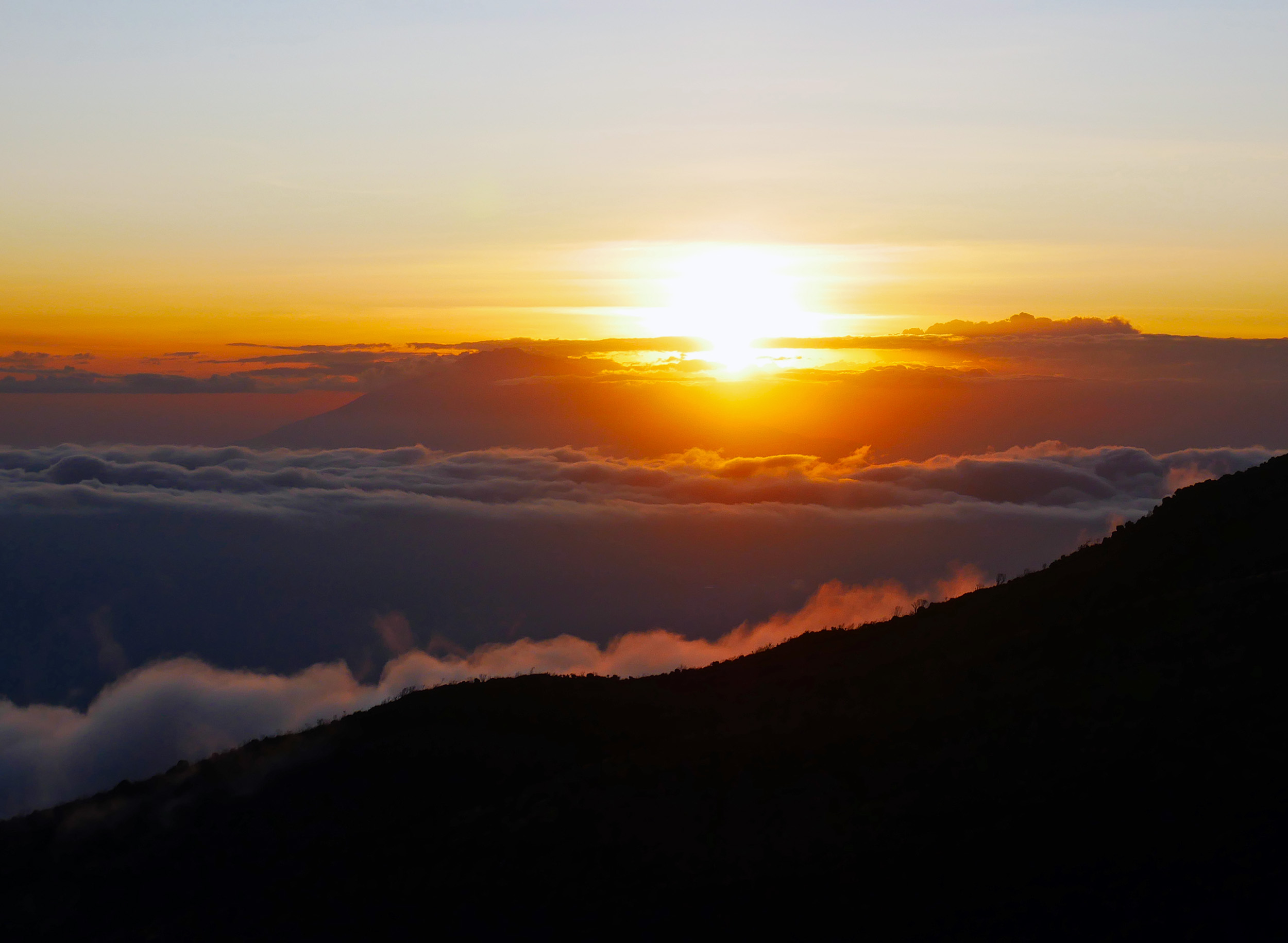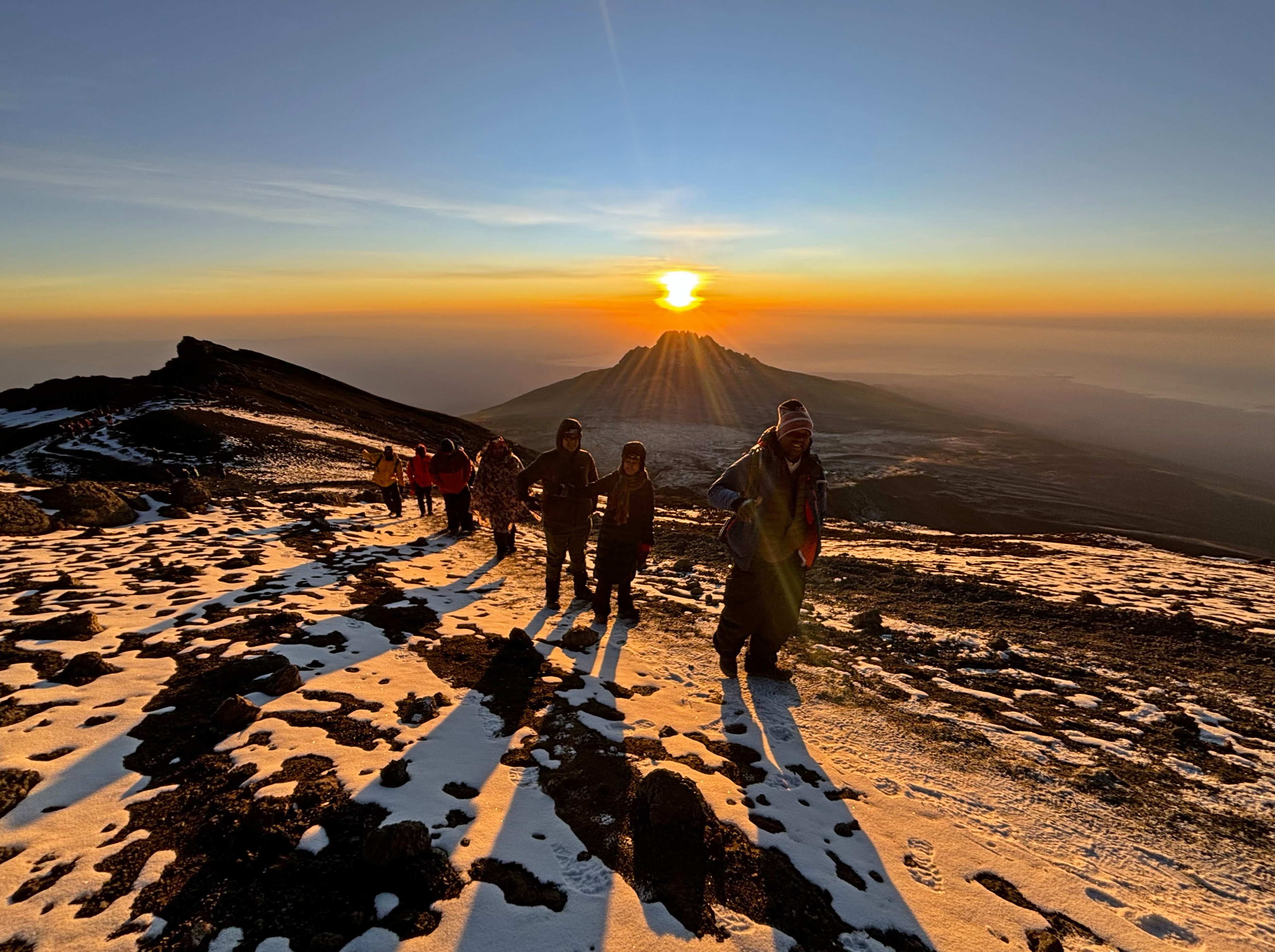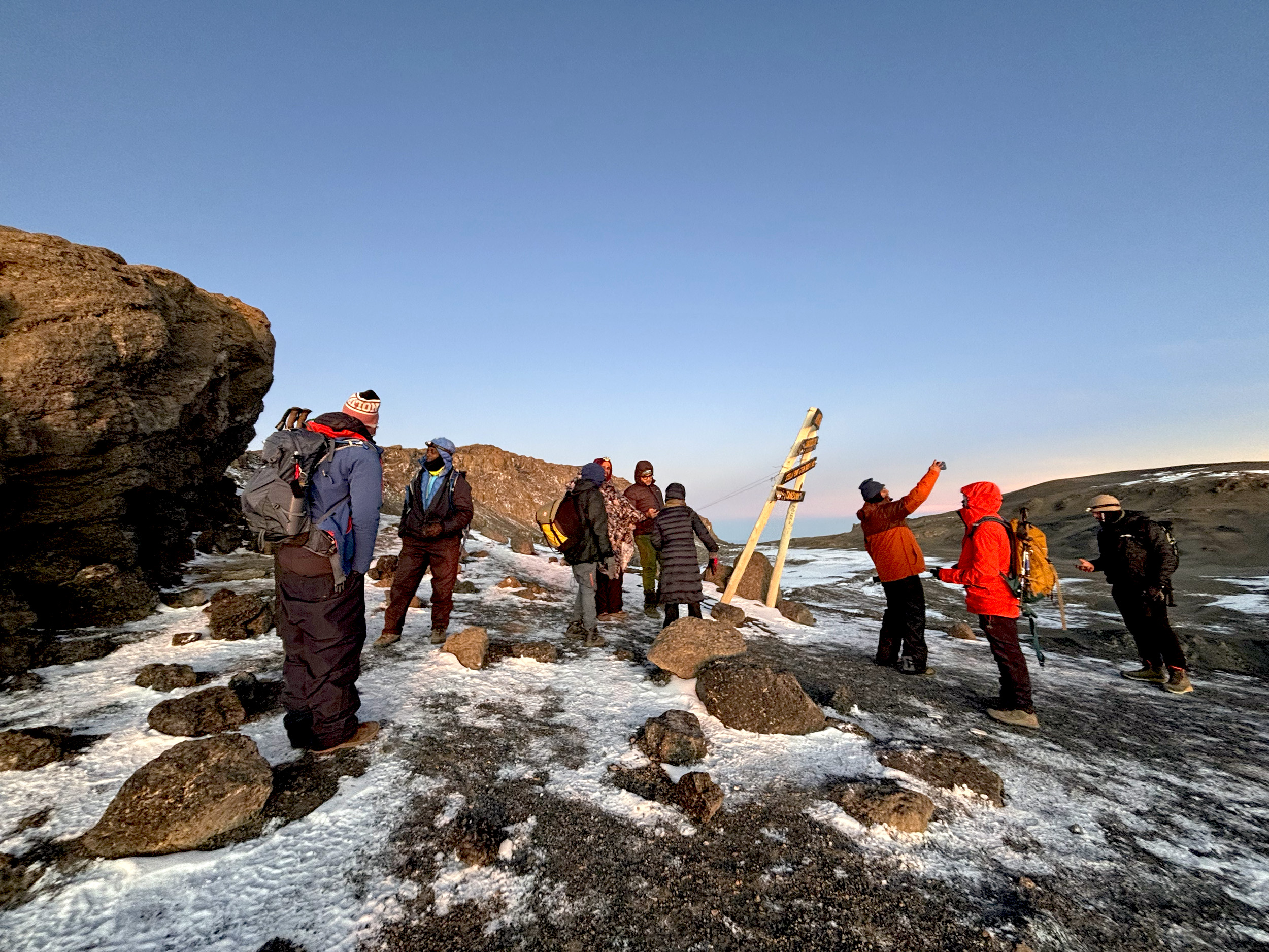 Michael calls for a brief halt at 4 am. One of our summit porters hands out mugs, and before we know it we’re sipping on steaming ginger tea. It’s hard to describe just how comforting that is. Not long after, the very faint silhouette of Mawenzi’s craggy peak becomes visible to us, becoming a lot more distinct as we climb higher. Things are finally looking up. Dawn is around the corner, and the early morning light is beginning to paint the landscape in striking hues. Located at the edge of Kilimanjaro’s crater rim, Stella Point (18,885 ft / 5756 m) is reached at 0604, just as that fiery ball emerges for the first time above Mawenzi Peak. We’re still an hour away from the summit, but the moment is nevertheless euphoric.