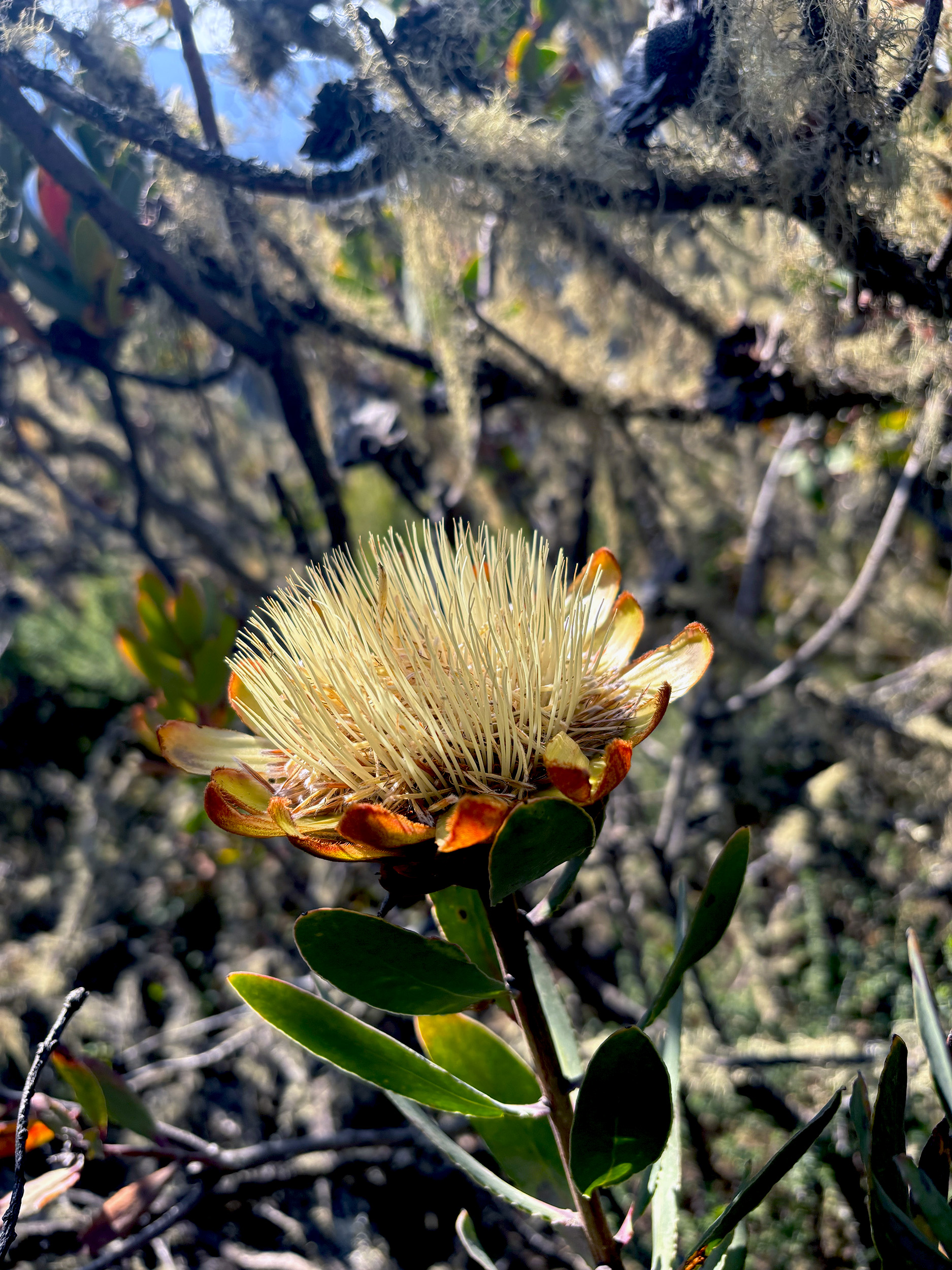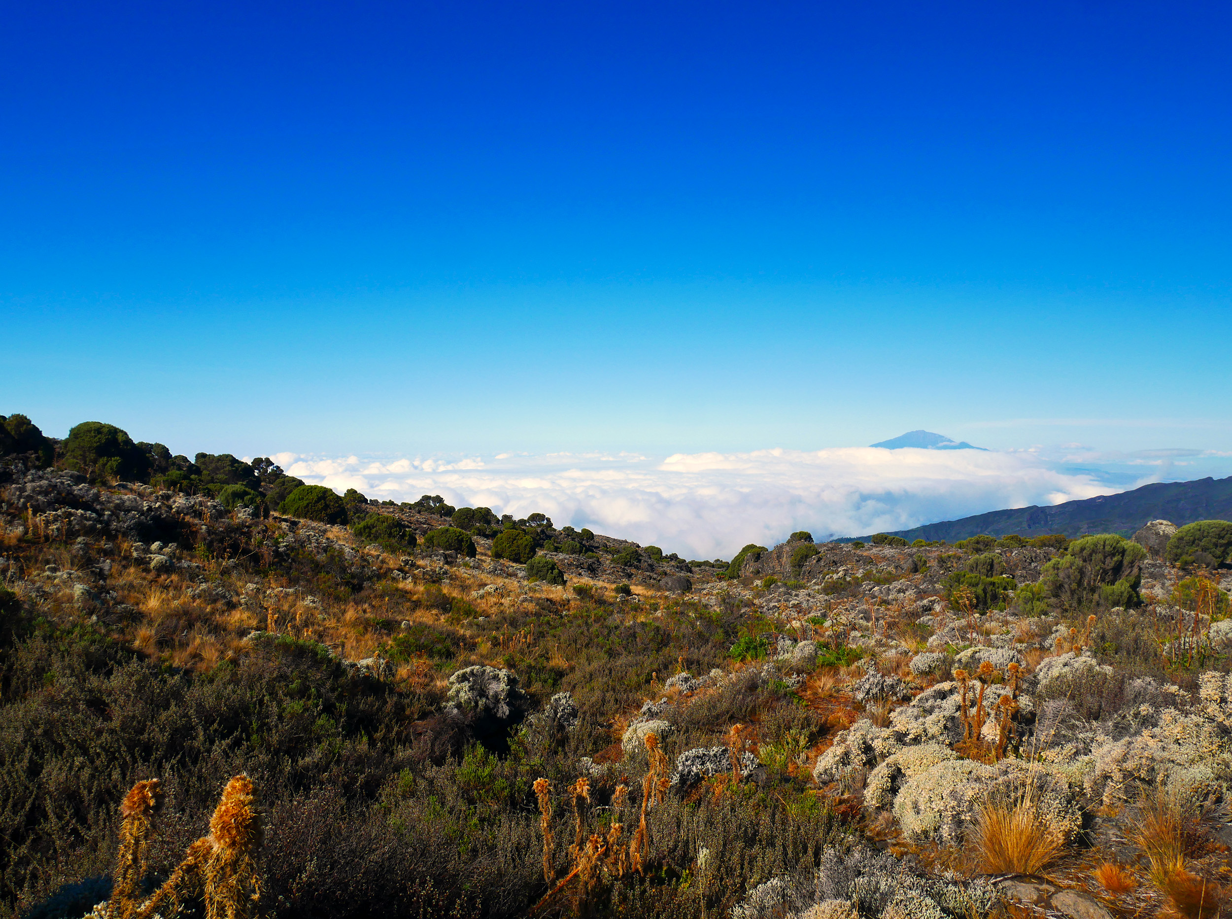 We have five hours of walking ahead of us this morning, and an elevation drop of almost seven thousand feet. Of that, the first two hours or so are expected to be rocky, but Michael promises it won’t be as bad as yesterday. My knees will surely be the judge of that. As we descend slowly through the Moorland, we’re treated to some fabulous views of the thick carpet of green that lies ahead. While vegetation at this altitude is sparse, there’s still plenty to keep an eye out for, as Vincent proves, pointing our attention towards the exquisite Protea Kilimandscharica. Unique to the Moorland of Kilimanjaro, it’s one of the oldest species of flowering plants, and one that we had missed entirely on our ascent.