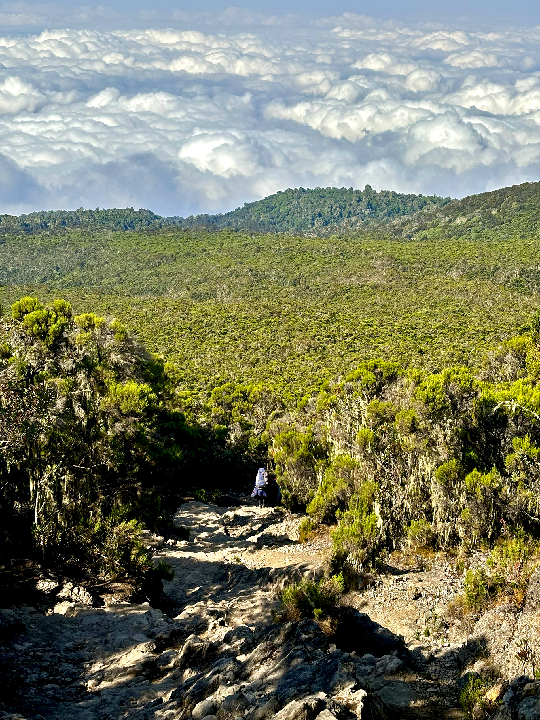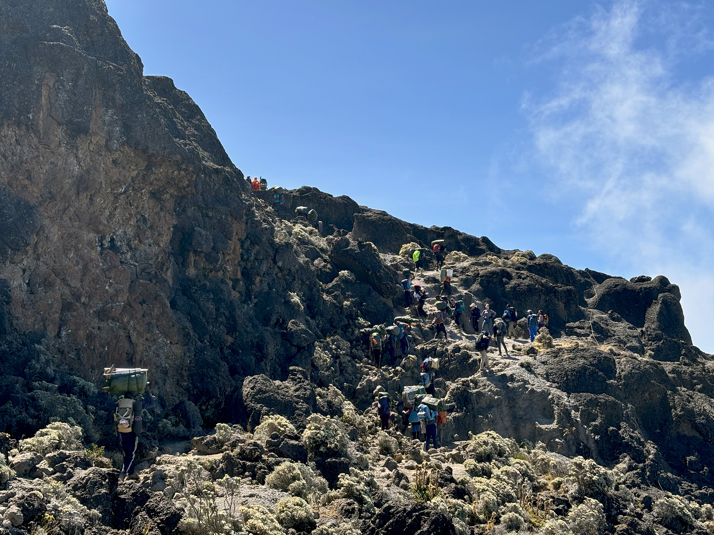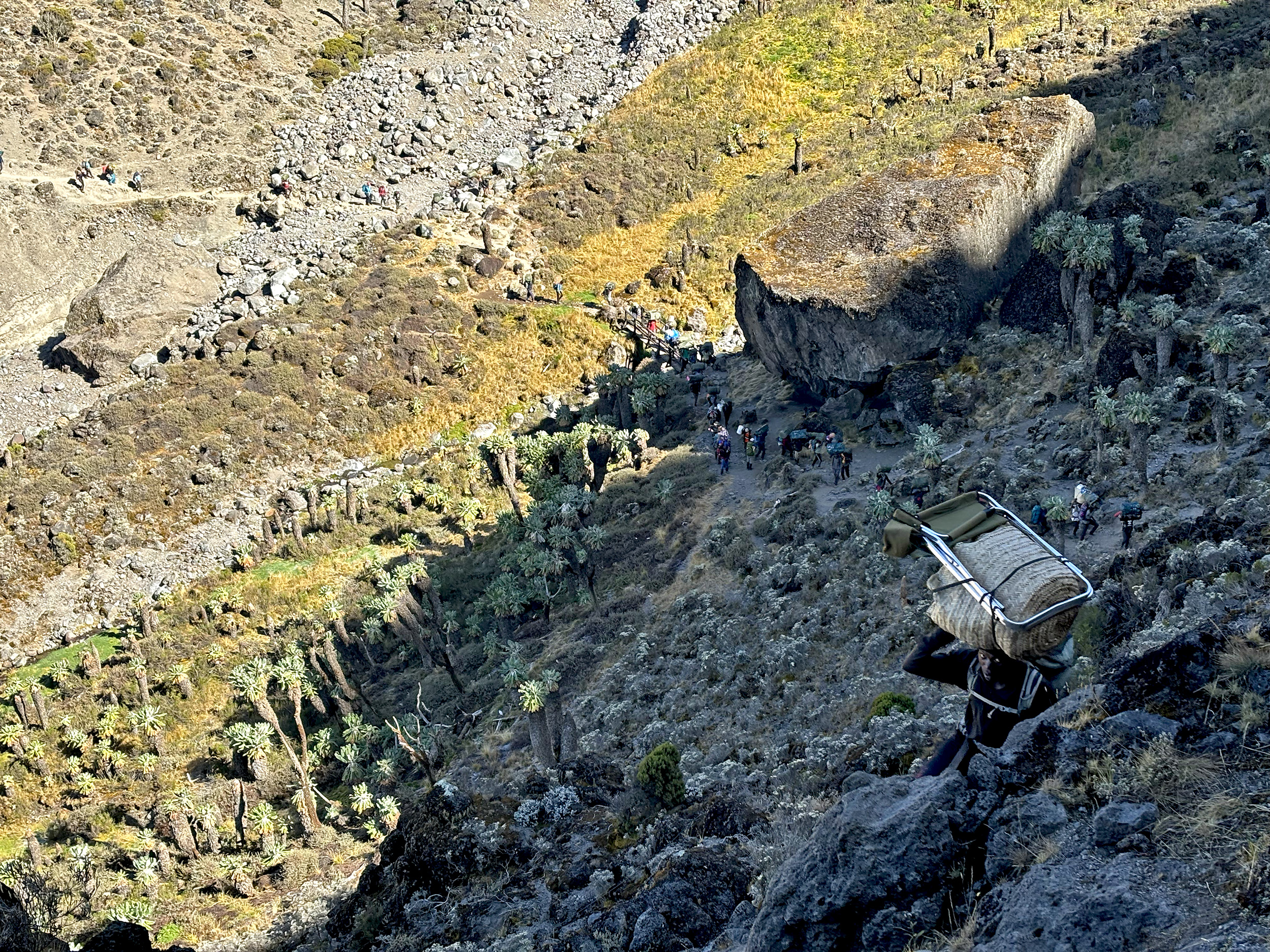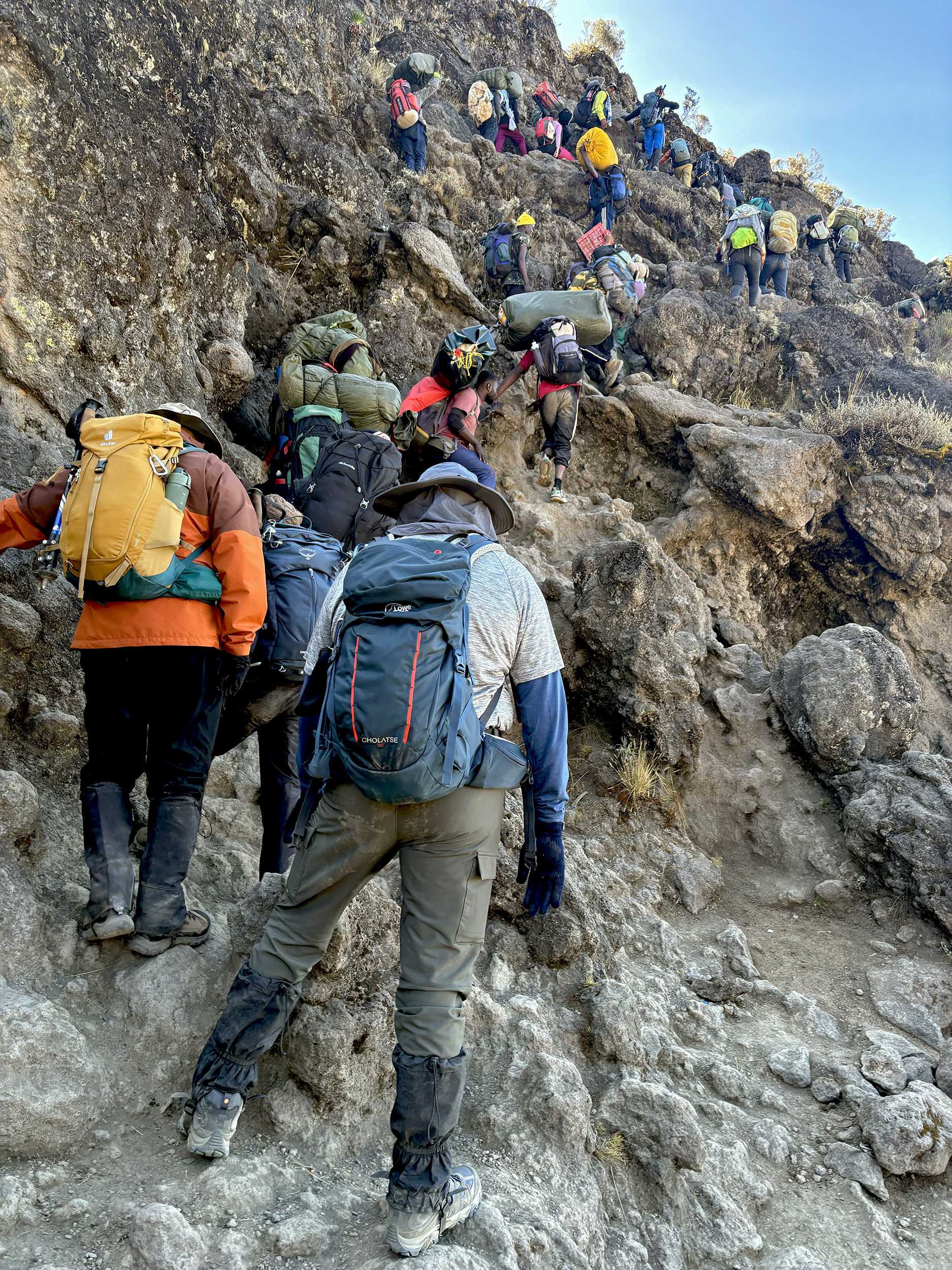 Half way up the wall, during a brief pause, we get a chance to look back at all we’ve gained. Baranco Camp, cleared of its coterie by now, wears a deserted look. As we ponder the remainder of the near vertical ascent, porters laden with supplies four times the weight of our backpacks whizz right past. A solid two-hour effort finally gets us through, and with that comes a longer break, with the added benefit of being above the clouds.