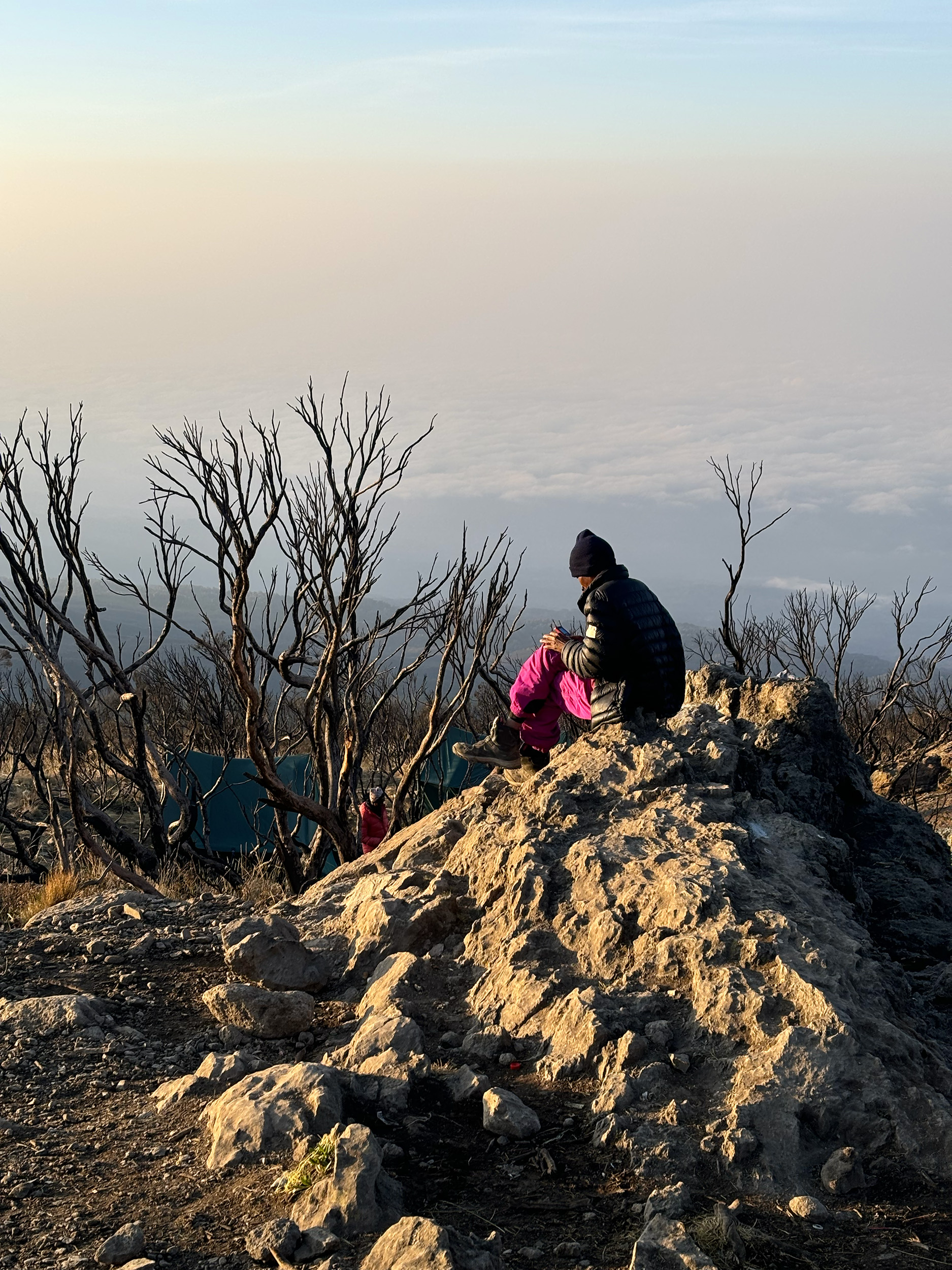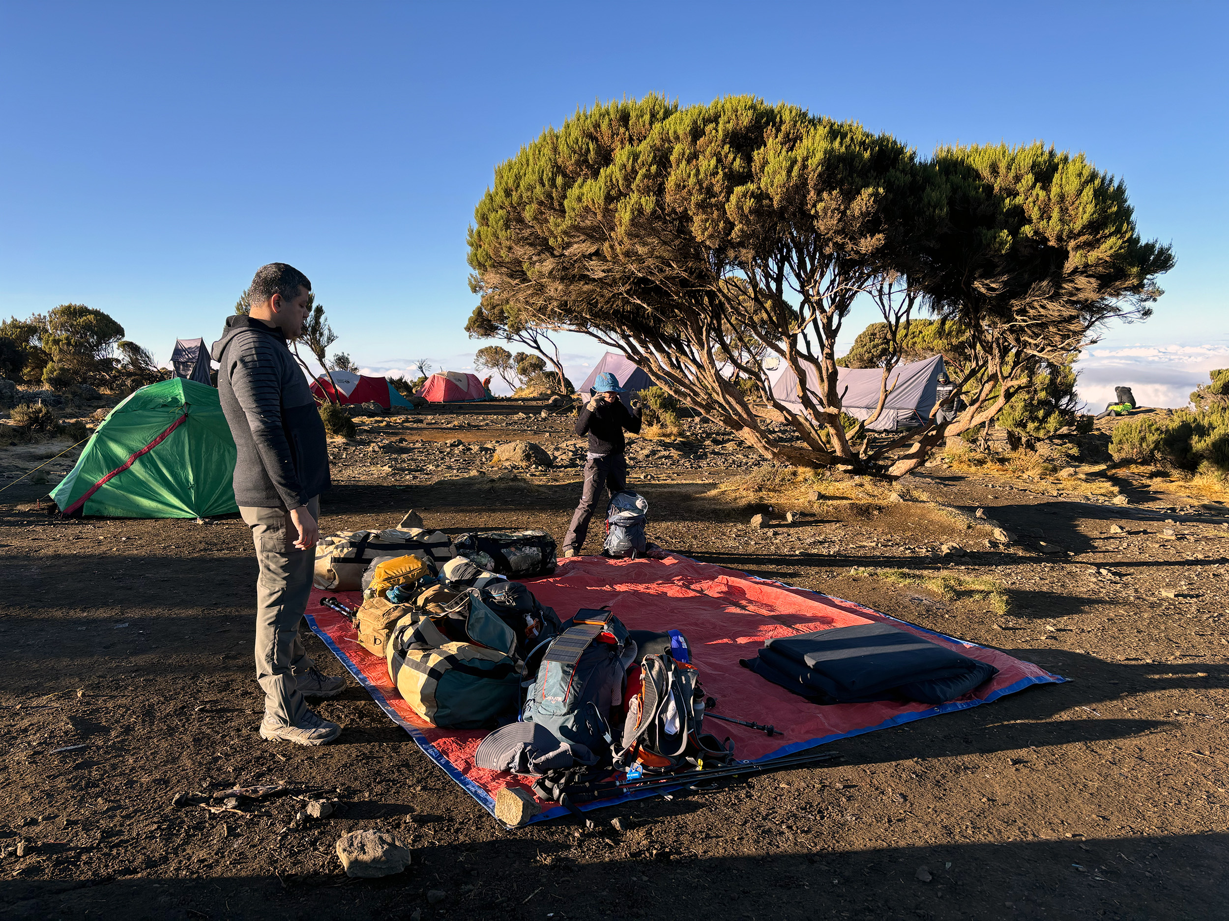 The headache has subsided, thankfully, and this morning’s readings by Michael confirm a slight uptick on my O2 levels. SM continues to crush it, no surprises there. As US and I soak up views of the plains below, the morning calm is shattered by the sound of a helicopter. It’s the first air evacuation we’re witnessing, and a sobering moment for everyone at camp.