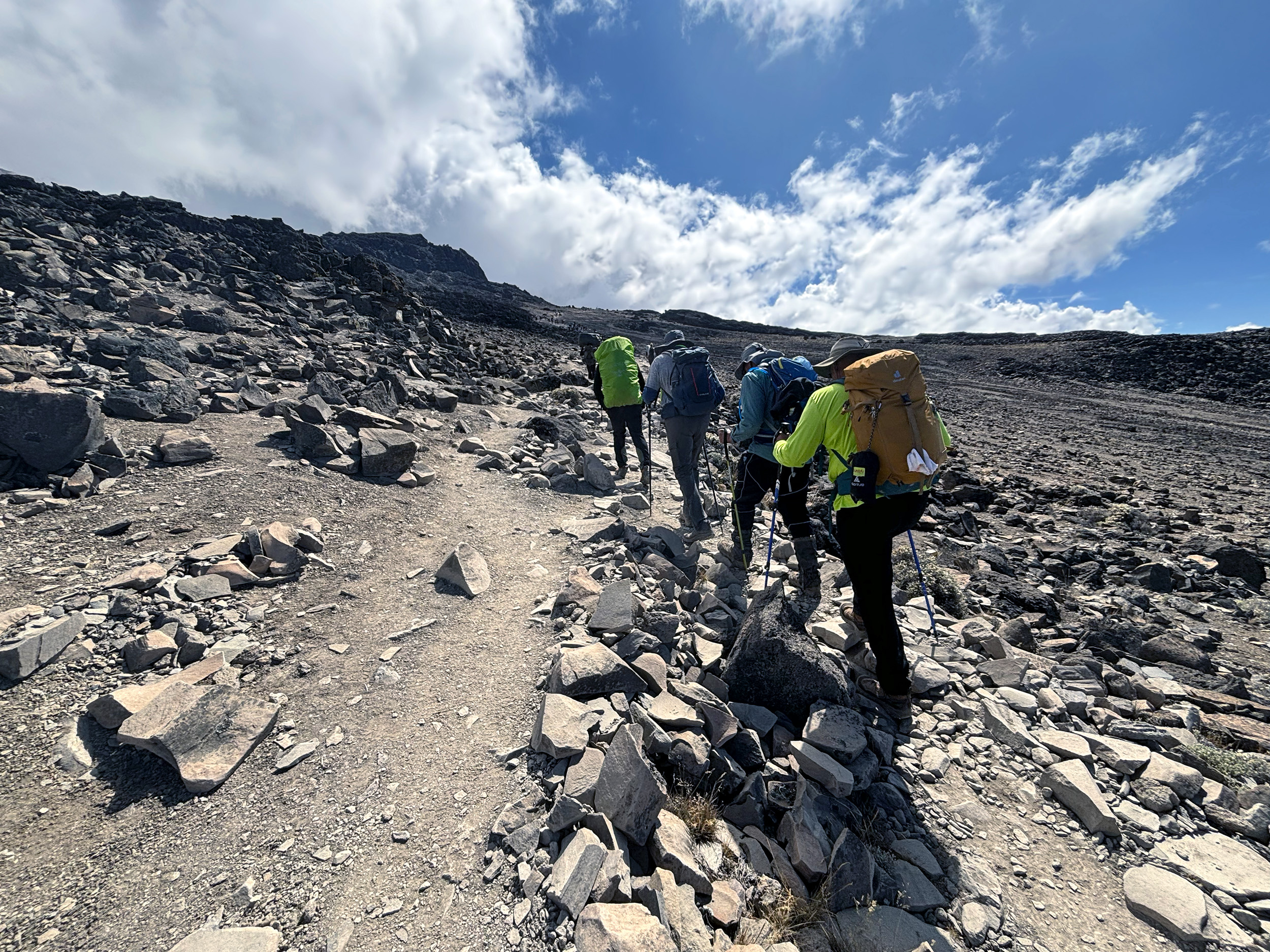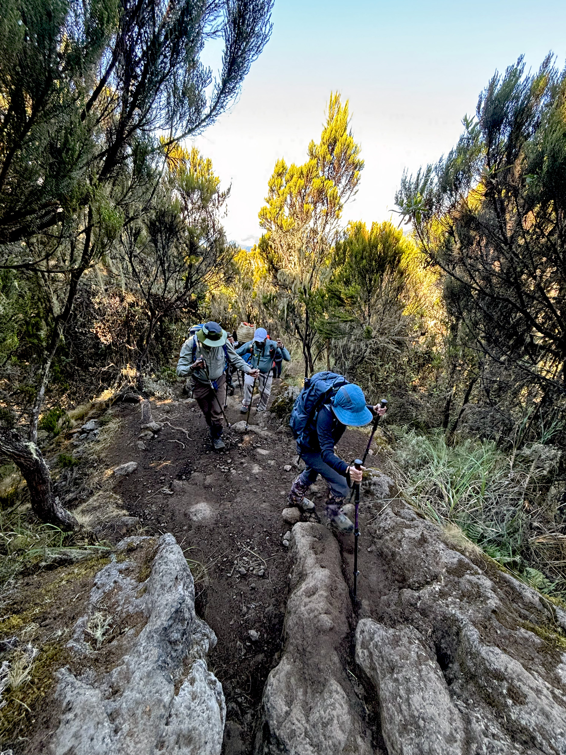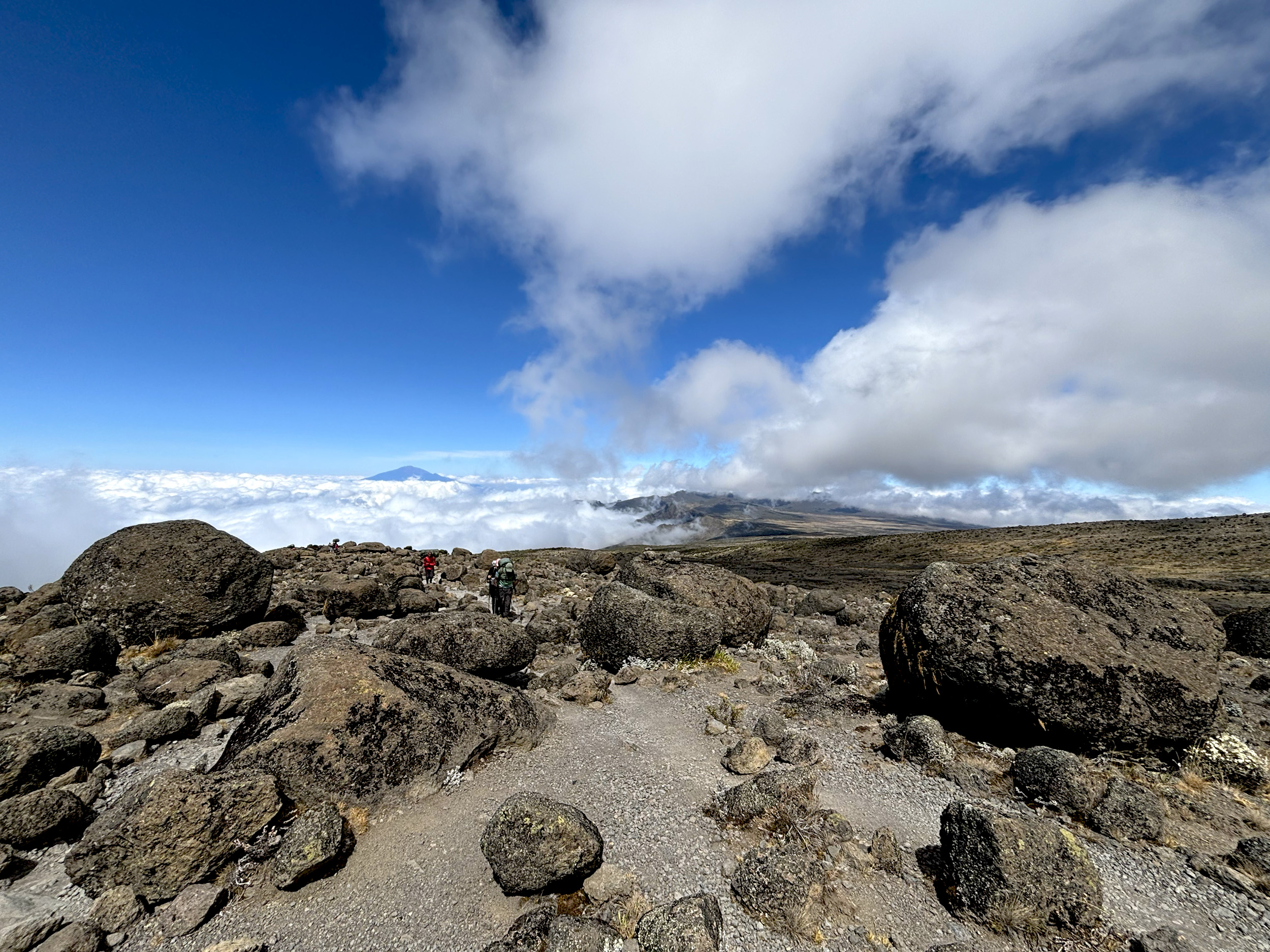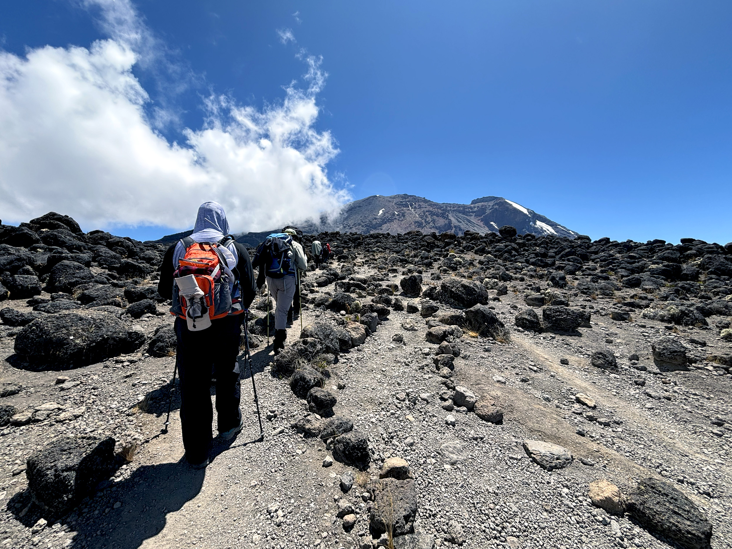 We have our gaiters on today, and have also been advised the use of our trekking poles. The last two days, we’ve had Pascal, our other assistant guide, and Vincent, alternating in the lead, but today, Michael, our head guide, is in charge. Day 3 is a crucial one, a dry run of sorts for summit night, with us climbing higher but sleeping lower. We’re also going to transition into the third of Kilimanjaro’s ecosystems, the Alpine Desert, a harsher environment than anything we’ve experienced so far. Where little shrubs account for the only vegetation, and volcanic rocks of every conceivable shape and size dominate the topography in surreal fashion.