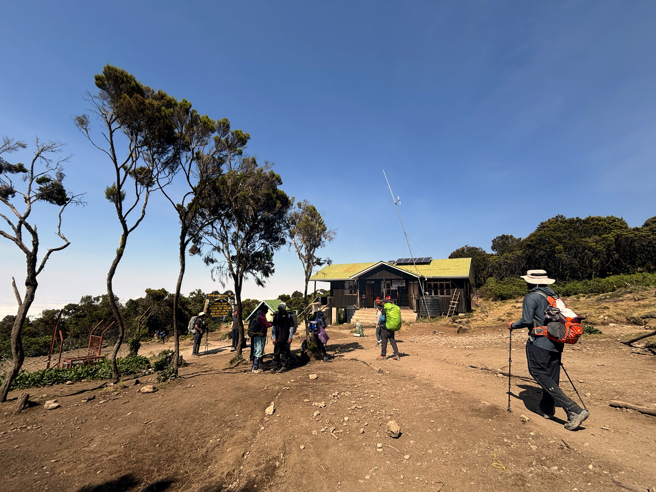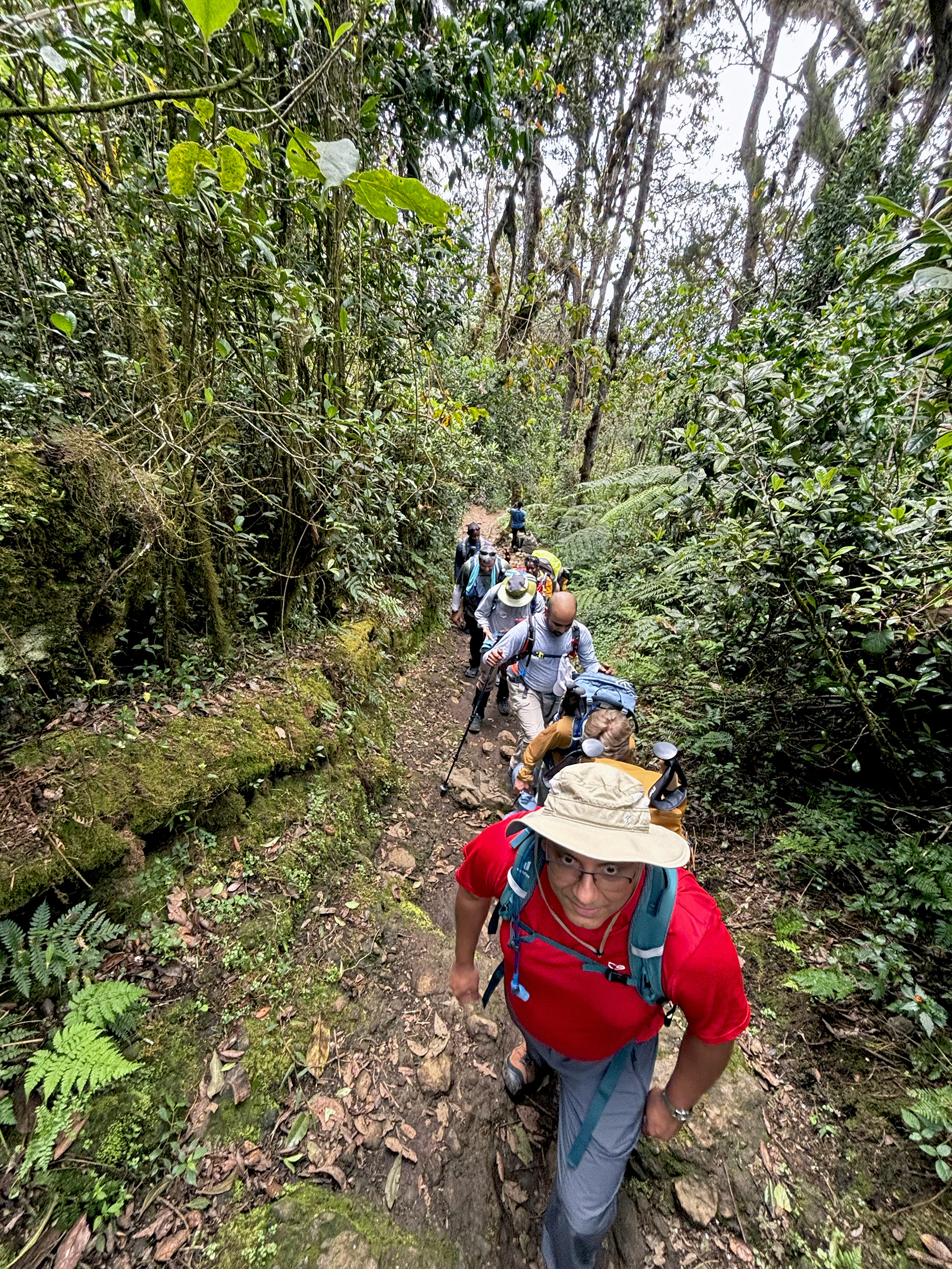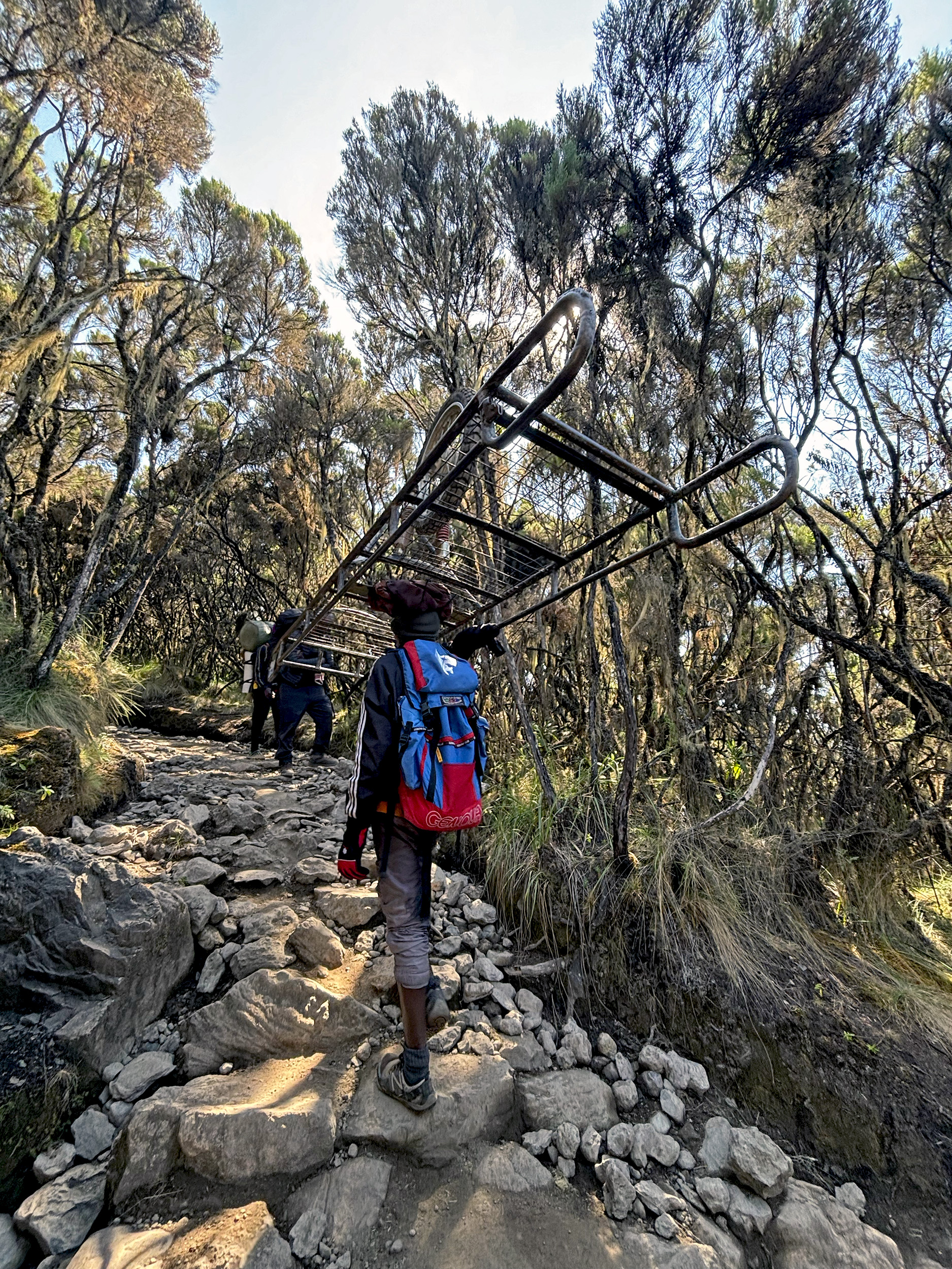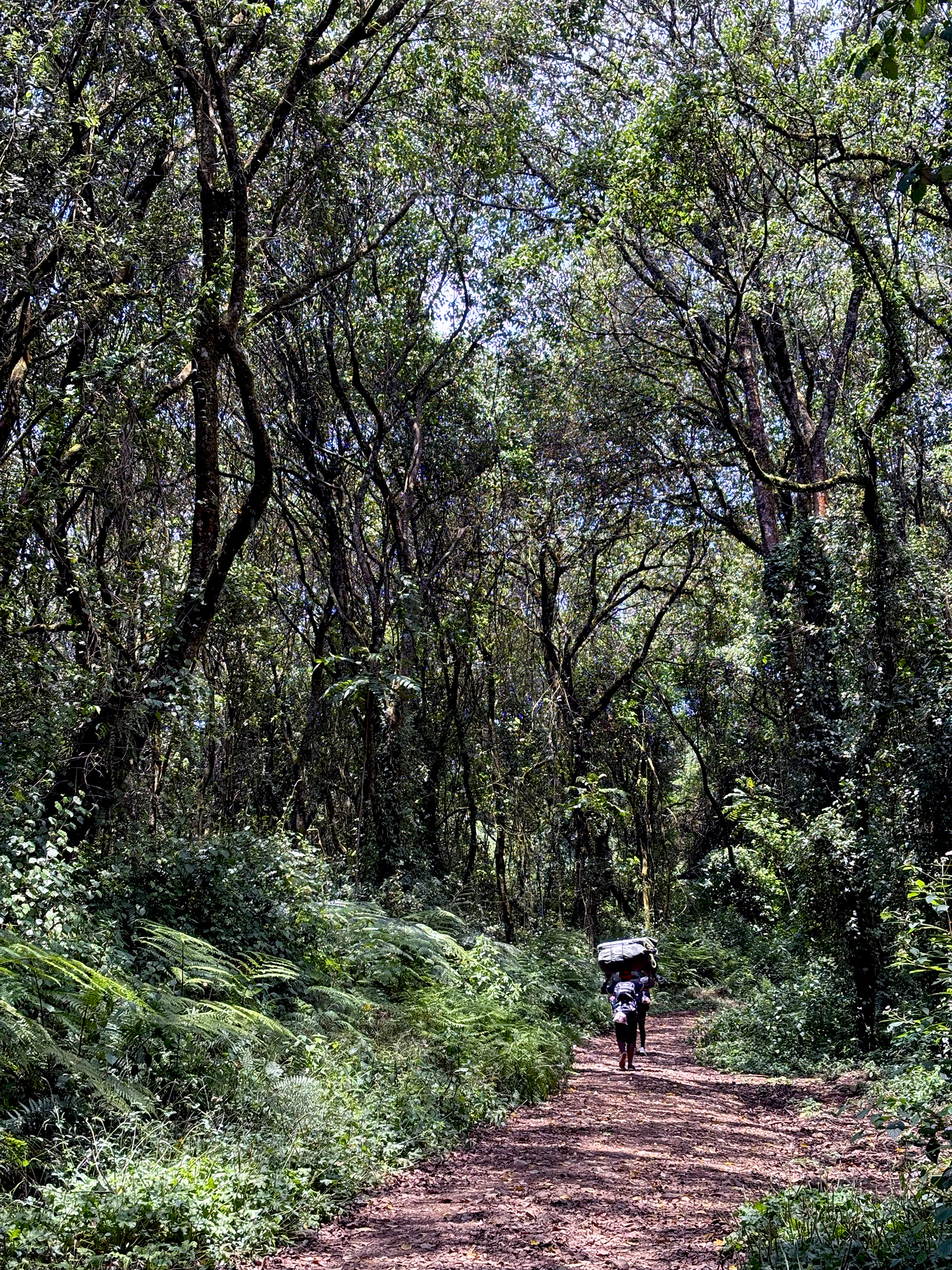 We sail past Mweka Camp (10,170 ft / 3100 m), having made it there in less time than expected. It’s one of the last clearings on the trail before we are fully enveloped by Kilimanjaro’s Rainforest. Pascal, bringing up the rear, alerts us to make way. We’re expecting a couple of porters to speed past us, but in fact it’s a loaded gurney, with at least six porters assisting in getting a sick man down the mountain as quickly as possible. A gentle reminder that we’re still on a very formidable mountain.