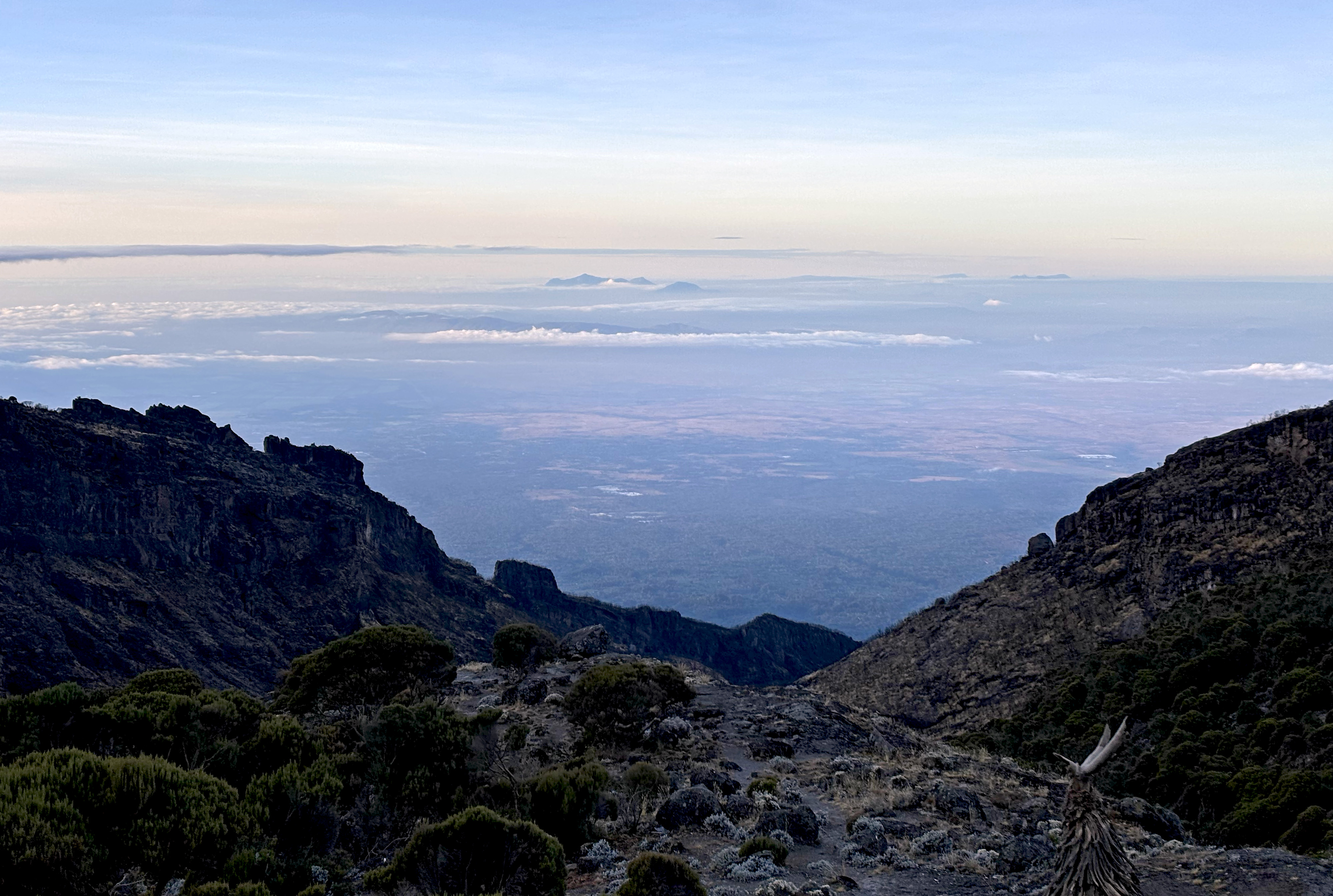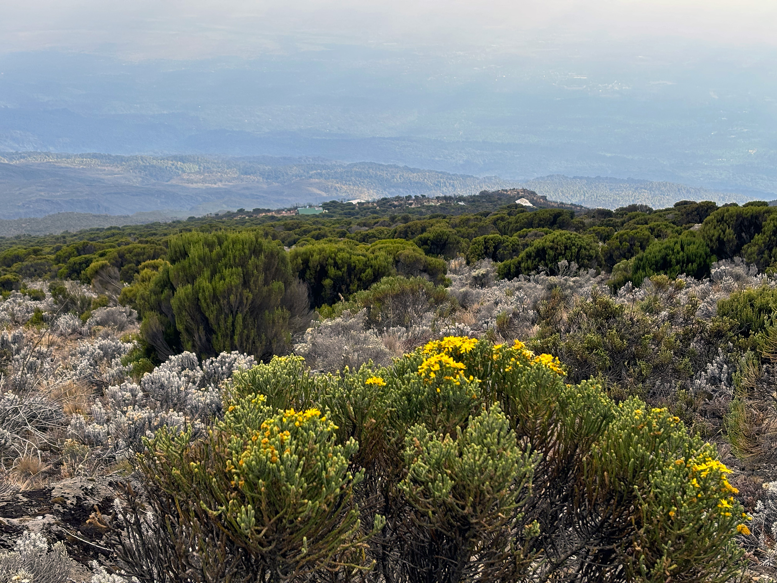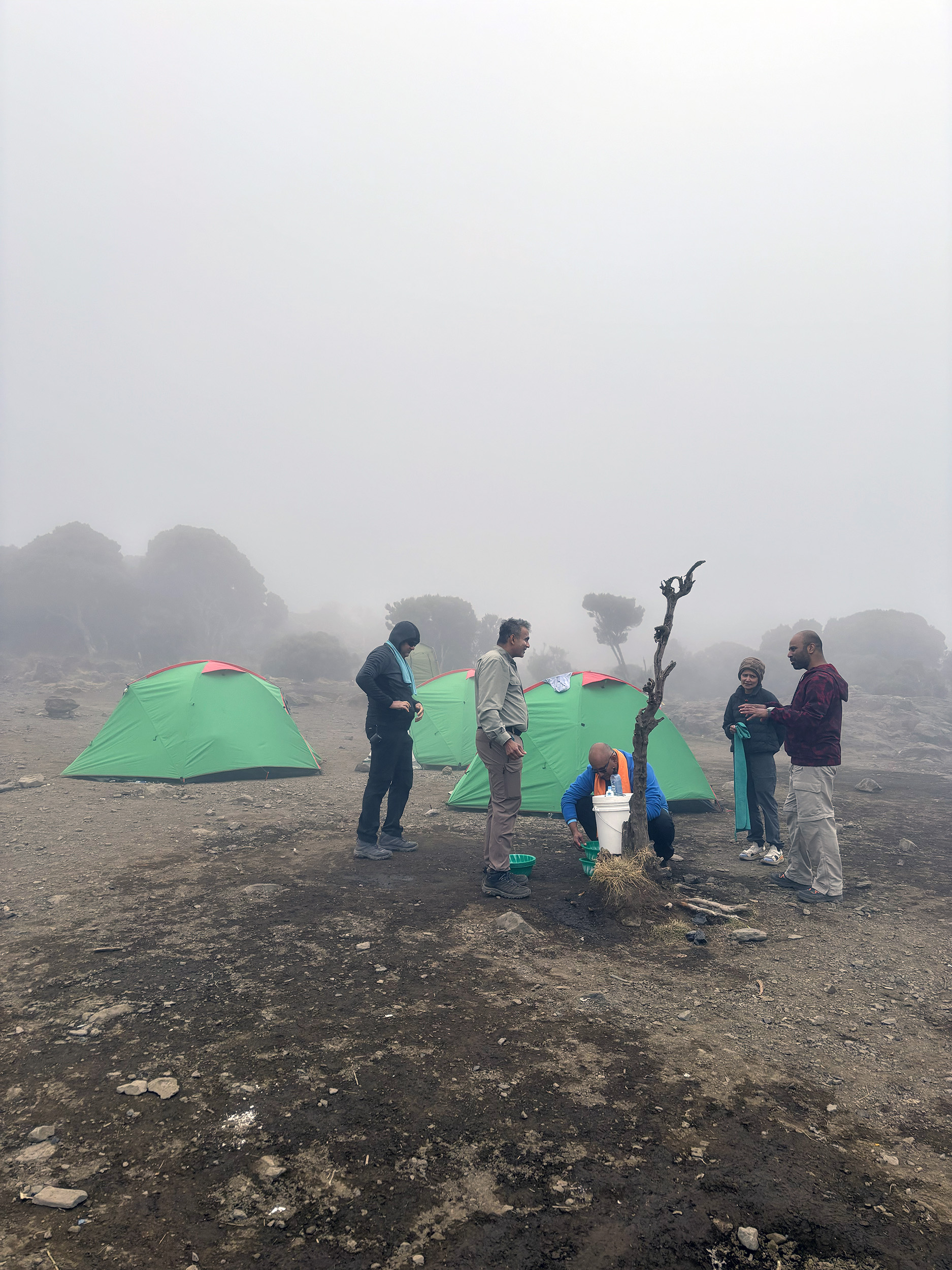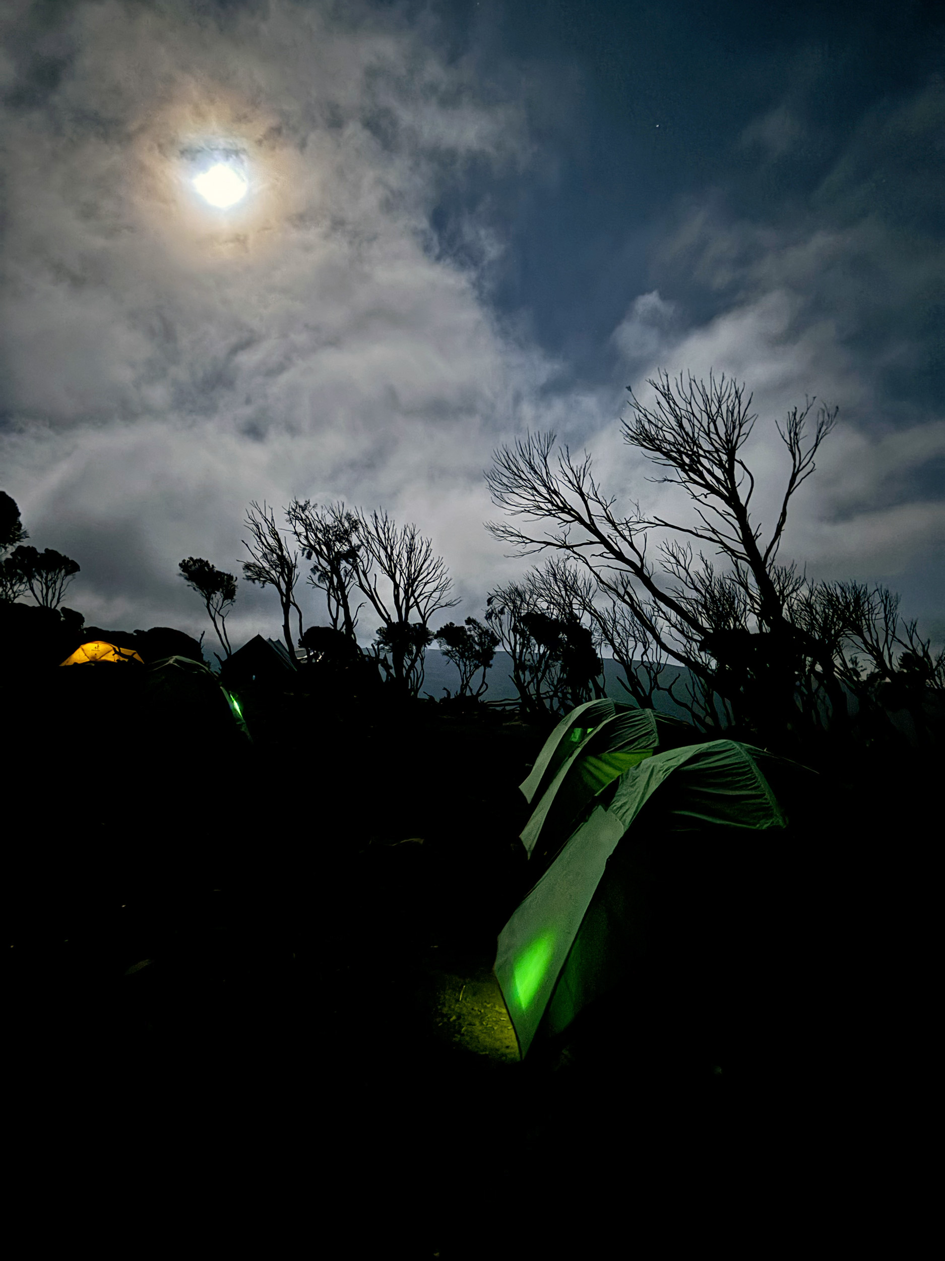 It’s taken us only 30-minutes to get down to Barafu, but an equal amount of time getting through that vast camp; our decision to camp at Kosovo validated even more. South of the campsite, we diverge from our original route, and join the route to Mweka Gate, passing a helipad along the way, and the first of many gurneys we’ll see on our descent. The expansive downhill tract we’re now on is a bleak, foggy and dusty one, with only the occasional volcanic boulder to break the monotony. About half way down and a break in, low shrubs finally appear, adding some color to our surroundings, and gradually getting taller as we hastily transition from Alpine Desert to Moorland. Thirteen hours, eleven miles, and a combined total of ten thousand feet later, we’ve made it to Millennium Camp (12,950 ft / 3960 m). To cap what could only be described as an extraordinary day of hiking, or “next level” as AS would put it, our campsite is gloriously lit by a waxing gibbous, one night shy of full moon. We’ll sleep well tonight.
