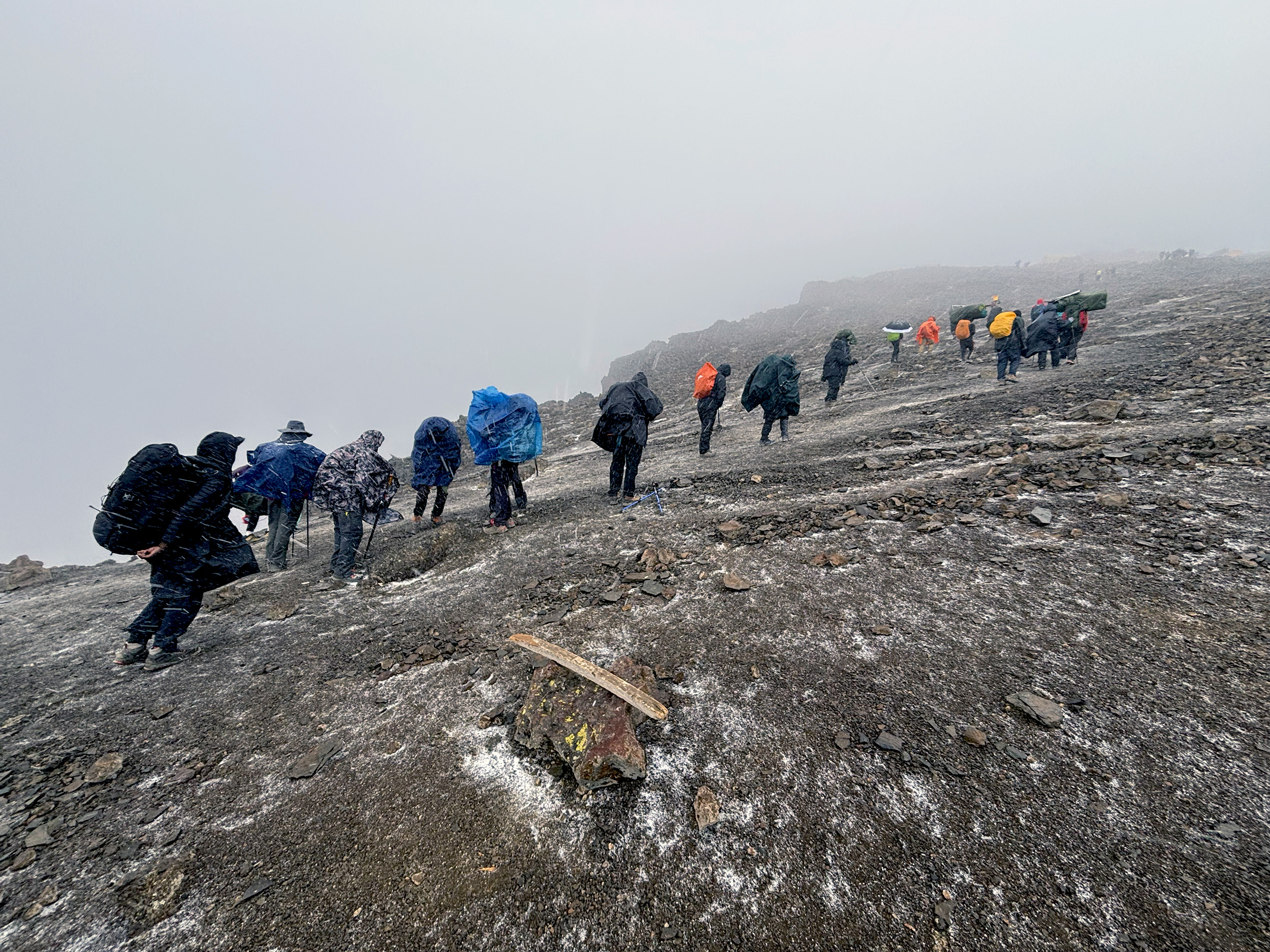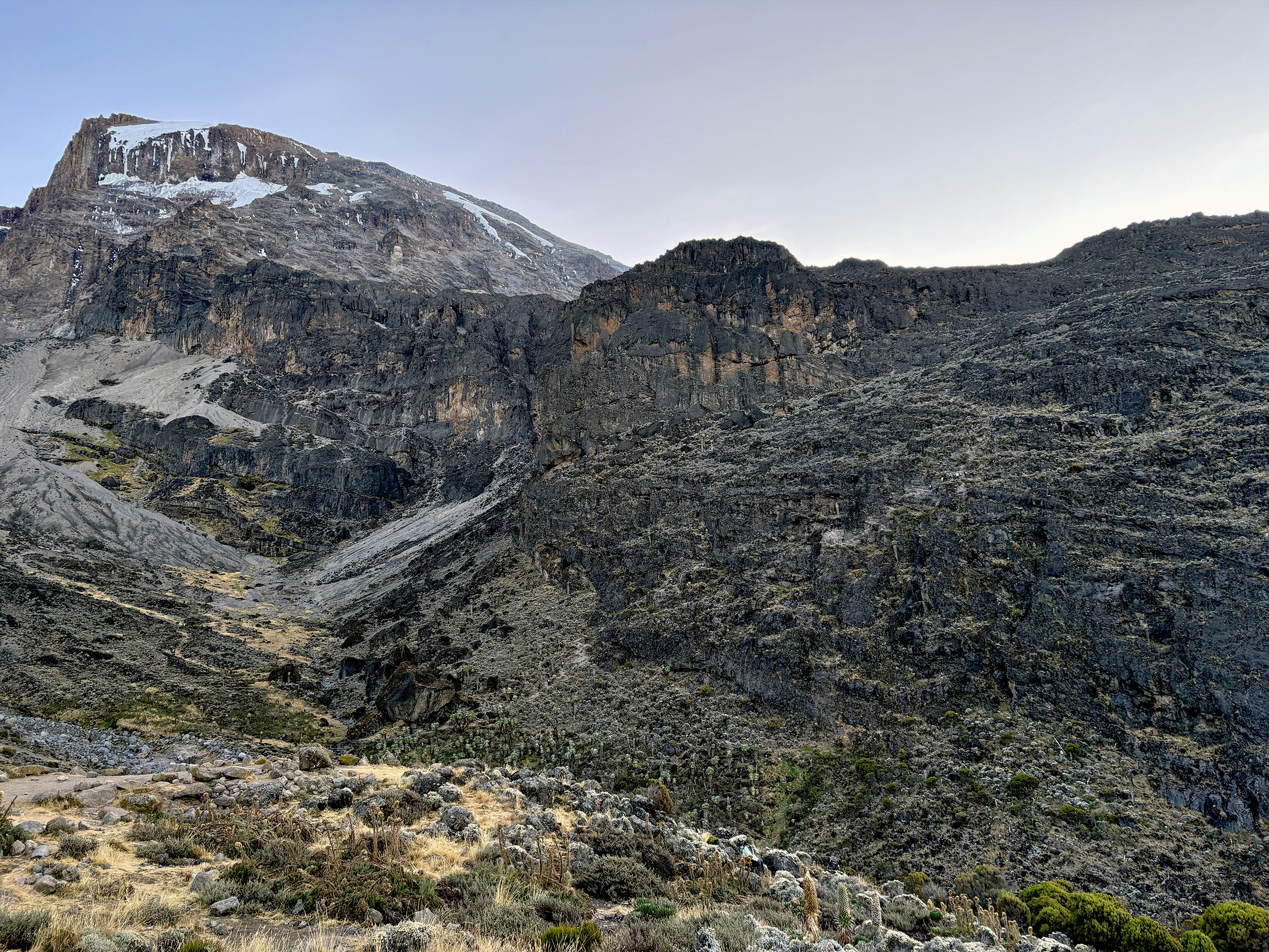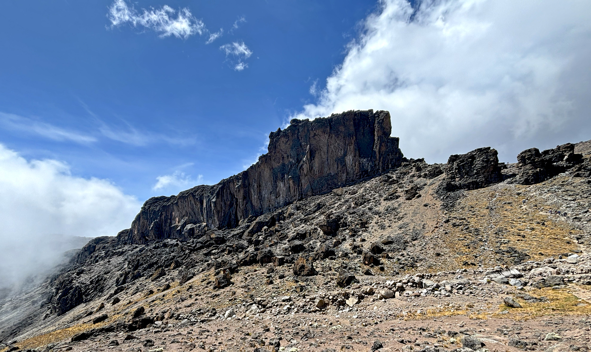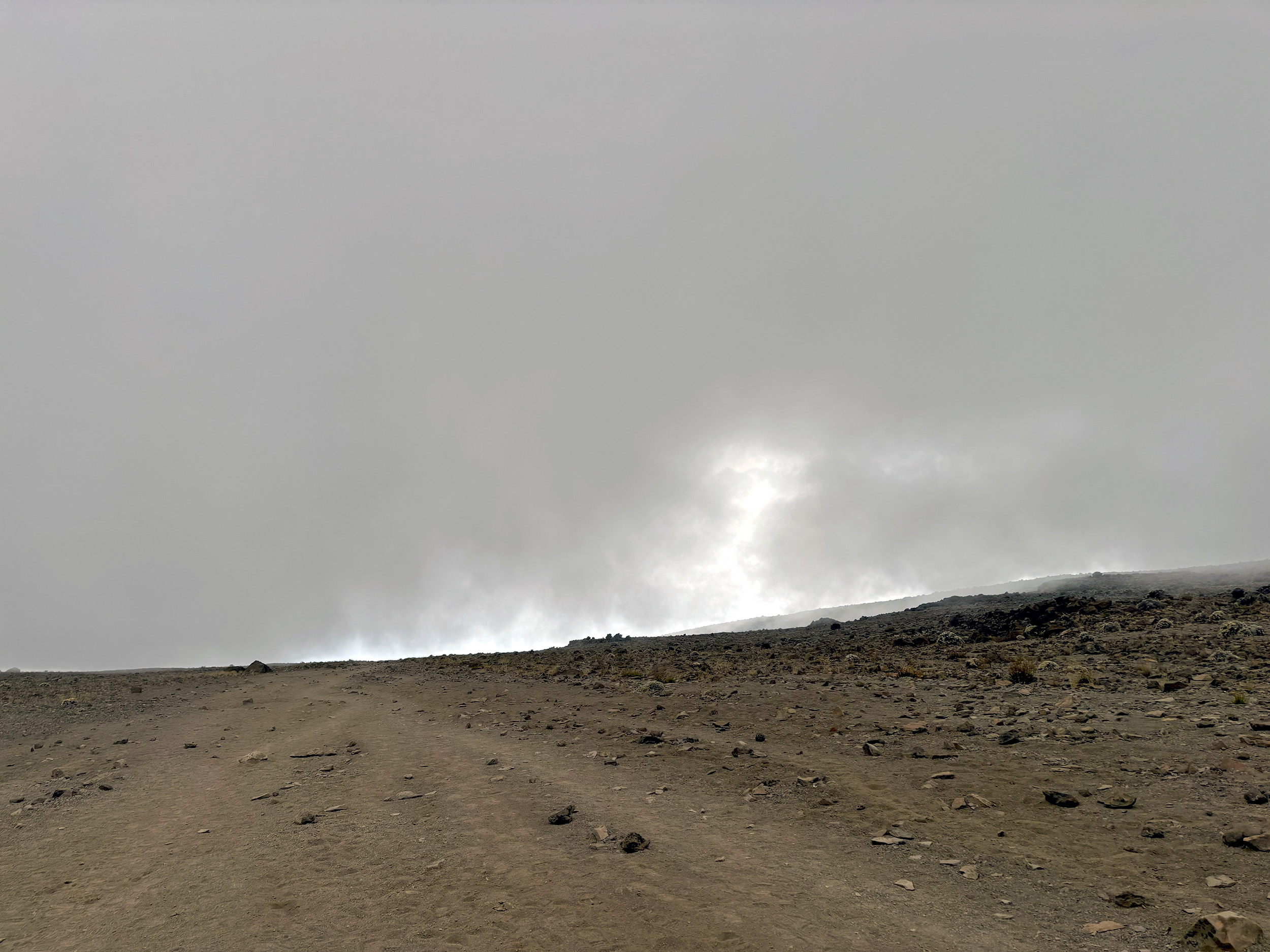 Frost-shattered rock makes up much of the terrain this morning, and walking over it is akin to treading on a field of broken glass. The incredibly arid environment of the Alpine Desert is in full effect today, with even the color of the soil appearing dull and gray. With only four miles to cover, today is considered another “light” one, but it is a constant climb nevertheless, and the trail is fairly crowded too. Barafu Camp (15,330 ft / 4673 m) is where most hikers are headed to, and it lies on a ridge in the distance, one that’s defined by a fortress-like rock formation. About half way there and some two hours into our ascent, the strong sun gives way to thick cloud cover, and the layers come right back on.