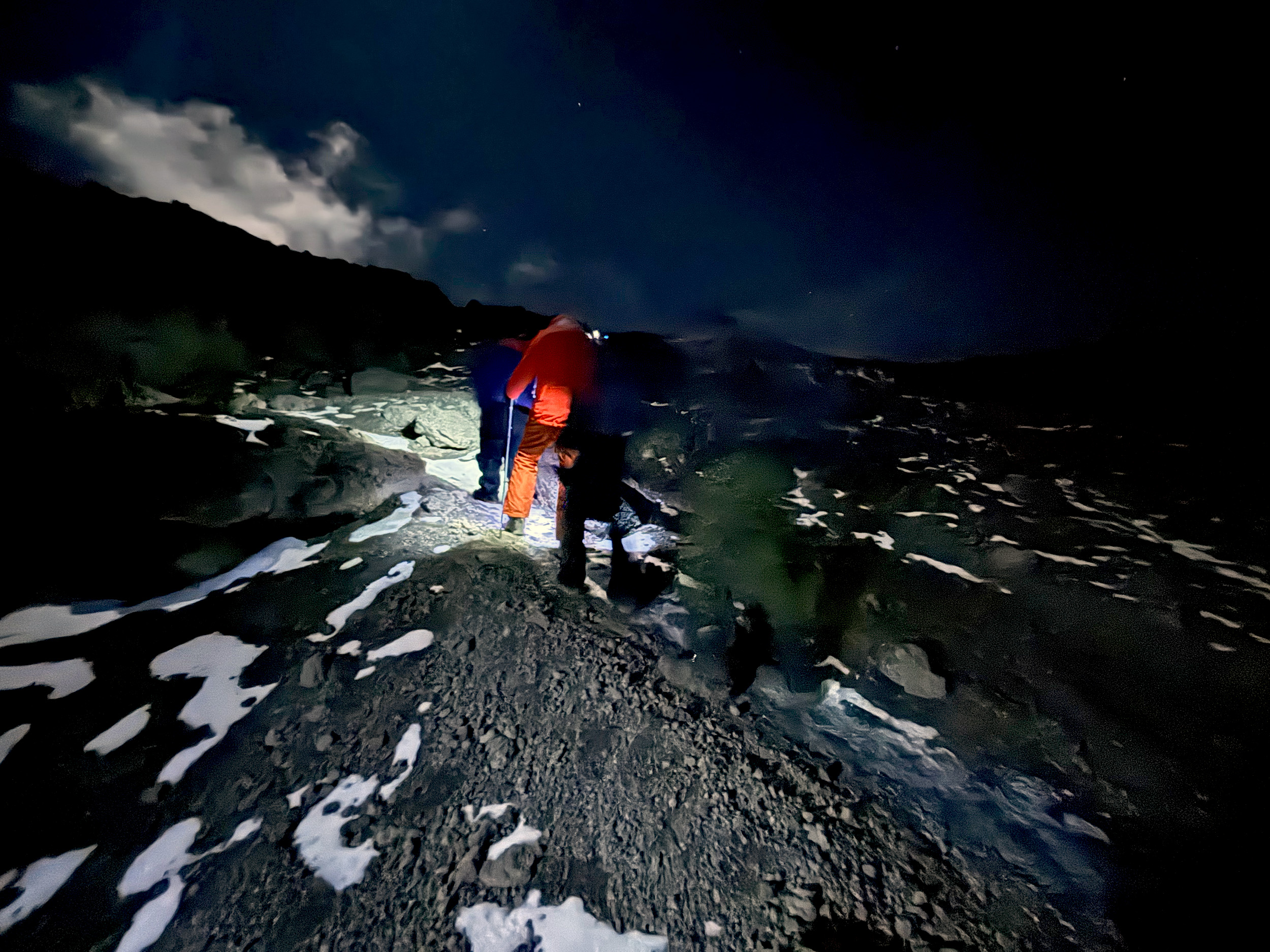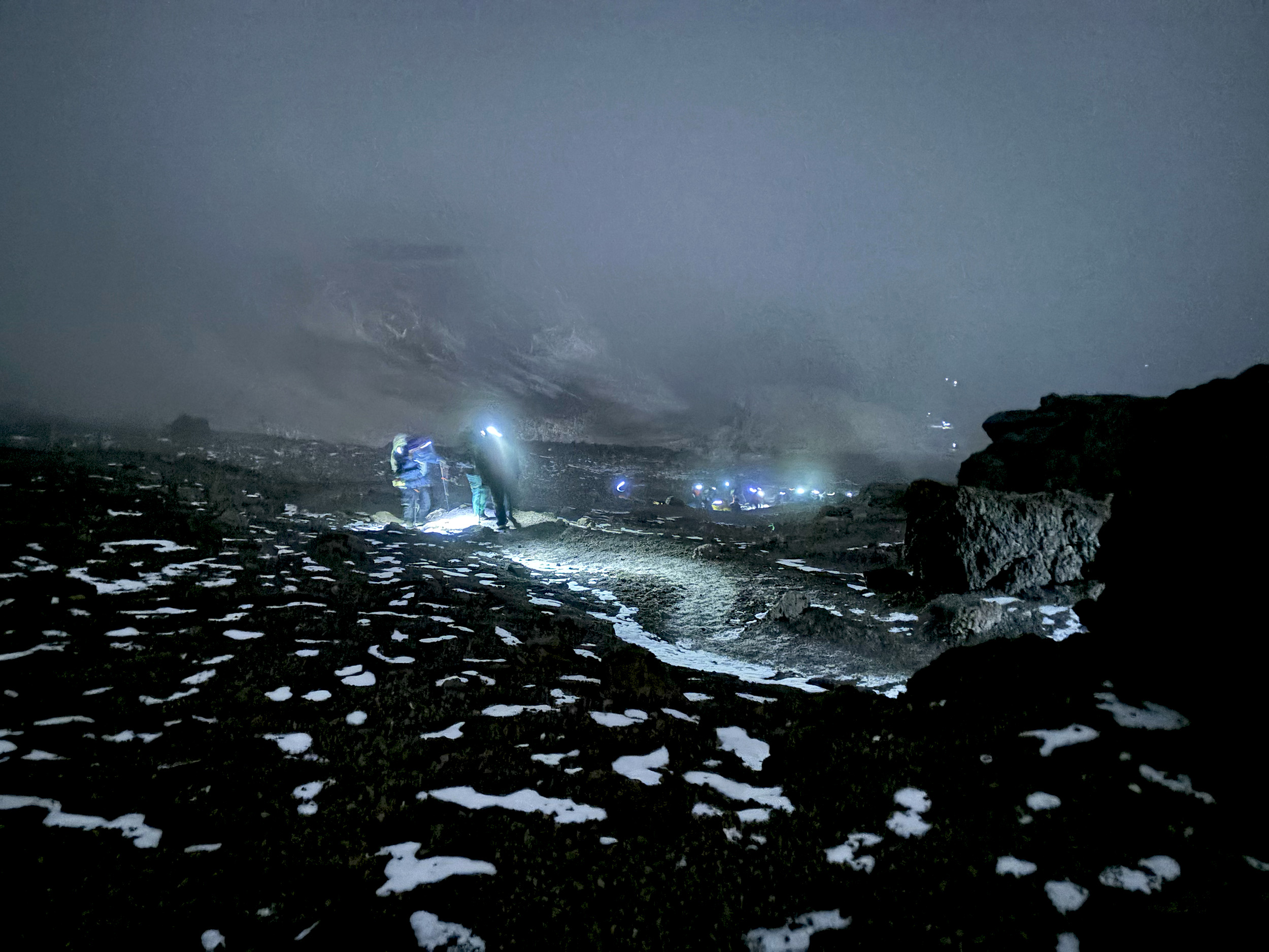 It’s twenty past midnight and we’ve begun our trudge out of Kosovo Camp. We have countless switchbacks to negotiate, and 3500-feet to ascend, but not long after leaving we reach our first milestone, crossing into Kilimanjaro’s Arctic zone. True to its name, it is absolutely frigid here, with the temperature dropping by a degree celsius every hundred or so meters gained. I have five layers on – probably the most I’ve ever worn – and the cold is still managing to seep through. My hands, especially, are bearing the brunt of it. Below us is a winding caravan of headlamps – hikers slowly making their way up, but all the while gaining on us.