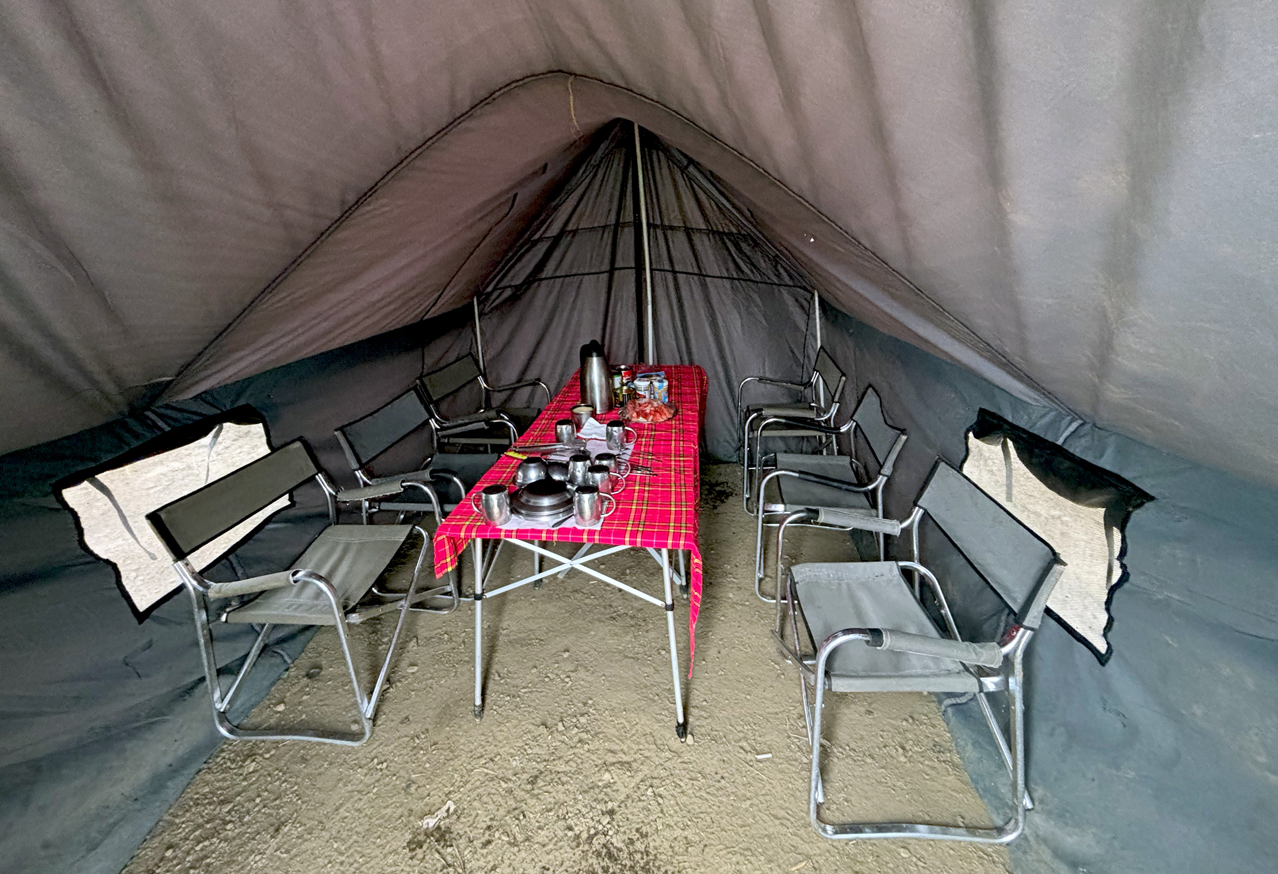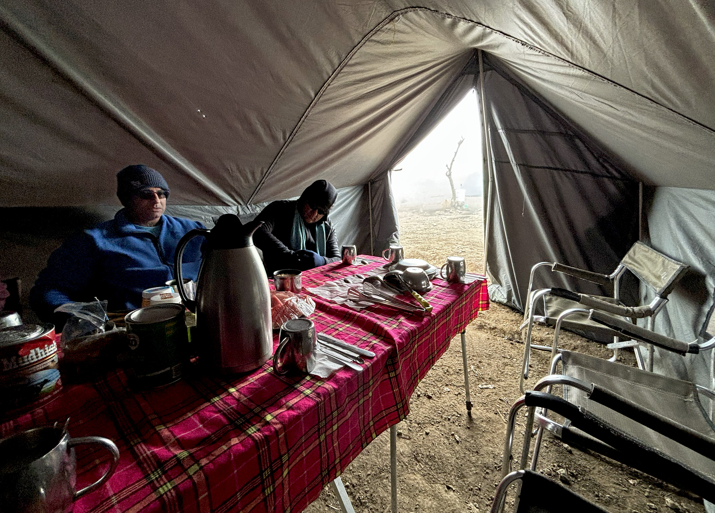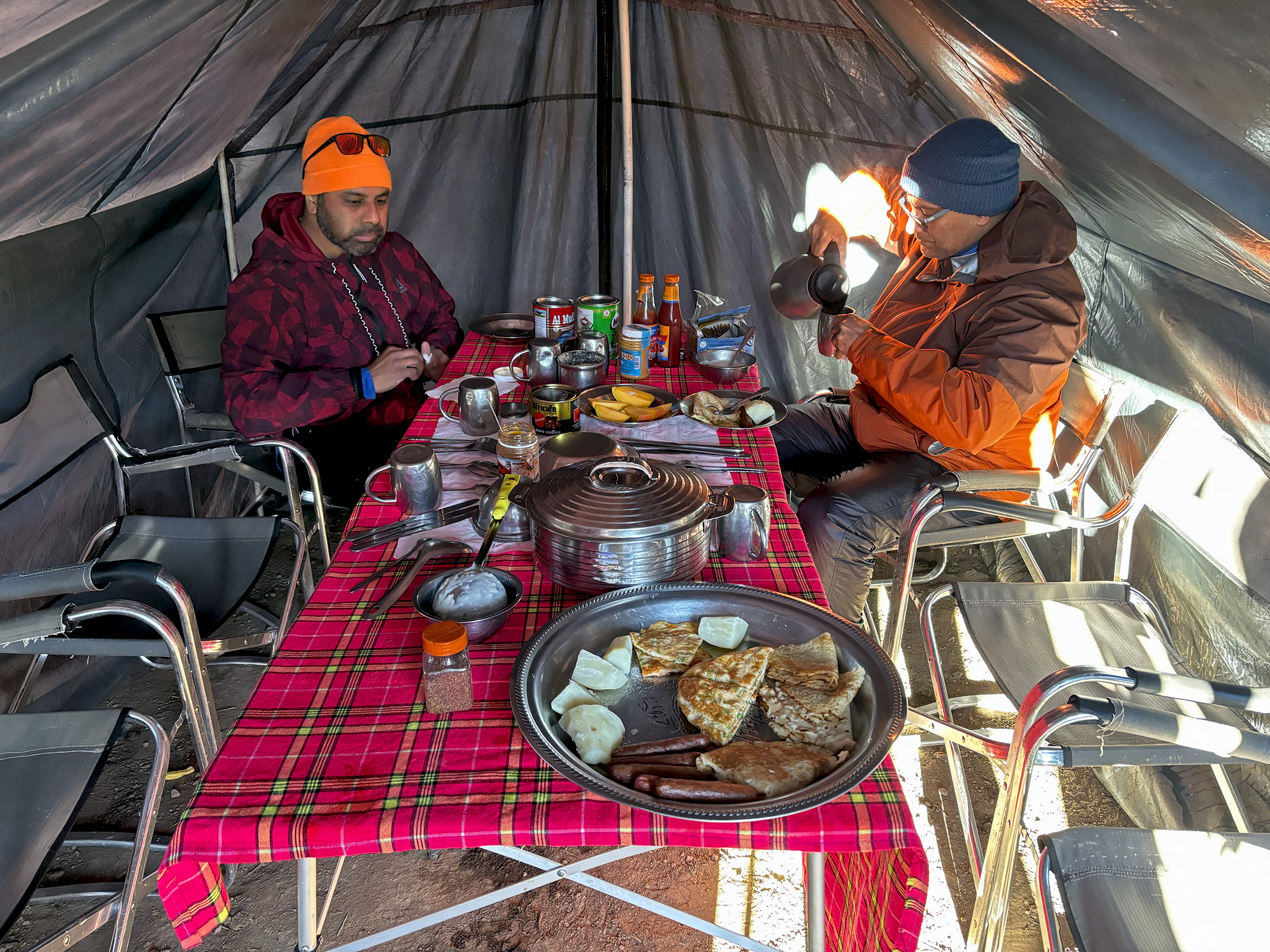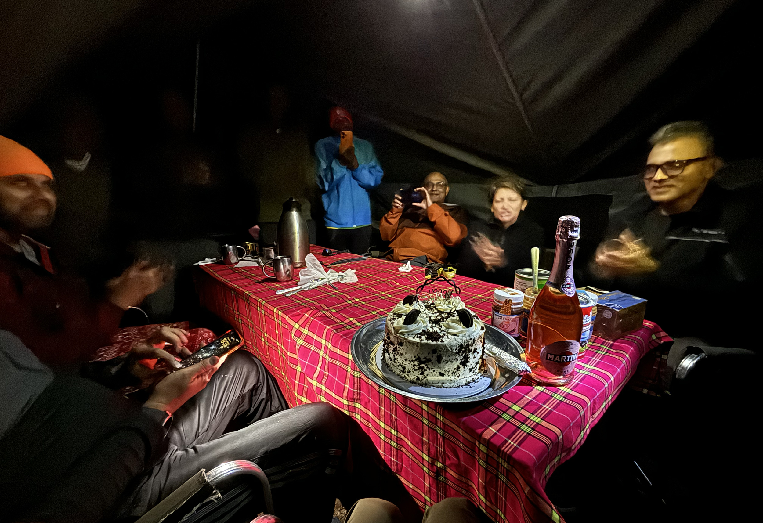 Evening tea is accompanied by biscuits and popcorn, and not long after, Musa, our server, announces dinner. Pumpkin soup to begin with, followed by grilled beef and pasta, and some aloo pakoras for good measure. What a treat! And then, just when I’d entirely forgotten about completing another turn around the sun, our mess tent is ambushed from both sides. A giant cake appears, as does some bubbly, all accompanied by plenty of raucous singing, in Swahili first, followed by English. A high-altitude birthday surprise! Surely one for the record books. Hopefully no one caught me blushing…