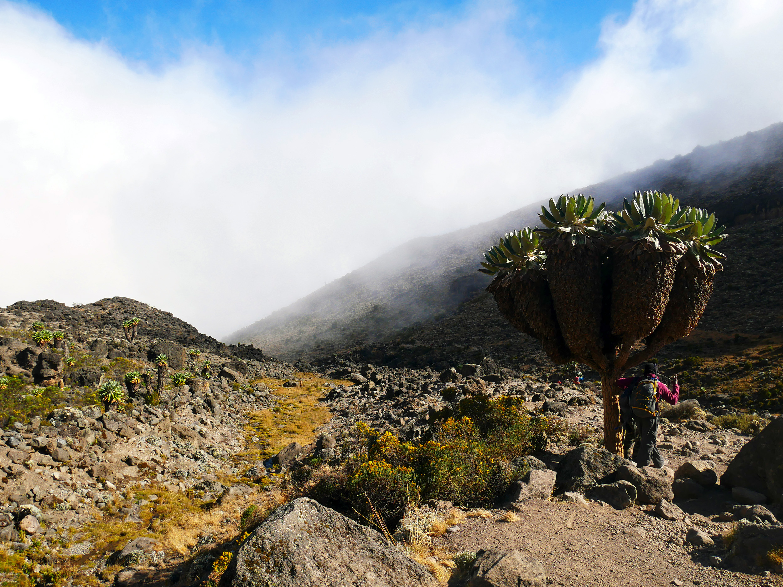 The trail drops precipitously upon leaving the campsite, using an extremely rocky, narrow pass to descend into the valley east of the imposing volcanic plug that is Lava Tower. Part desert palm, part larger-than-life pineapple, but mostly otherworldly, the Dendrosenecio Kilimanjari or Giant Groundsel is one of the most unique plants found on the mountain, and we stumble upon several groves of this handsome species as we hike further through the valley floor. In the distance, a waterfall punctuates the stillness, plunging toward a hidden mountain stream. Nature’s incredible landscaping act, in this seemingly barren expanse of the Alpine Desert.
