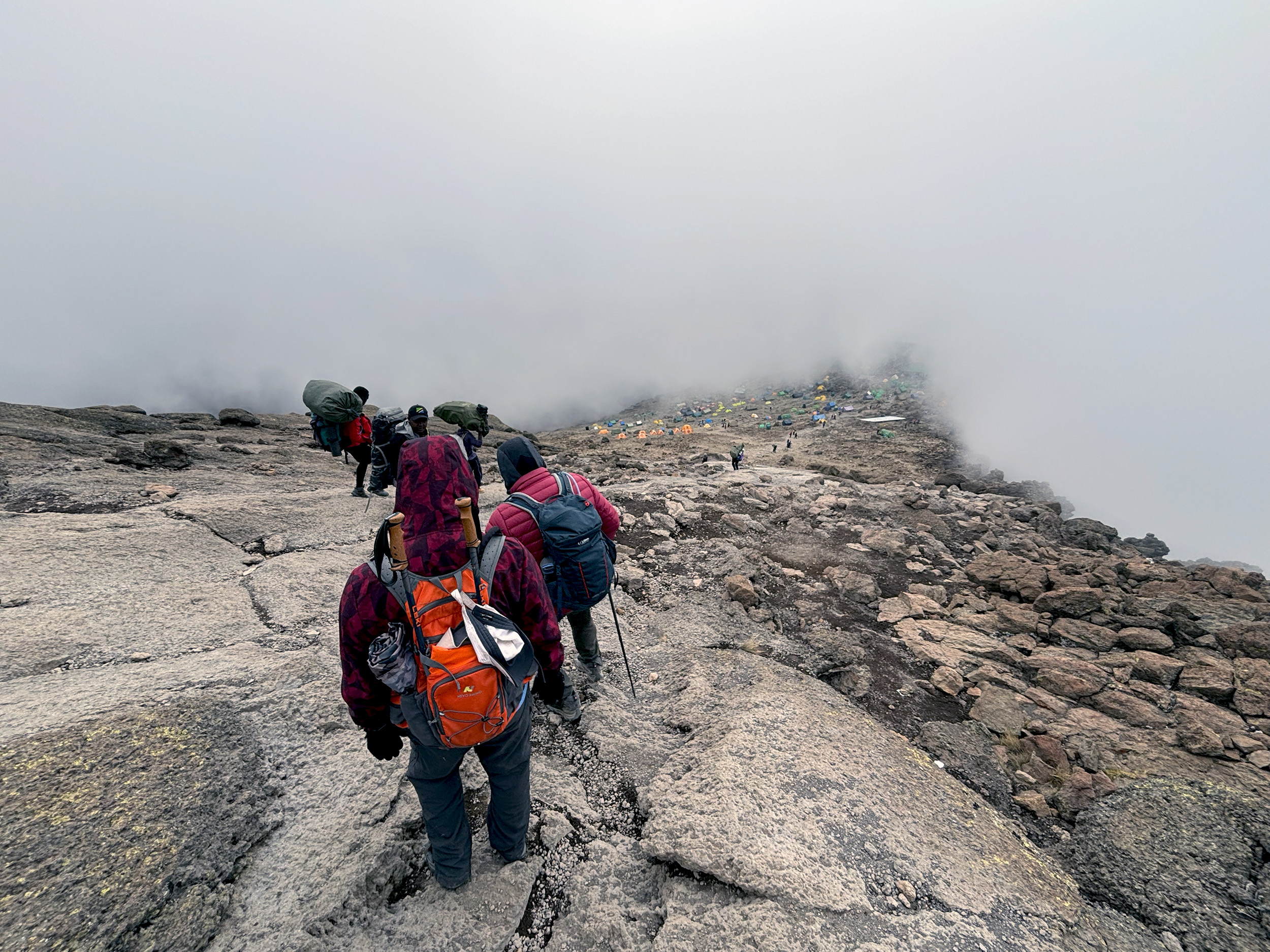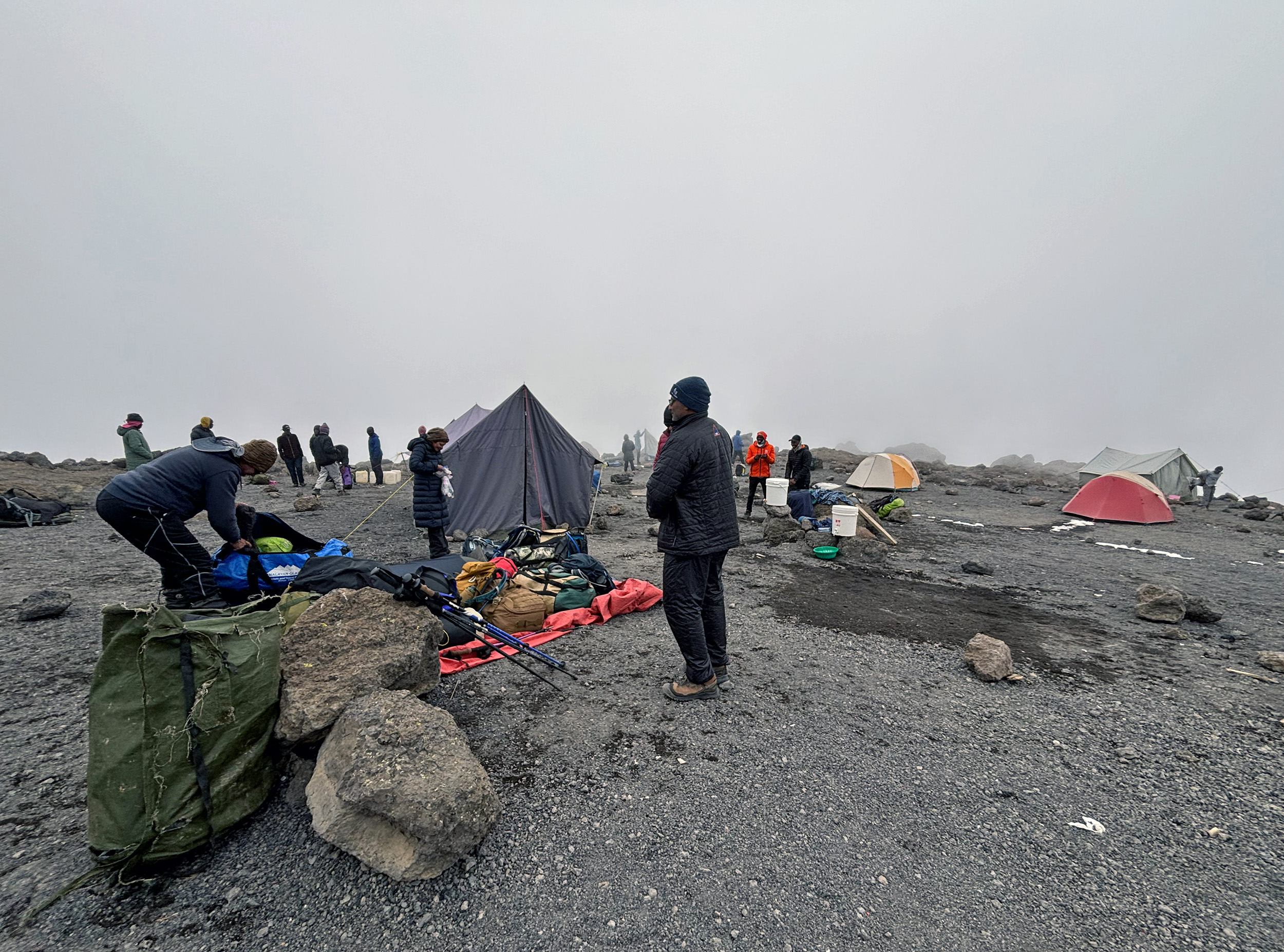 Apart from bitter cold, the Arctic zone is also known for its scorching sunshine, and we feel the effects of that as we linger around the summit. It’s 0740 and Michael suggests we get a move on it – we still have a long way to go, and staying at this altitude much longer isn’t advisable in any case. We’ve already seen a few climbers look sickly, and several are now being assisted down the mountain by porters. Past Stella Point, we descend to Kosovo using a different route, one that’s far more treacherous, with only scree, loose dirt, and gravel for terrain. It’s a slippery slope, anyway you slice it. The knees, expectedly, take a real beating, but my toes are faring no better and are literally on the verge of bleeding. There’s only one upside to this torture – this route will get us back to camp in a fraction of the time. As a thick cloud cover moves in gradually, we spot our campsite in the distance. SC is there, arms wide open, welcoming us warmly, and congratulating us individually, as we walk in. After a 3-hour break of sustenance and rest, the camp at Kosovo is struck down. It’s time to move again.
