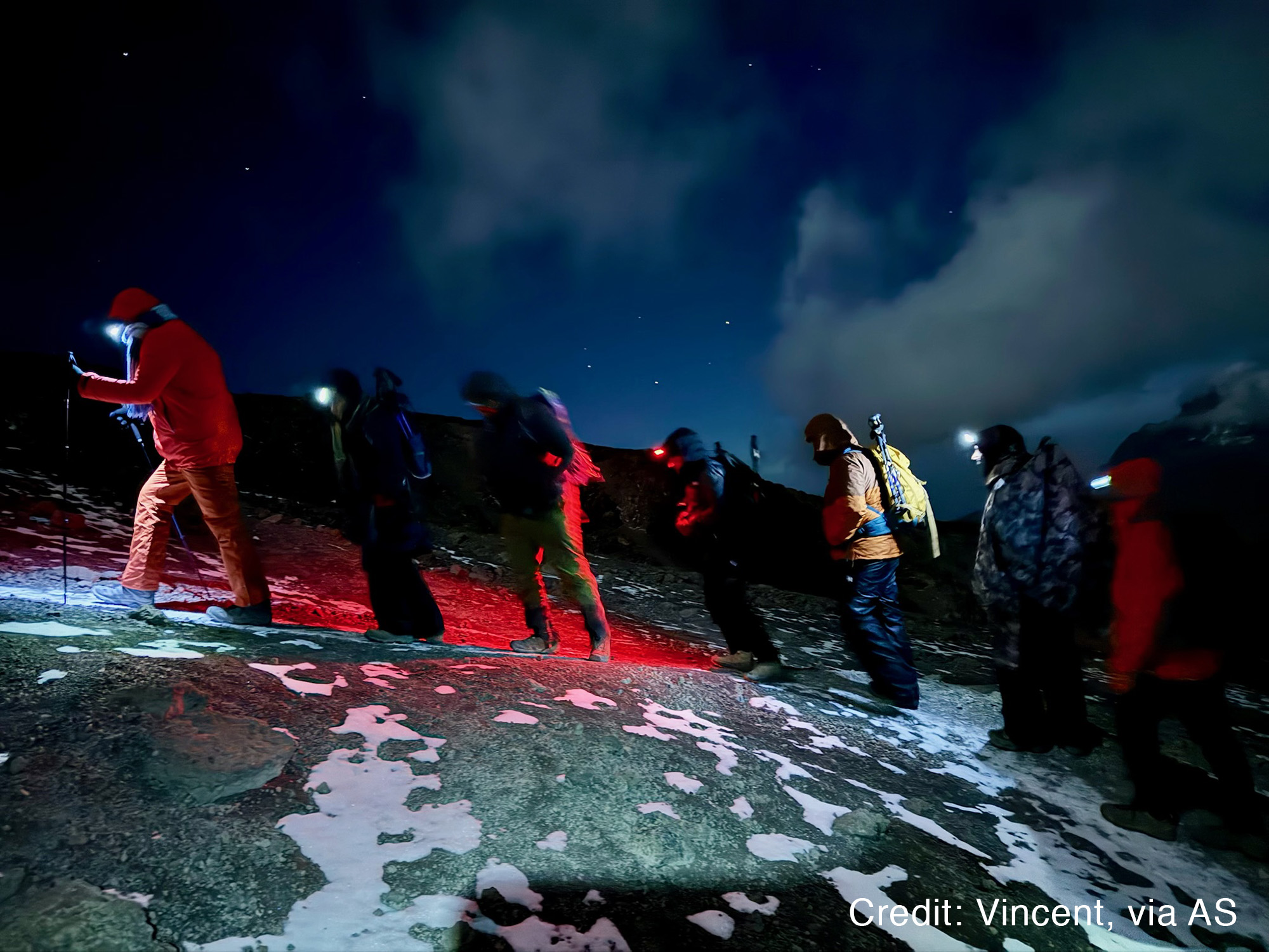 The night was clear when we started off, with a moon so bright we could get by without the use of our headlamps. But the clouds have begun to roll in now, accompanied by a punishing wind. To add to our misery, the pipes on our hydration packs have all frozen. Even though we’ve carried an additional bottle each as back up, hydrating sufficiently will prove to be a challenge. The push to the summit is turning out to be a lot more challenging, and much slower than we anticipated. Our steps are laborious, wobbly even. I feel like I’m drunk, declares US, who’s right behind me. He’s accurately summed up that inexplicable feeling of fatigue, a combination of exhaustion and exertion at this altitude, and in these temperatures. Especially struggling in our rank and file is SC, necessitating a stop for our group every five or so minutes. Michael urges us to keep moving, pole pole. The more we stop, the more body heat we lose, he reminds us.