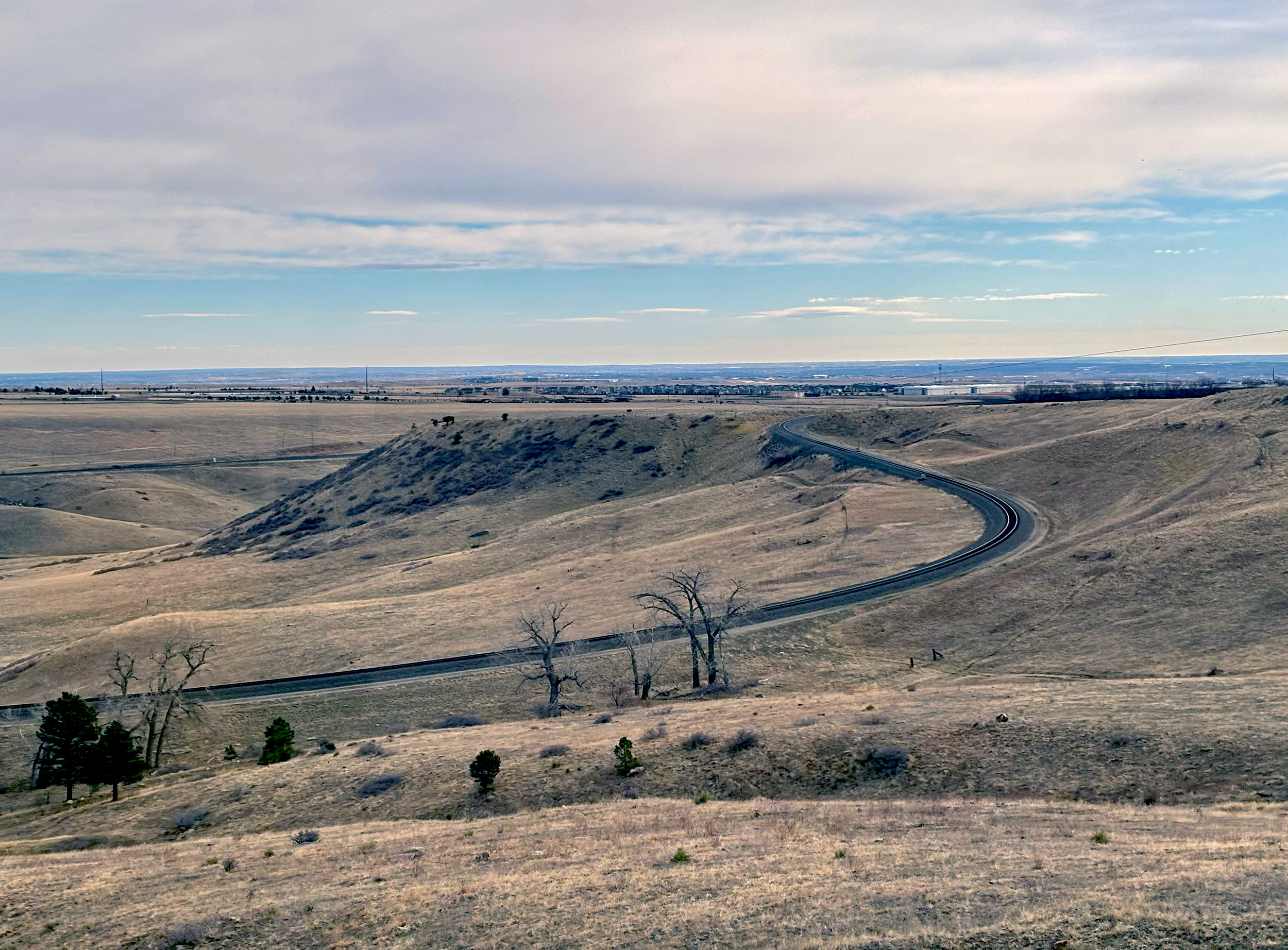 About an hour into the journey, and well past the outskirts of Denver, SB points to a lengthy row of loaded hopper cars in the distance. They are the railroads first line of defense along the notoriously windswept stretch of track known as Big Ten; a long, sweeping curve of 270-degrees, named so as the radius of the track’s curve is ten degrees. The Zephyr gains almost 300-feet in elevation here as it negotiates this feat of engineering, and to everyone’s delight, we get a first peek at the front of our train.
