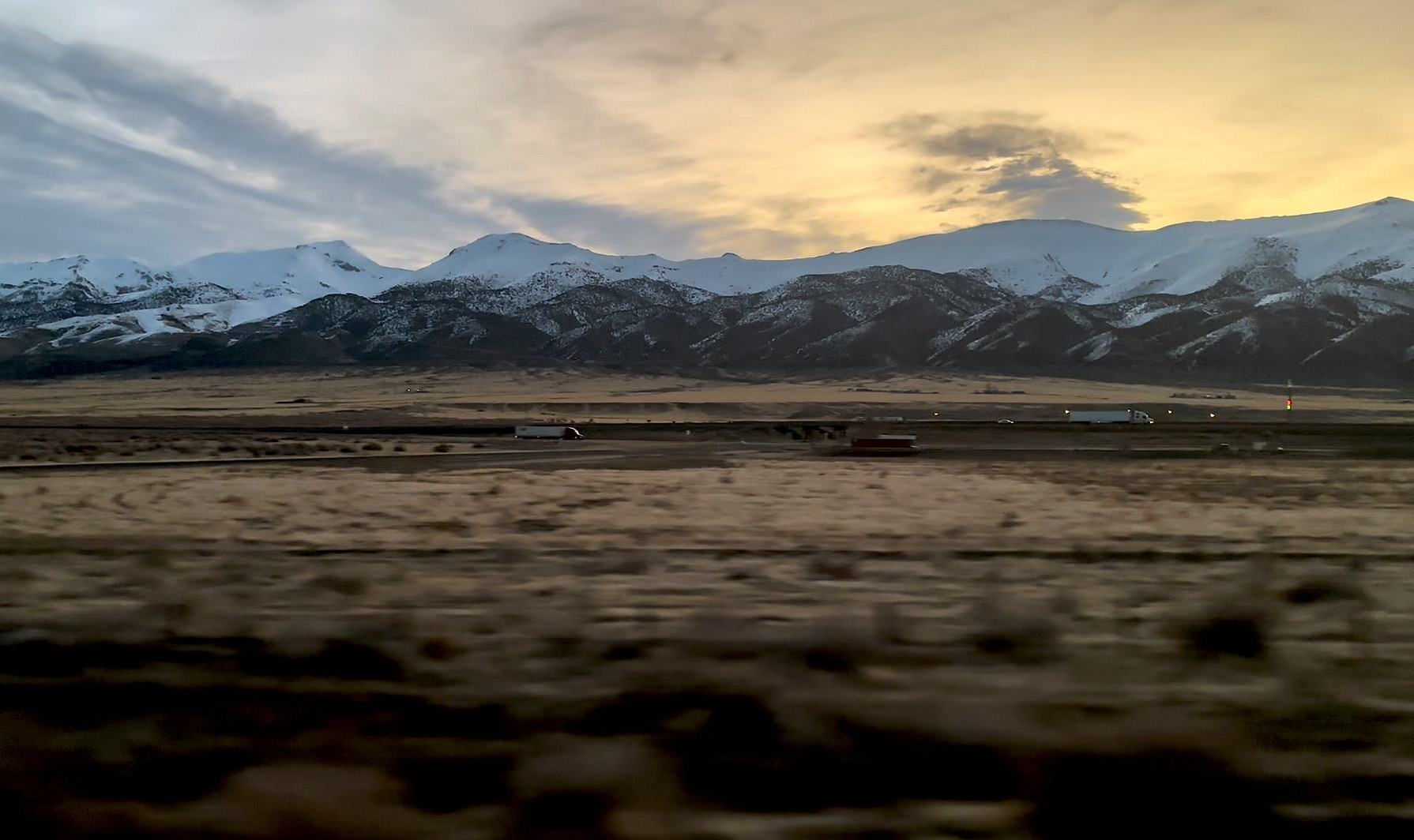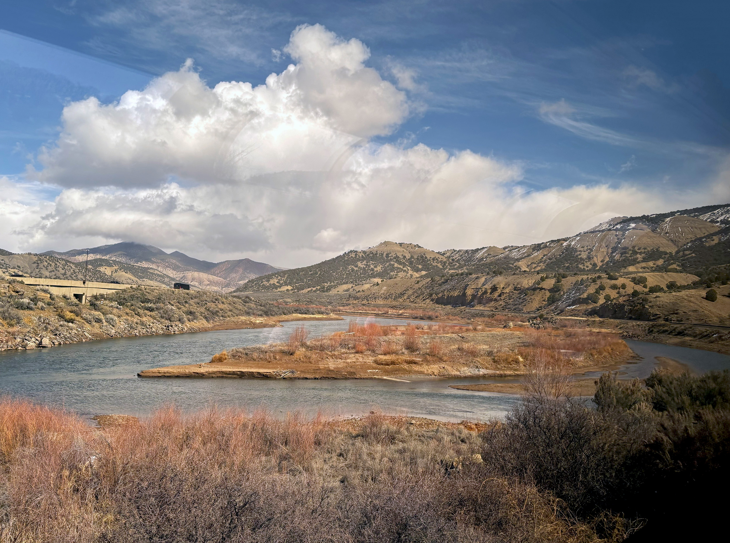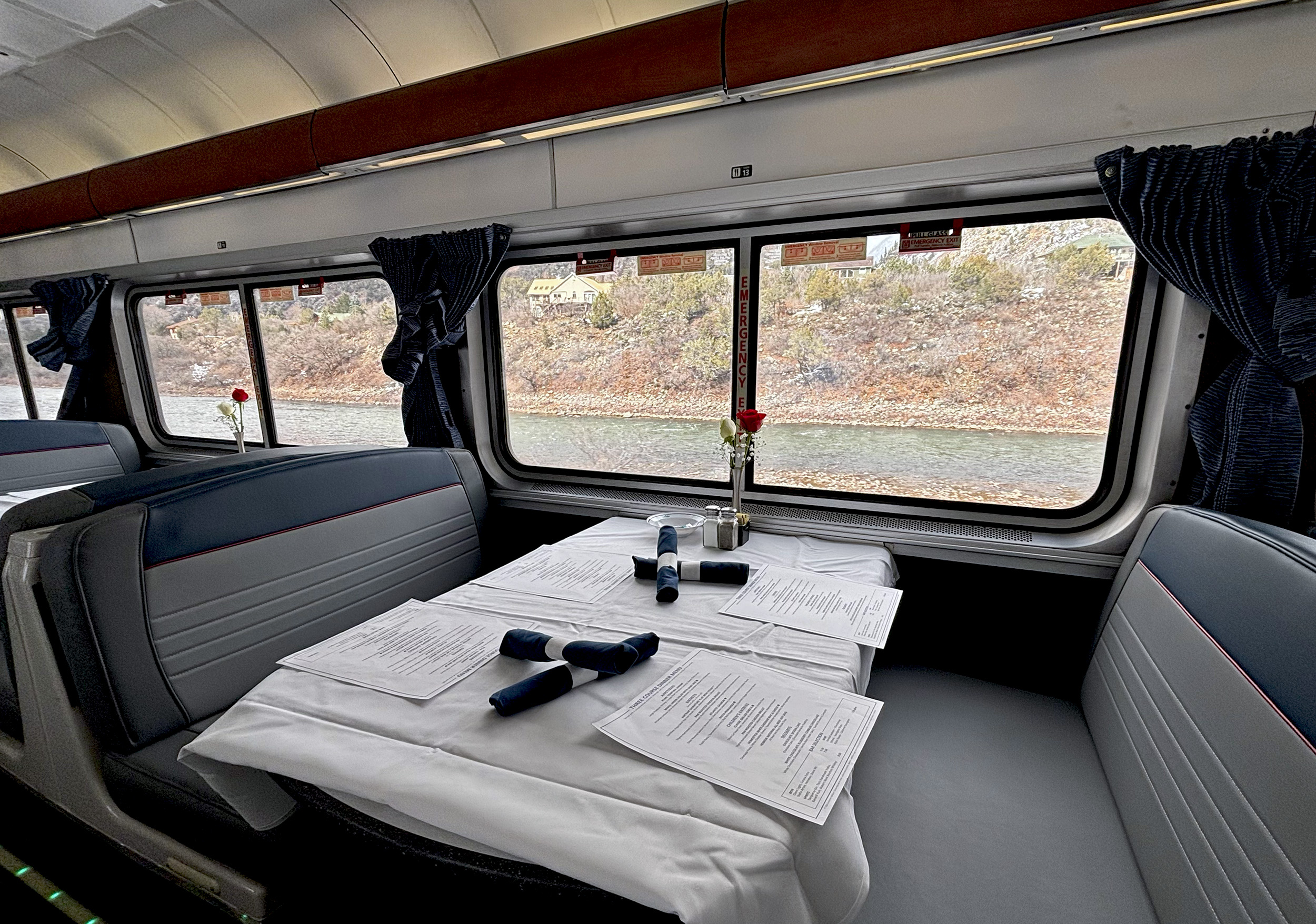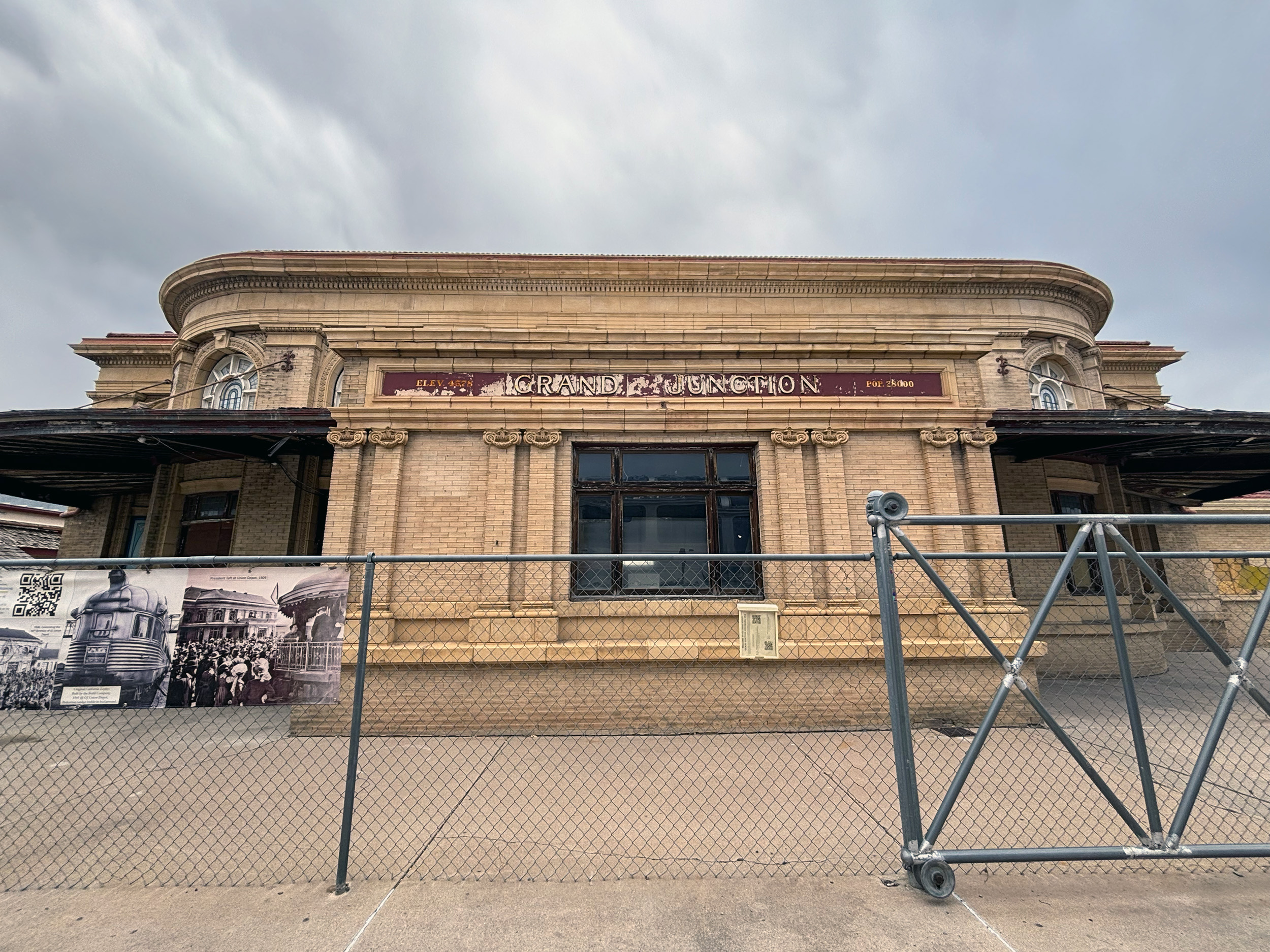 Not long after our departure from Glenwood Springs, the weather takes a turn for the worse. Blowing rain at first, followed by snow. In the midst of those whiteout conditions, JB spots a pair of elk wading along the banks of the Colorado. Then, a brief spell of sunshine – all while it’s still snowing – brilliantly lighting up the topography. By the time we pull into Grand Junction, it’s overcast again but completely dry. The third and last “smoke stop” for the day, there is nothing grand about Grand Junction sadly, what with its elegant old depot building barricaded, and out of use for over three decades at this point. As we scrutinize the plaque alongside the historic building, Donna, the coach car attendant makes the “all aboard” call, and we obediently head back to our viewing stations.