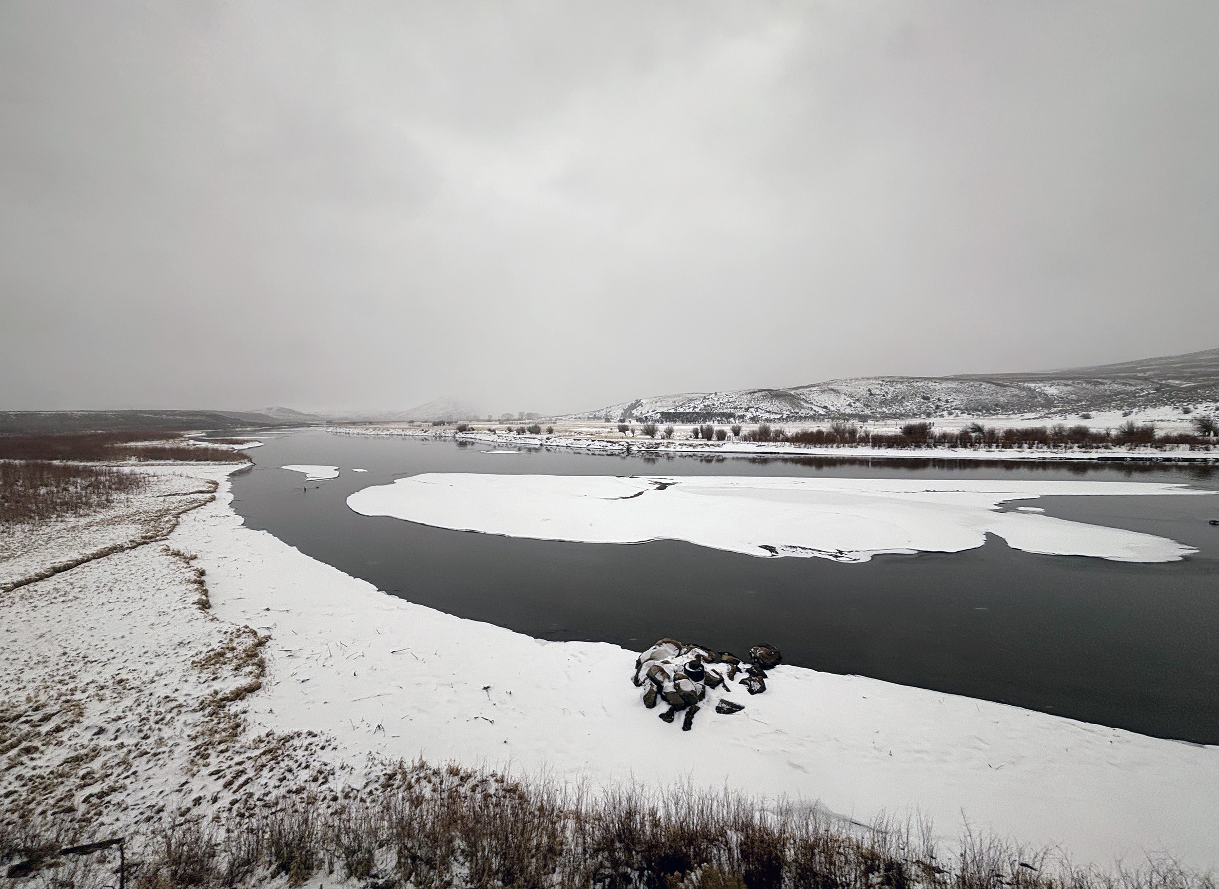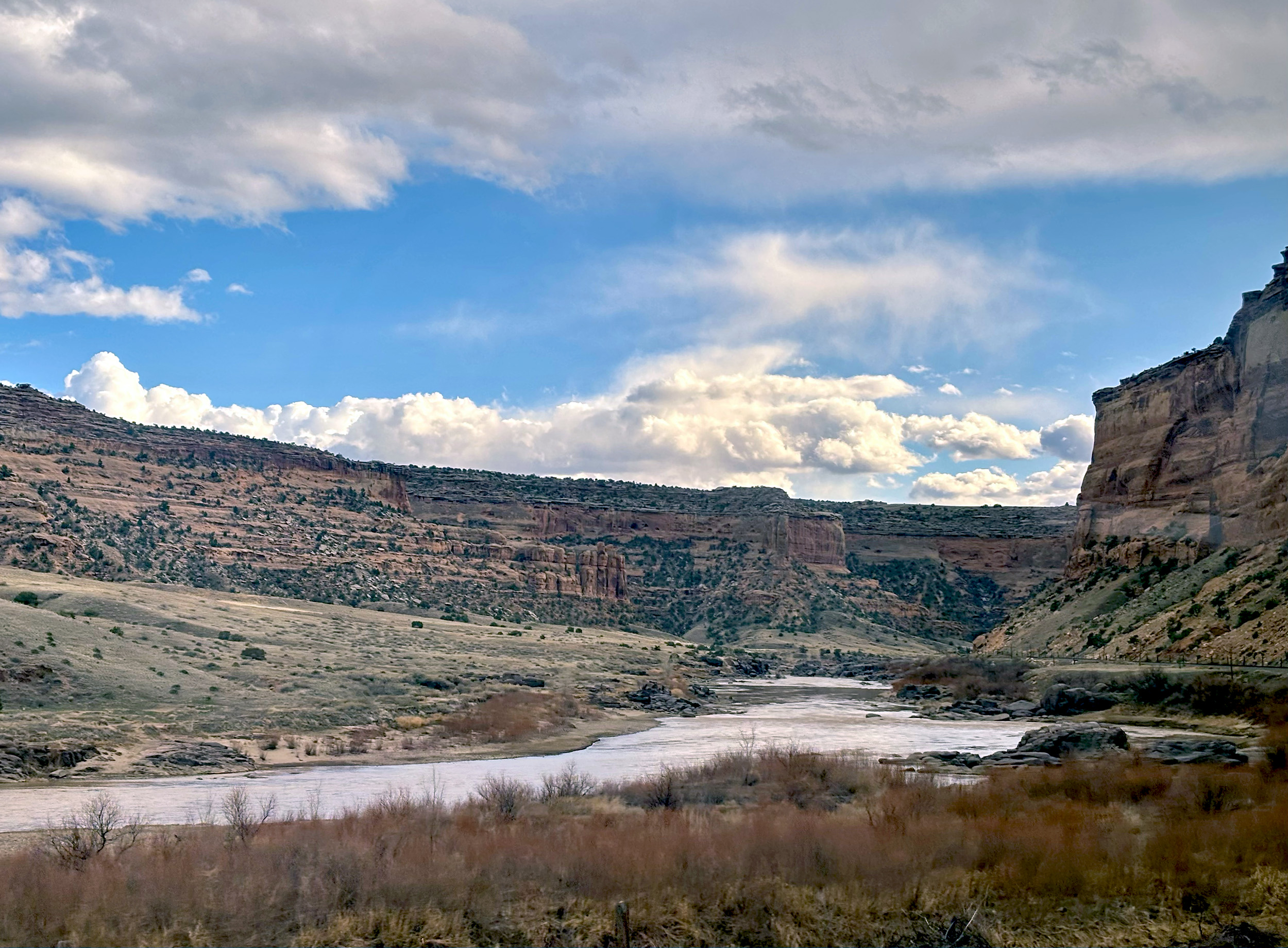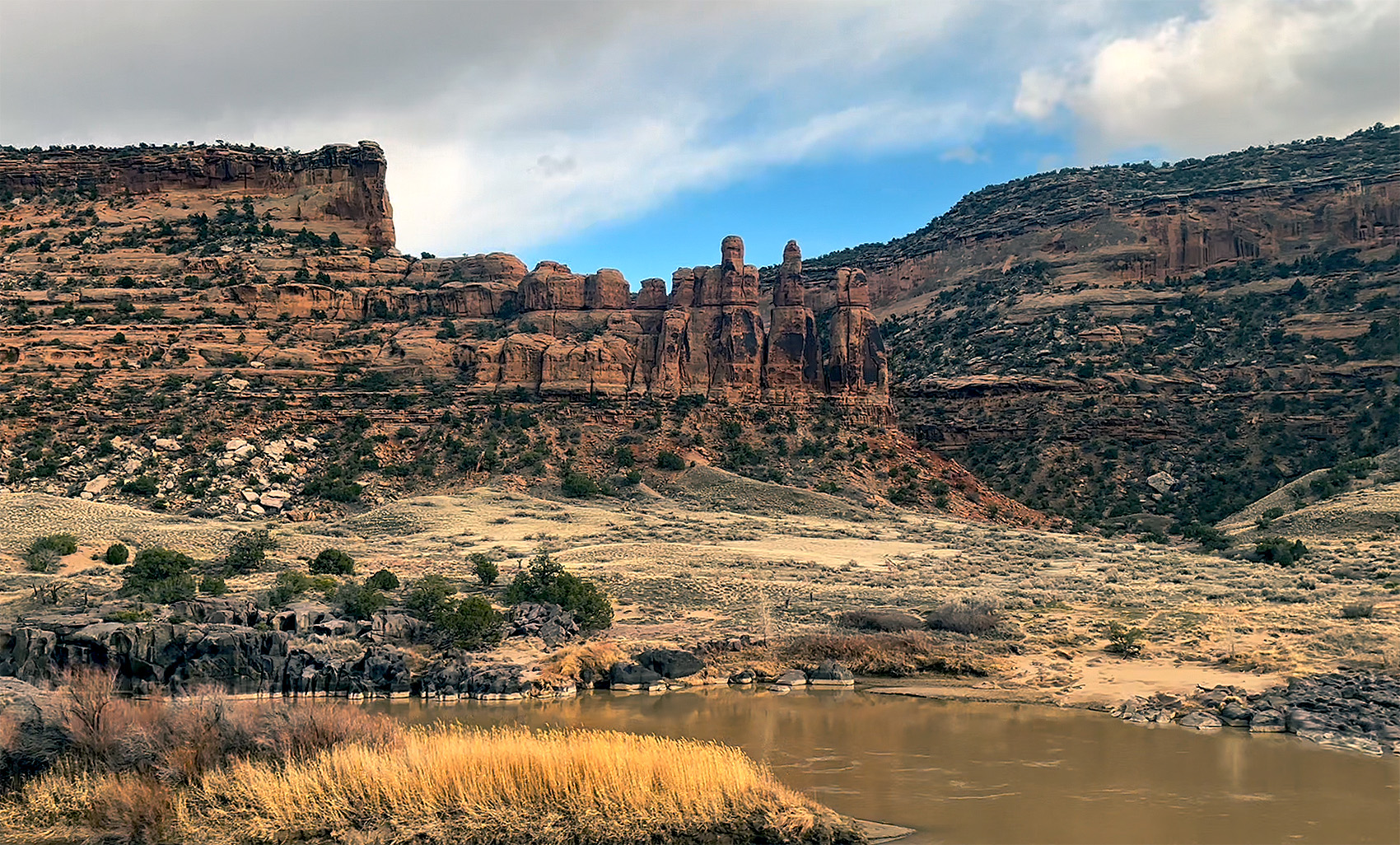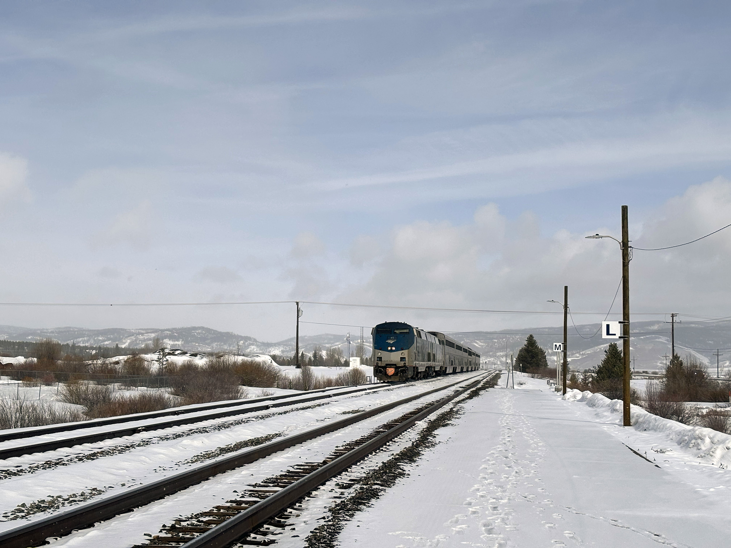 Not long after our departure from Glenwood Springs, the weather takes a turn for the worse. Blowing rain at first, followed by snow. In the midst of those whiteout conditions, JB spots a pair of elk wading along the banks of the Colorado. Then, a brief spell of sunshine – all while it’s still snowing – brilliantly lighting up the topography. By the time we pull into Grand Junction, it’s overcast again but completely dry. The third and last “smoke stop” for the day, there is nothing grand about Grand Junction sadly, what with its elegant old depot building barricaded, and out of use for over three decades at this point. As we scrutinize the plaque alongside the historic building, Donna, the coach car attendant makes the “all aboard” call, and we obediently head back to our viewing stations.