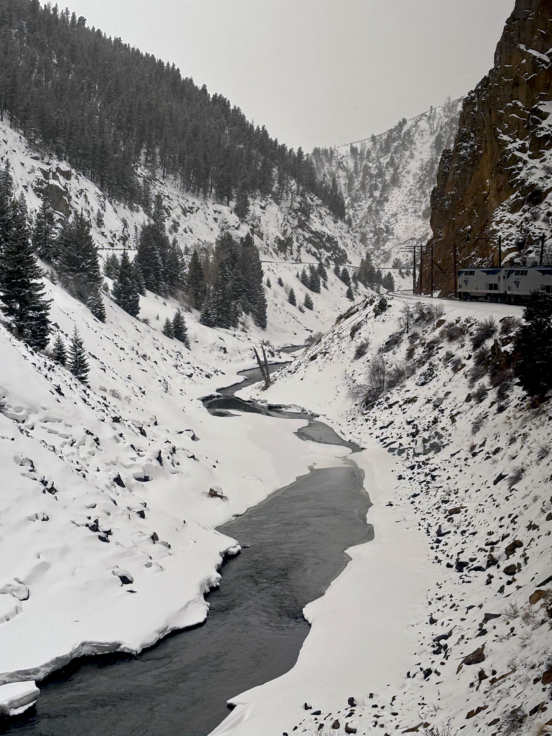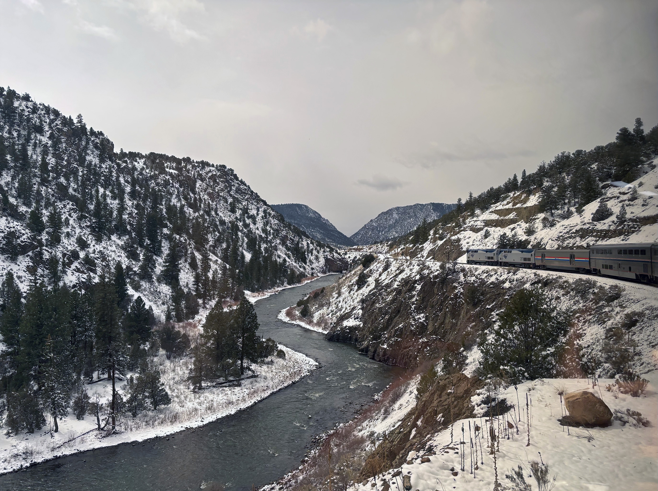 It’s a chilly -7C (19F) as we trek to the front of the train to get a few pictures. Located 8,561-feet (2,609 m) above sea level, Fraser-Winter Park is the highest station served by Amtrak, and a popular one at that, with plenty of skiers and snowboarders alighting. Back in the warm comfort of the Sightseer Lounge Car, we jockey into position for the next point of interest, Fraser Canyon. It is the first of several canyons the Zephyr will go through today, and a relatively narrow one at that. Past Granby, we lose sight of the Fraser River, and are joined instead by the mighty Colorado River, whose headwaters lie less than 30-miles to the north. Its channel is narrow at first but opens up in dramatic fashion not long after, only to narrow again as it carves its way through a canyon. The railway dutifully follows along. In this truly spectacular section along the Colorado River, the views are only ever impeded by the occasional tunnel. A much needed breather, we all agree.