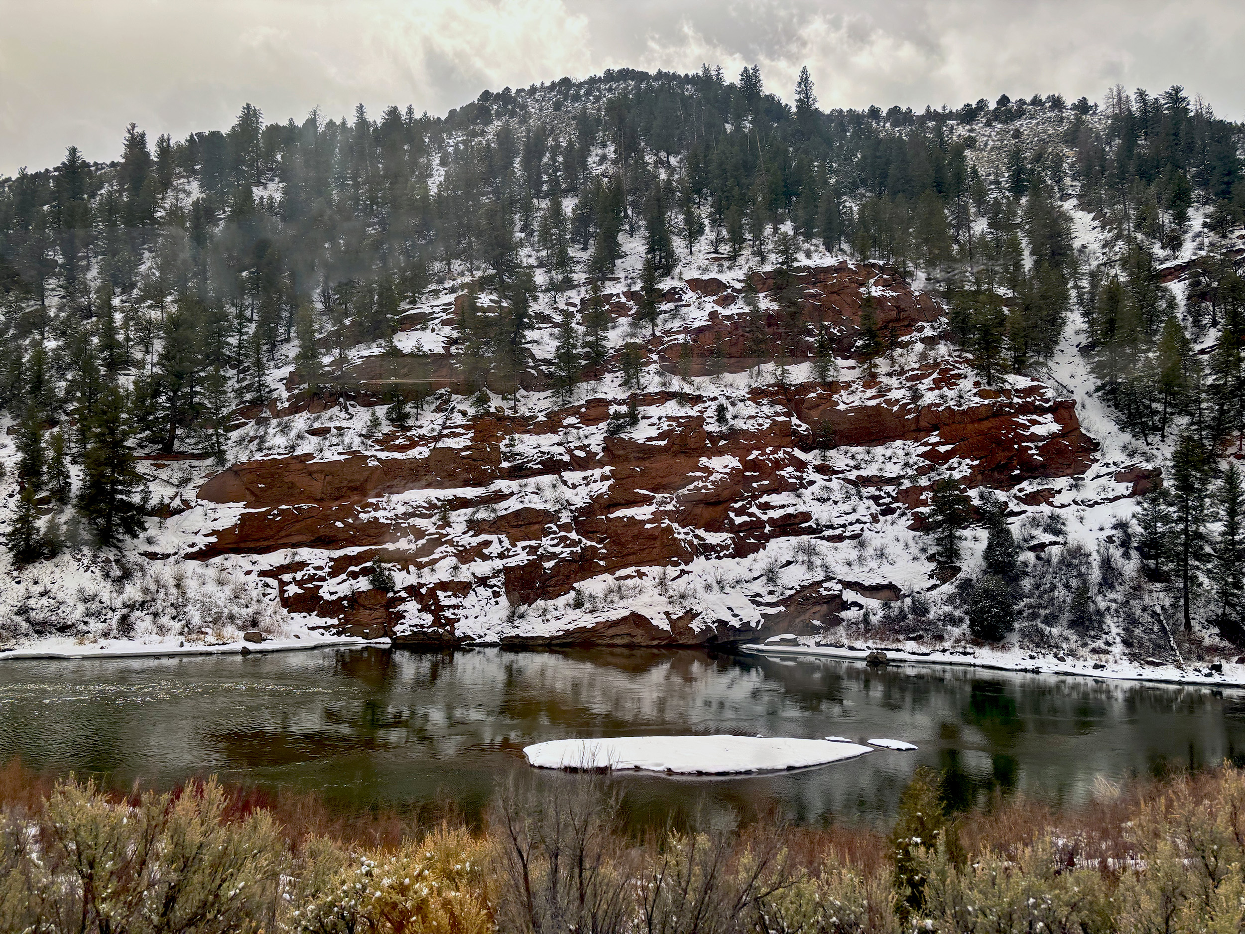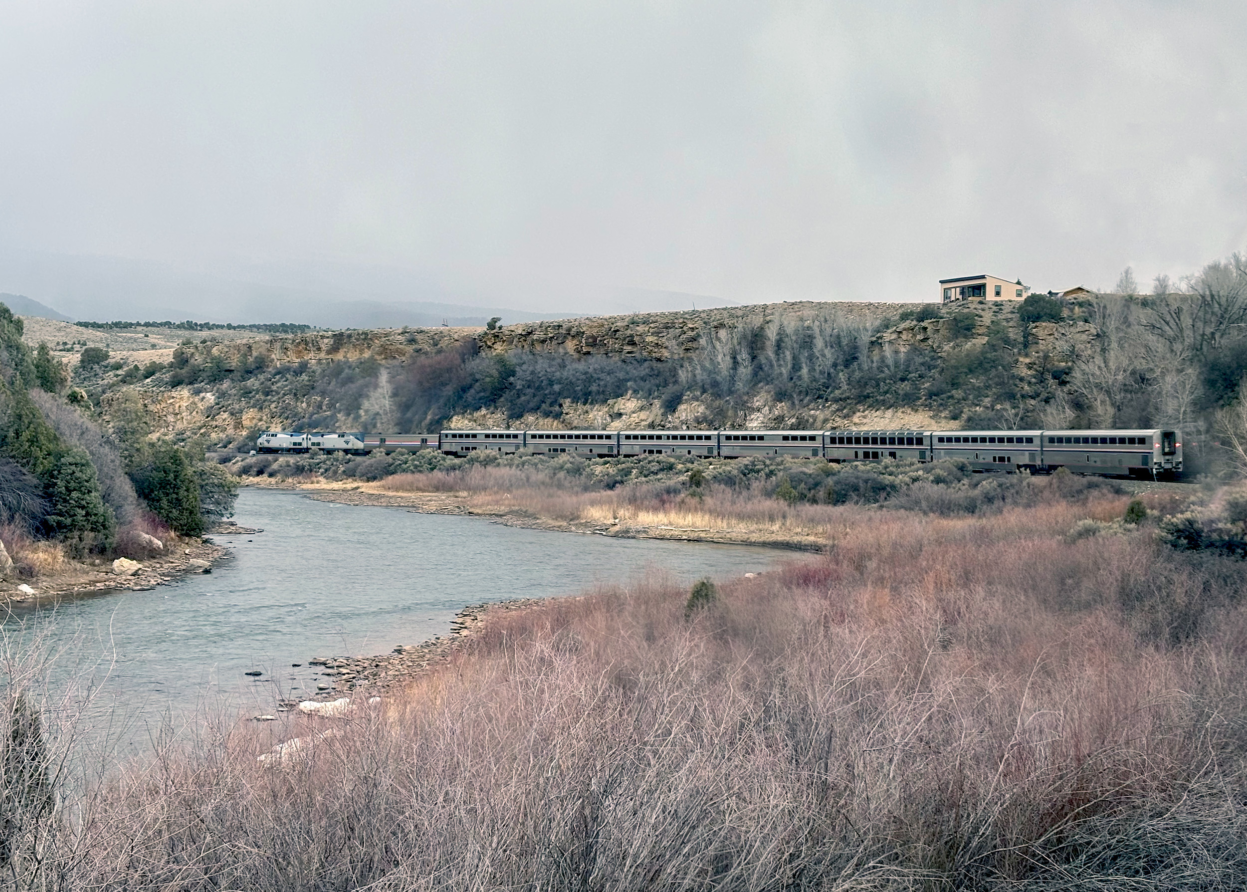 As we inch further west, and toward drier climes, a partially exposed rock face reveals the true colors of the terrain. In Spanish, the word Colorado translates to “colored reddish”, a name stemming from the significant deposits of silt in the area. The weather can change by the hour in these parts, as evidenced by a fresh covering of snow on the mountains to our south, all while the cloud cover is slowly lifting. At Dotsero, we’re joined by Interstate 70 on the north bank of the river, and some very blue skies. For the next eighteen miles, road and rail will occupy either side of the very scenic Glenwood Canyon, till the town of Glenwood Springs is reached. Glenwood is the largest of the canyons that dot the Upper Colorado River, with some of its walls climbing as high as 1300-feet (400 m), and resultantly, the section of road through it is considered one of the most scenic within the US interstate highway system. Its engineering, no less impressive. The most coveted views, of course, remain firmly with passengers on the California Zephyr.