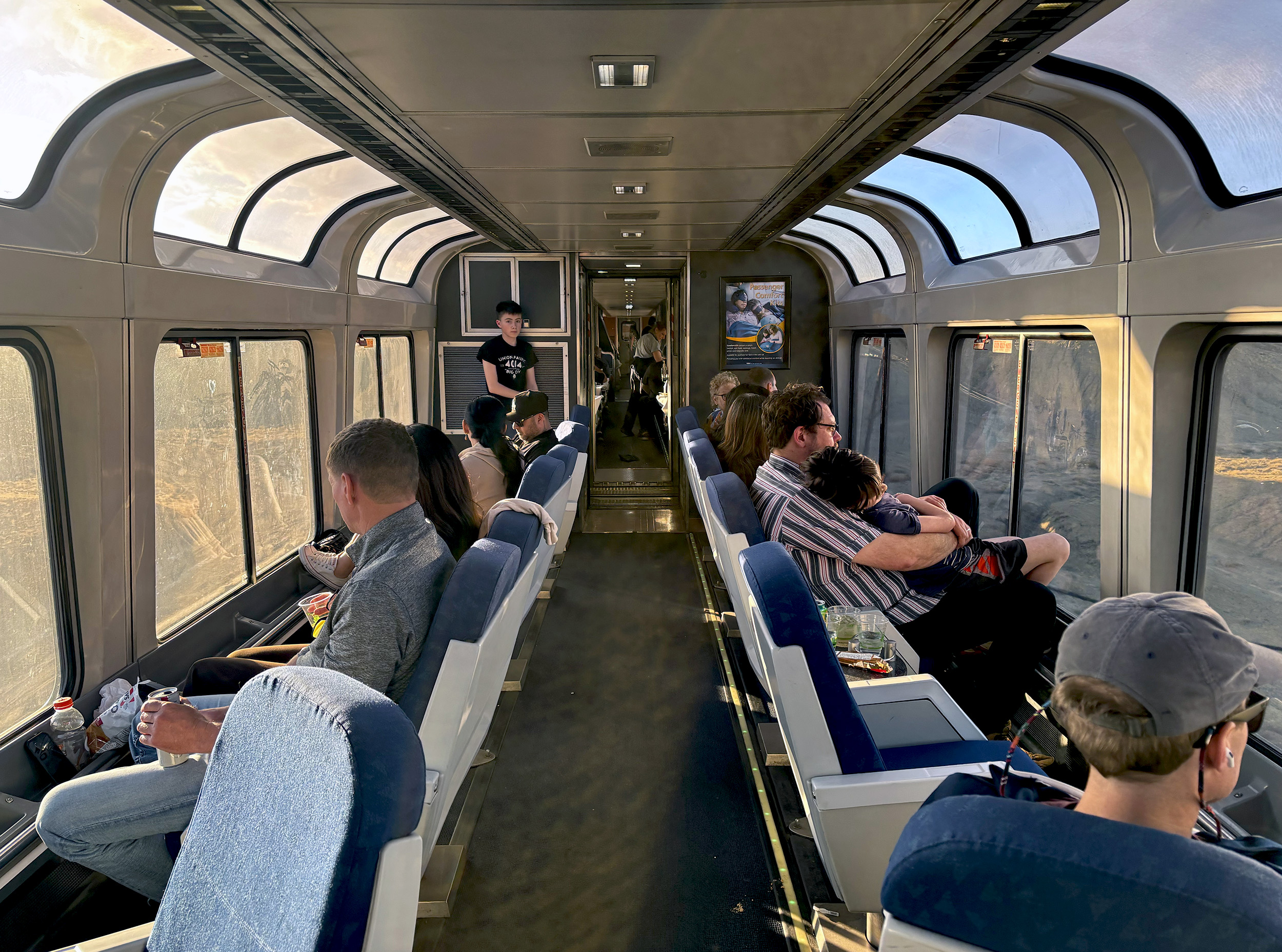It’s a crisp March morning in Denver as preparations are underway just outside Union Station for a St. Patrick’s Day parade. Inside the station, JB, SS, SB and I are queued up to board Amtrak No.5, the westbound California Zephyr. The train is running to schedule today, having originated in Chicago the previous afternoon, with over a thousand miles – just under half its route – already covered. On past long-distance journeys we’ve all shared roomettes, but having booked in advance this time, we managed to get a decent fare for single occupancy. And just as well. Amtrak’s roomettes, while advertised to accommodate two, are really better suited to just one. We barely linger in them after dropping of our bags, and instead make a beeline for the Sightseer Lounge Car, where the views are guaranteed to be exemplary, but seats are always hard to come by.