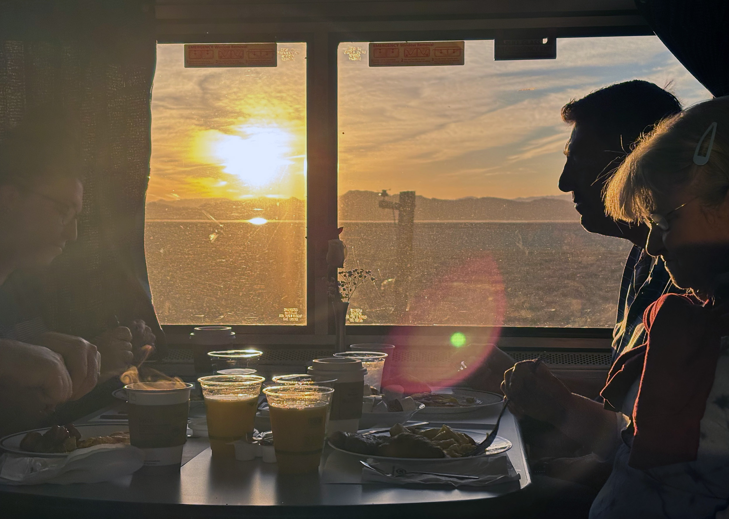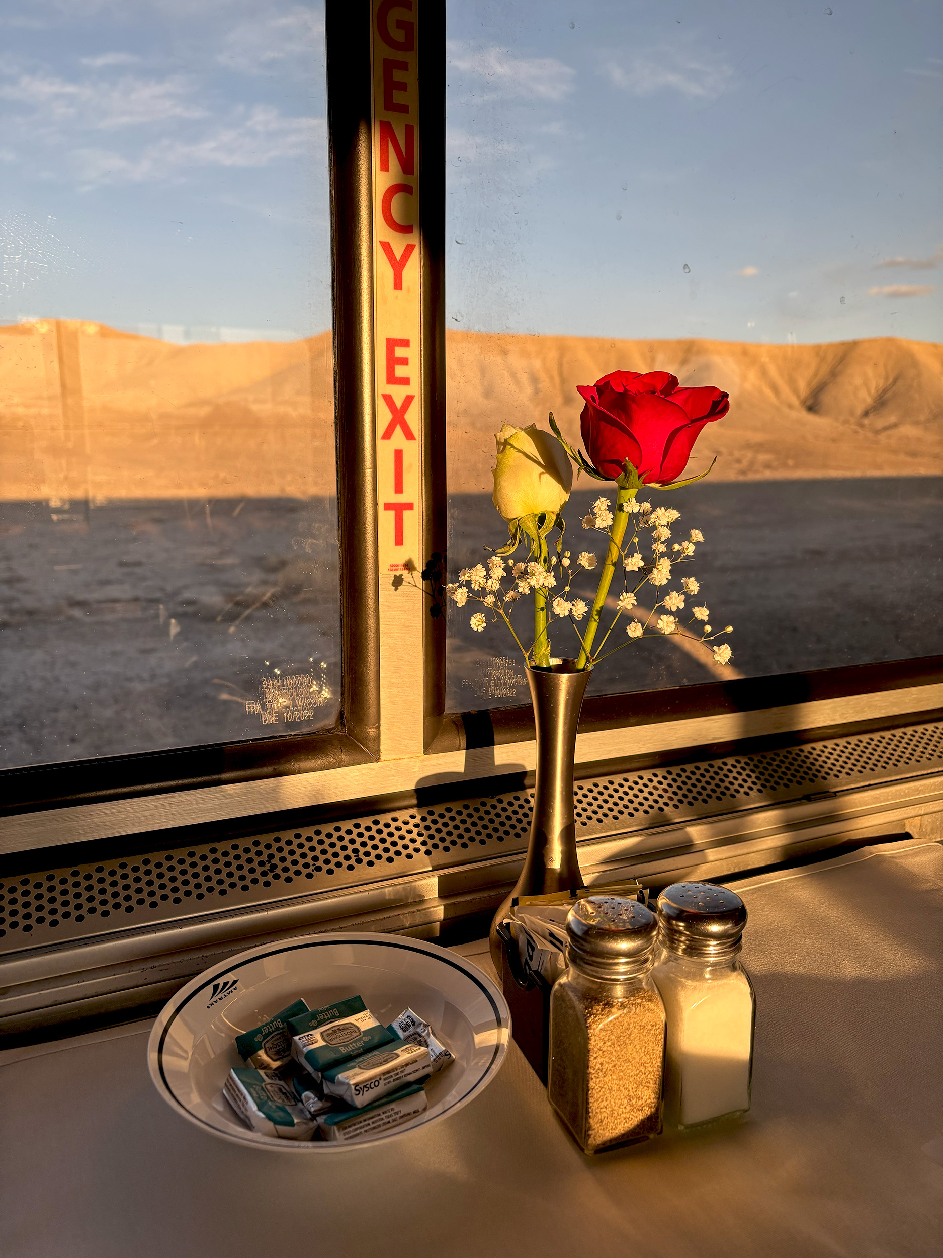 First light reveals a busy Interstate 80, with road and rail charting a course through the Humboldt River Valley. It’s 0530 in the morning, and we’re just east of Winnemucca, in the State of Nevada, having gained an hour overnight. The bed and the ride quality, I have to say, better than I remember it being the last time I did an overnighter on Amtrak. It’s also worth mentioning here that had we been running a few hours late this morning, we would probably be waking up to the Boneville Salt Flats of Western Utah. Oh well, you can’t have it all! Speaking of which, we’re one of the first to show up for breakfast – which is first come, first served – but for some inexplicable reason we are assigned seats (not to our liking, of course) by the Dining Car Manager. We overcome our disappointment somewhat, as freshly brewed coffee and hot scrambled eggs arrive at our table, and to our northwest, the first rays of sunlight paint the Santa Rosa Range of mountains a soothing orange.