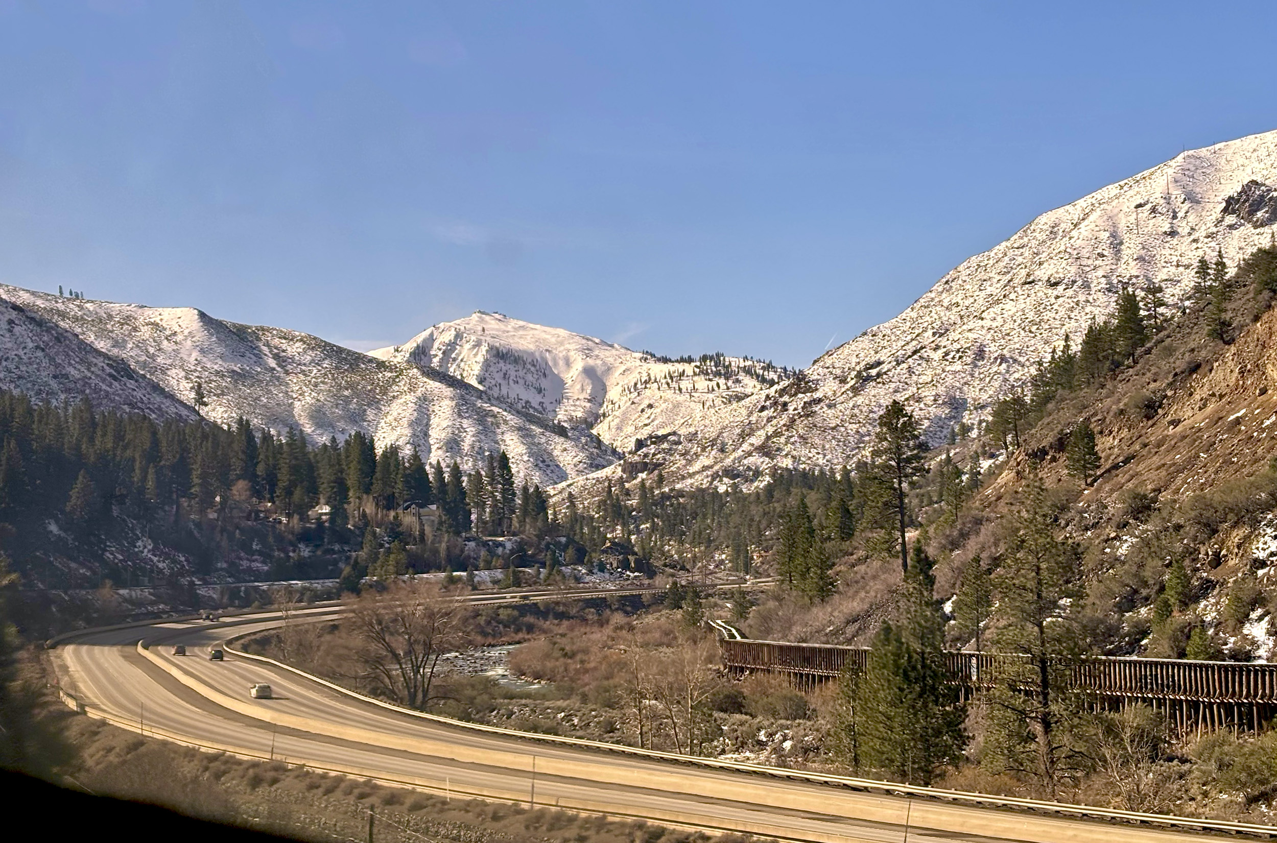 Reno, the third largest city in Nevada, is reached ahead of schedule. There’s plenty of time here to stretch our legs, but the present-day station is an utter disappointment. Built into a trench, it’s emblematic of the kind of poor urban planning that besets many an American city. But we have more pleasant things to look forward to, thankfully. We’ve secured prime seats in the Sightseer Lounge once more, and as we pick up speed west of Reno, the Truckee River comes into view. Flowing between California and Nevada, the river is the only outlet for nearby Lake Tahoe, and the Zephyr’s route, paralleling Interstate 80 here, now makes its way through the Truckee River Valley. In the 30-odd miles between Reno and the town of Truckee, we cross into California, gain 1600-feet (488 m) in elevation, and are back in the midst of a winter wonderland.
