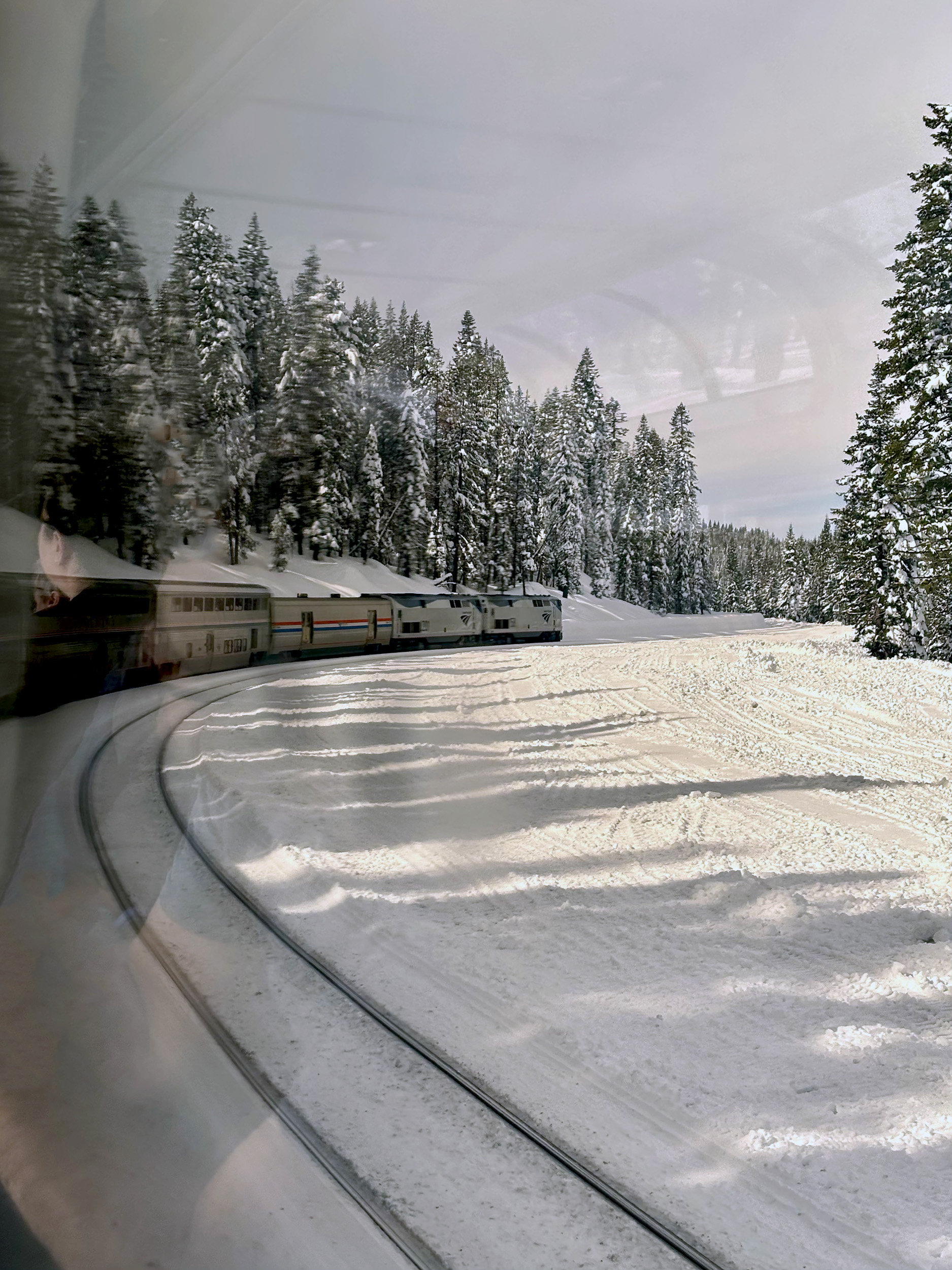 The pass lies nine miles west of Truckee, and in that short distance, the Zephyr climbs a staggering 1,200-feet (360 m). Just shy of the summit (7,056 ft), and in-between several long tunnels, we get a glimpse of magnificent Donner Lake. There are 15 tunnels on the section that makes up Donner Pass, and the Zephyr makes one final push as it approaches Tunnel 41, within which lies the summit. Having cleared that milestone, we’re treated to sweeping views of the majestic Sierra Nevada, in all its wintertime glory. In Spanish, Sierra Nevada roughly translates to “snowy mountains”, and Donner Pass, with an average annual snowfall of over 400-inches, couldn’t exemplify that any better.