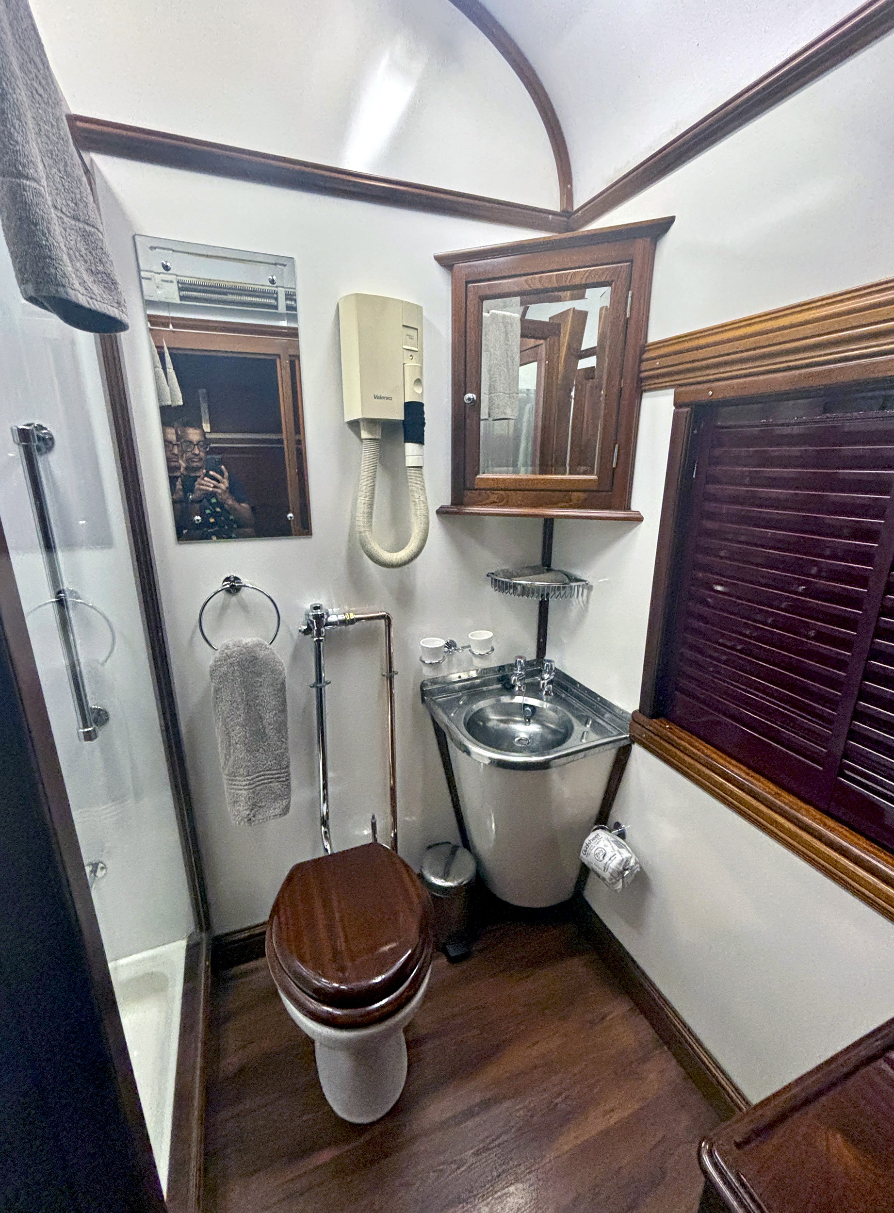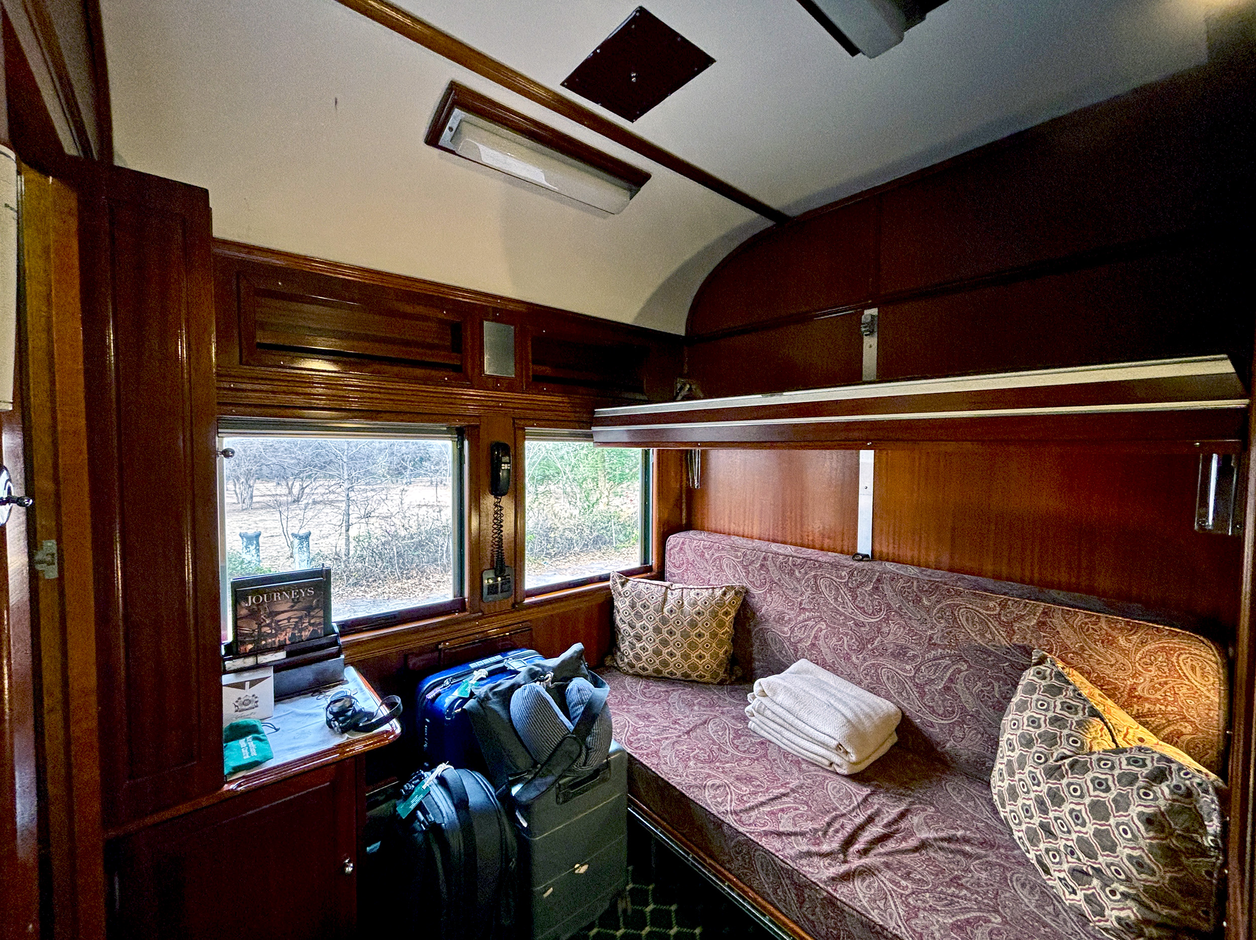 Rovos offers three kinds of accommodation, with the Pullman’s being the smallest (7 m²) and cheapest, if that adjective could even be applied for this genre of travel. Our carriage constituted five Pullman suites, each individually named, with two guests to a suite. Within those somewhat constrained dimensions were all the trappings of a 5-star hotel. From luxe bath robes in the ensuite to a toilet kit full of premium amenities. From a minibar stocked with bubbly to a tea kit complete with bone china. NS and VB were in Rorke’s Drift, two doors down from us in Kariba, and our carriage, while a lengthy walk from the dining cars, was perfectly positioned towards the end of the train. A beautifully trimmed cigar lounge took up much of the adjacent carriage, and past it lay the lounge and observation car. It was one of two on the train, but this one brought up the rear, and offered some of the best seats in the house – an open-air balcony.