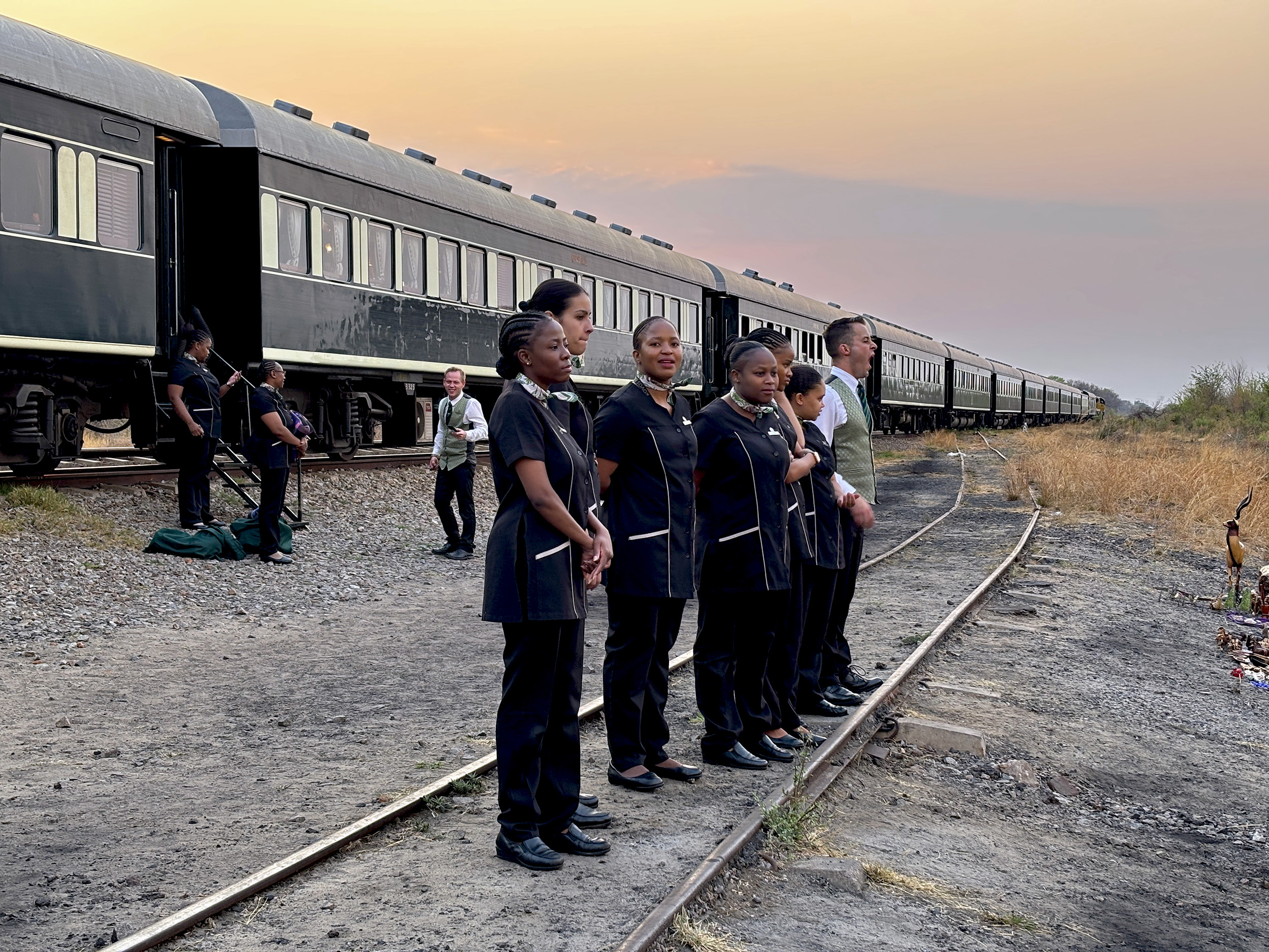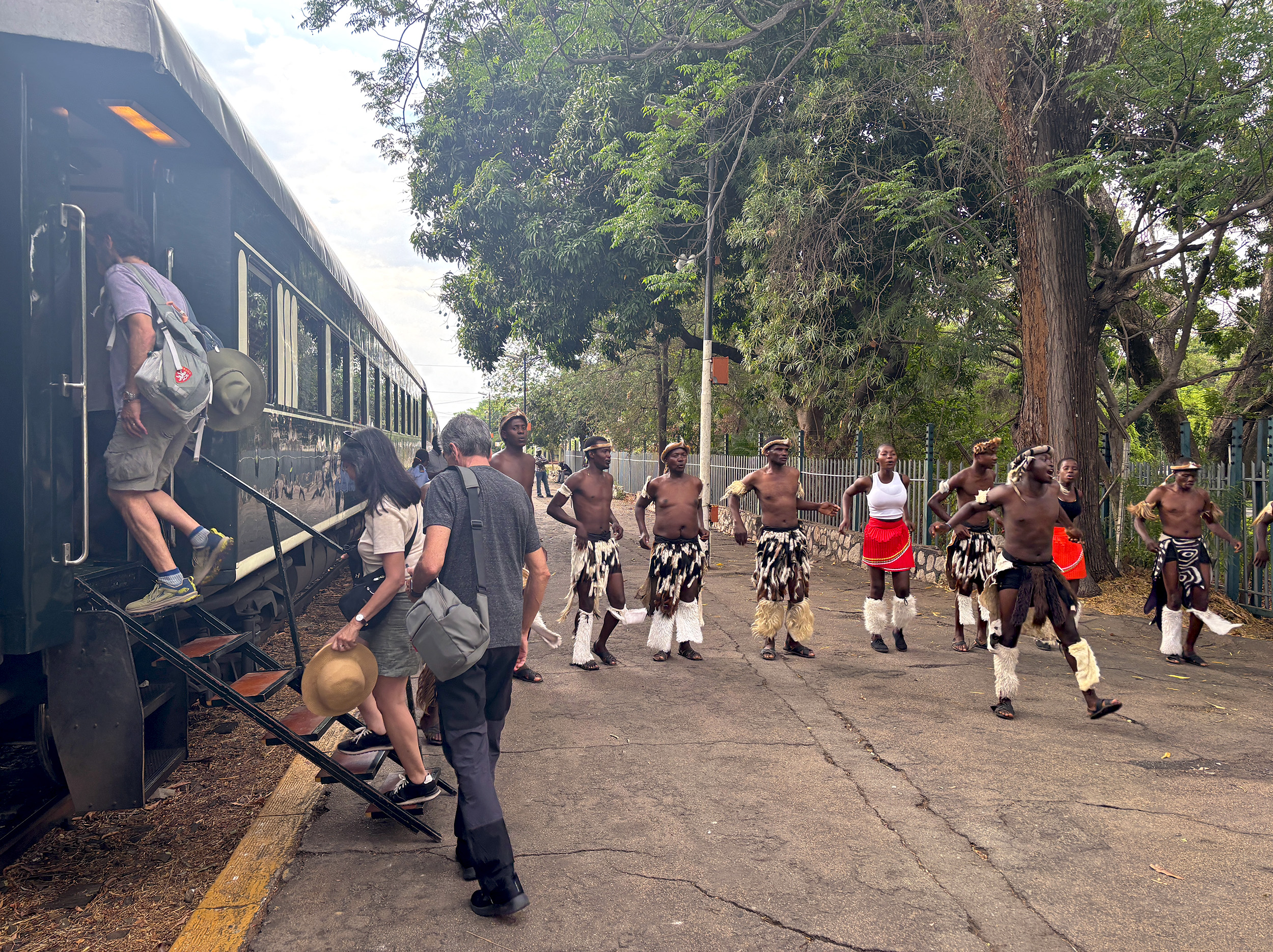 Daphne, our train manager on the 3-night itinerary down to Pretoria, introduced her team, and provided us with a pre-departure briefing. From the Rovos Rail lounge at the Victoria Falls Hotel, it was a short walk down to the platform, where we were treated to a traditional welcome. Our luggage had already been taken to our lodgings ahead of time, and just as well, for it was a long walk through narrow corridors to get to carriage 8065.