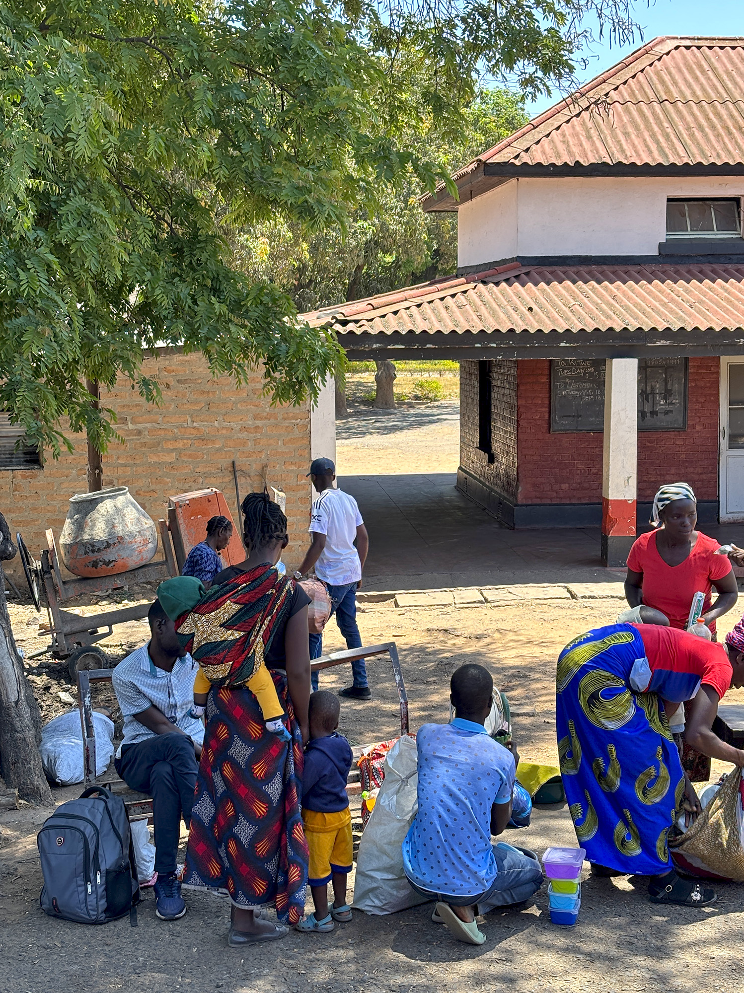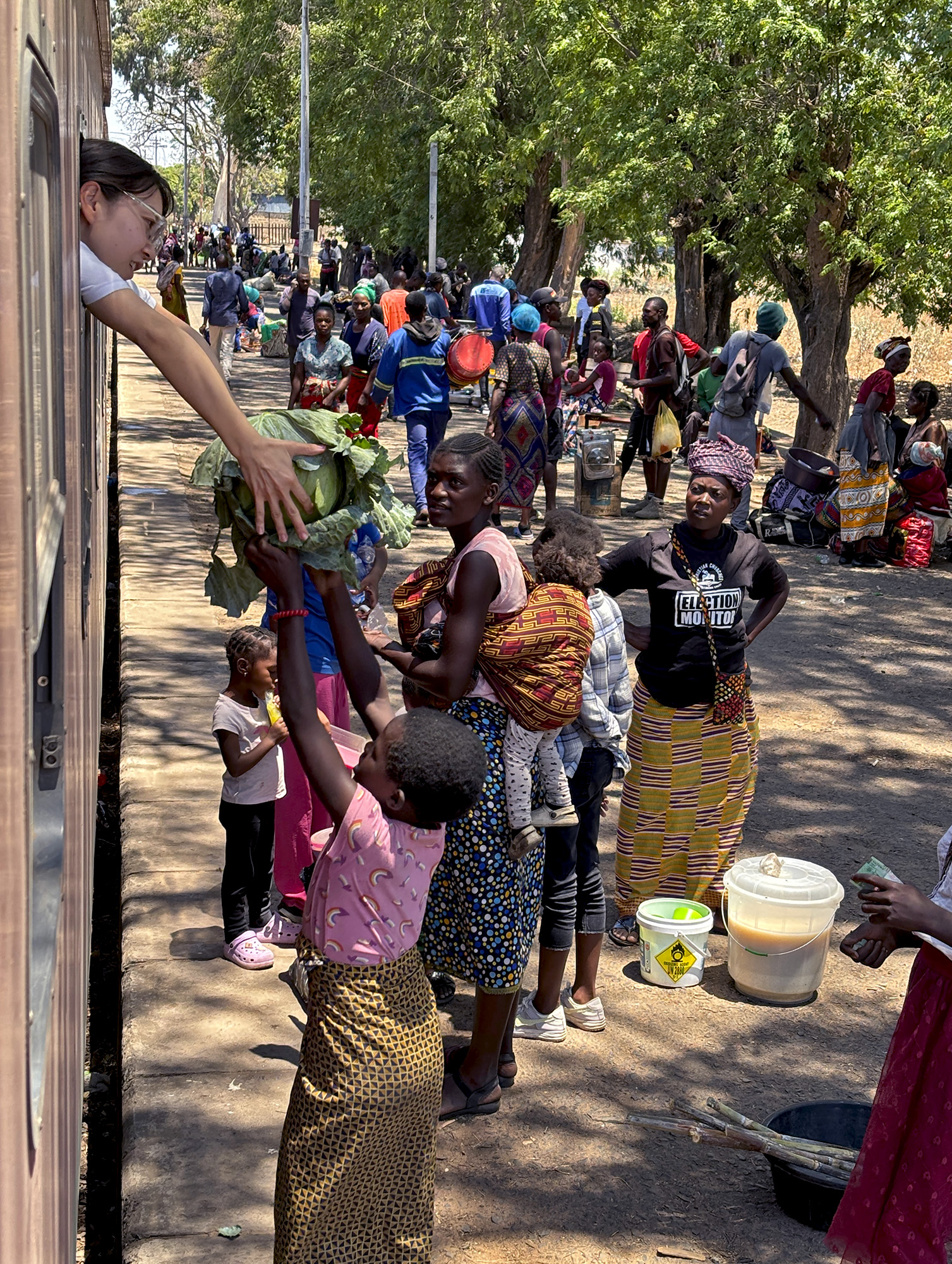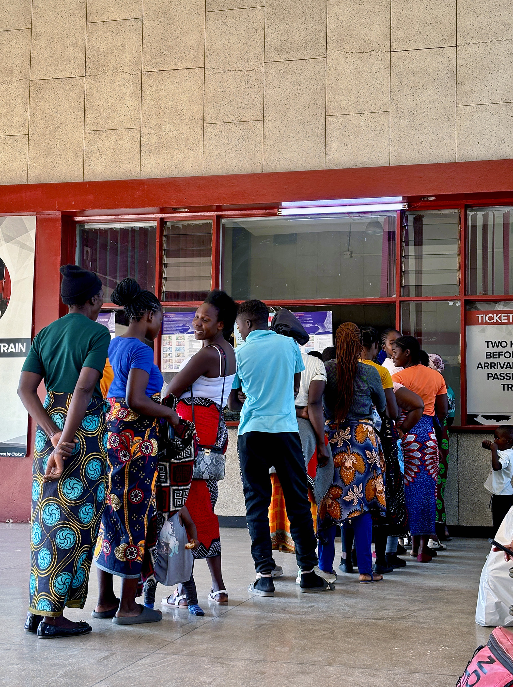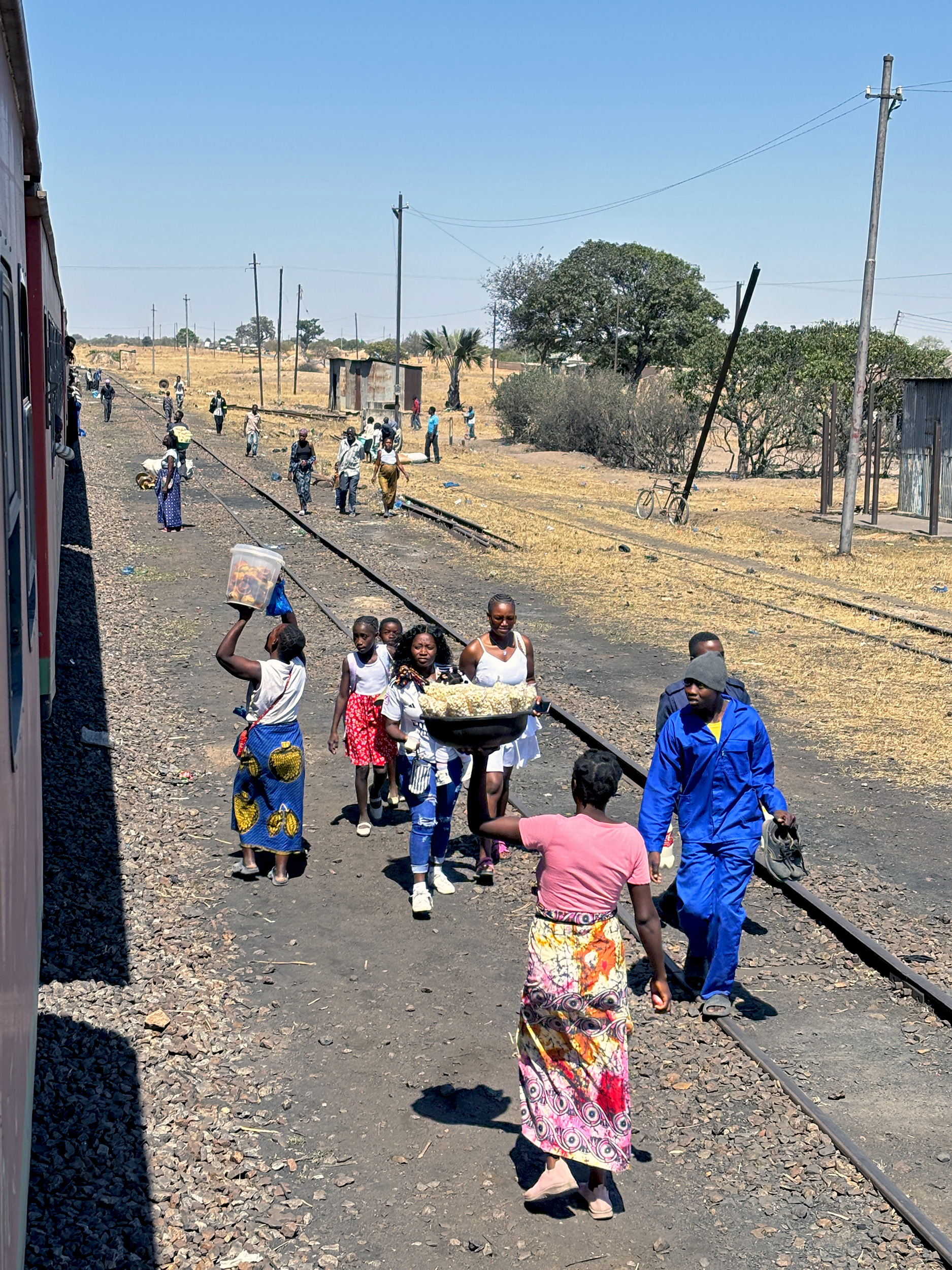 At an average elevation of 1200-meters (3900-feet), Zambia lies on the Central Plateau of Africa, so expectedly there wasn’t much variety to be had outside the window. Some low hills to our east as we got further south, but nothing else of note. At Monze, Choma and Kaloma though – our three major halts during the day – there was plenty of life and activity on the platforms to keep one enthralled. Vendors in bright chitenge skirts, their infants wrapped behind in slings, hawking everything from fresh produce to the ever-popular snack, chikanda. Toned men, across the age spectrum, loading and unloading unwieldy parcels. A labor-intensive process, I realized later, which was the cause of our endless detention at most stations. Whole families gathered, waiting to receive or send those very parcels, or see off their loved ones. In the background sat faded station boards and buildings in disrepair, the odd jacaranda behind them, sashaying in the wind.
