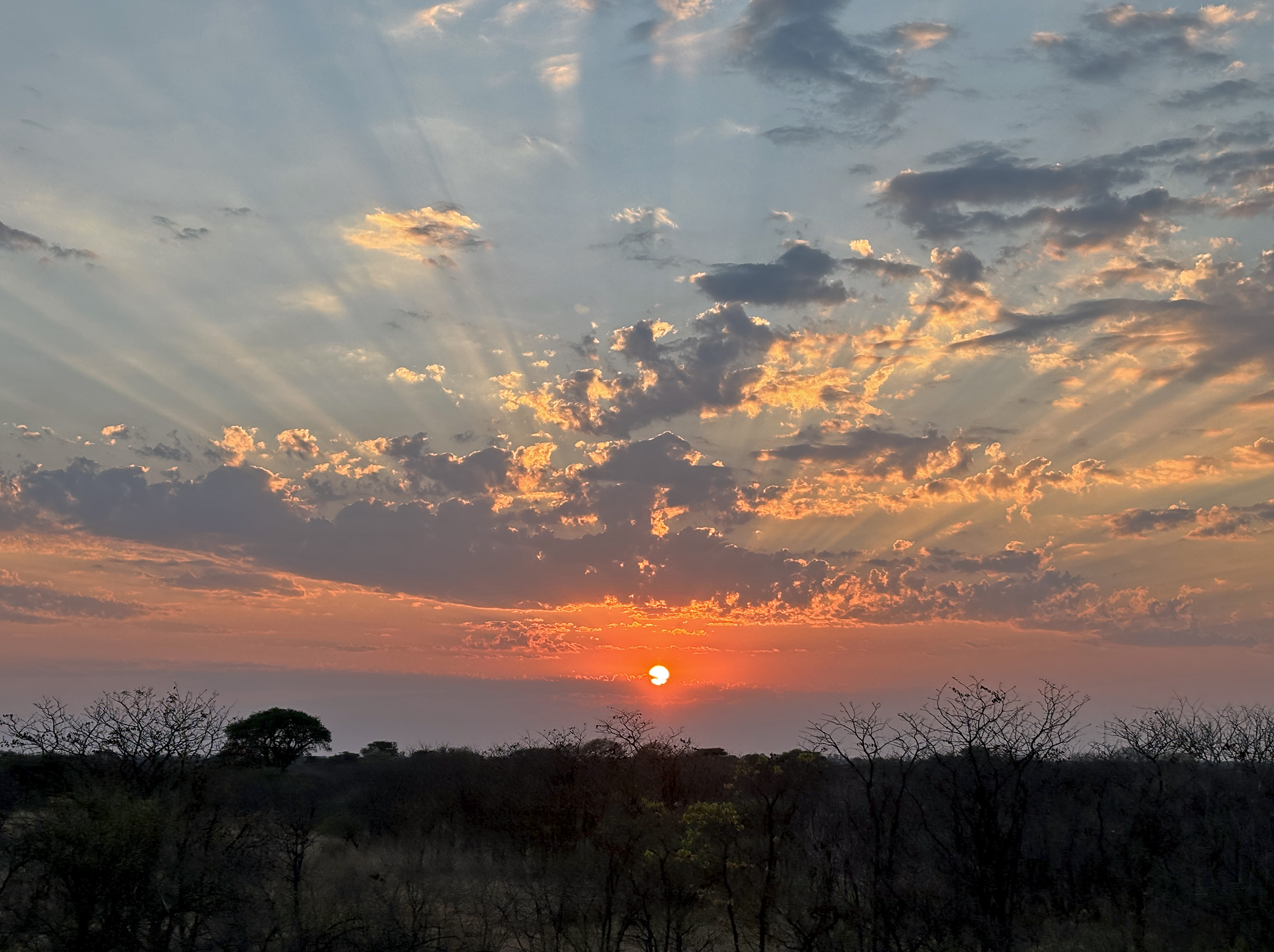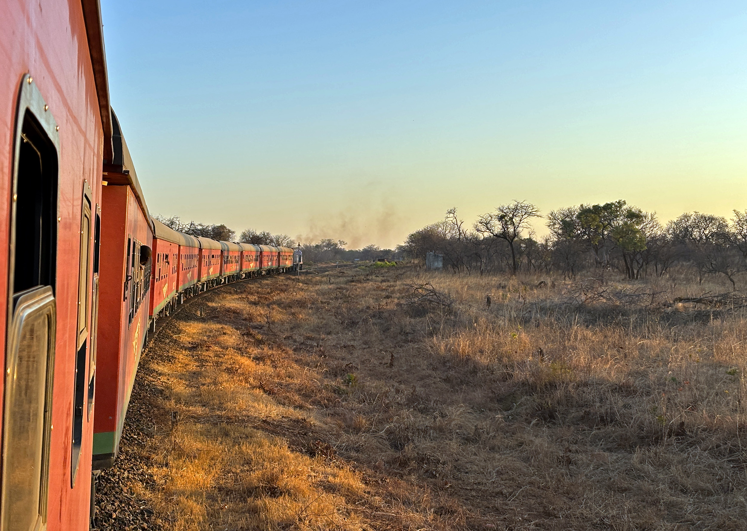 At dinner on our second night, we were parked at a freight yard on the outskirts of Bulawayo – the train was typically brought to a standstill in time for each meal – when news came through that we would be detouring through Botswana. There had been a freight train derailment further up the line, so the diversion was the only means by which to enter South Africa. All hell broke loose. For me, specifically, given my weak passport credentials, one that required a visa to pass through that country. It took much calming by NS, VB and RR for me to settle down, along with a few reassuring words by Daphne – “we will take care, don’t worry” – as only she could deliver them. The night passed. There were no jarring knocks on our door. And I awoke to the spectacle of sunrise in a new country.
