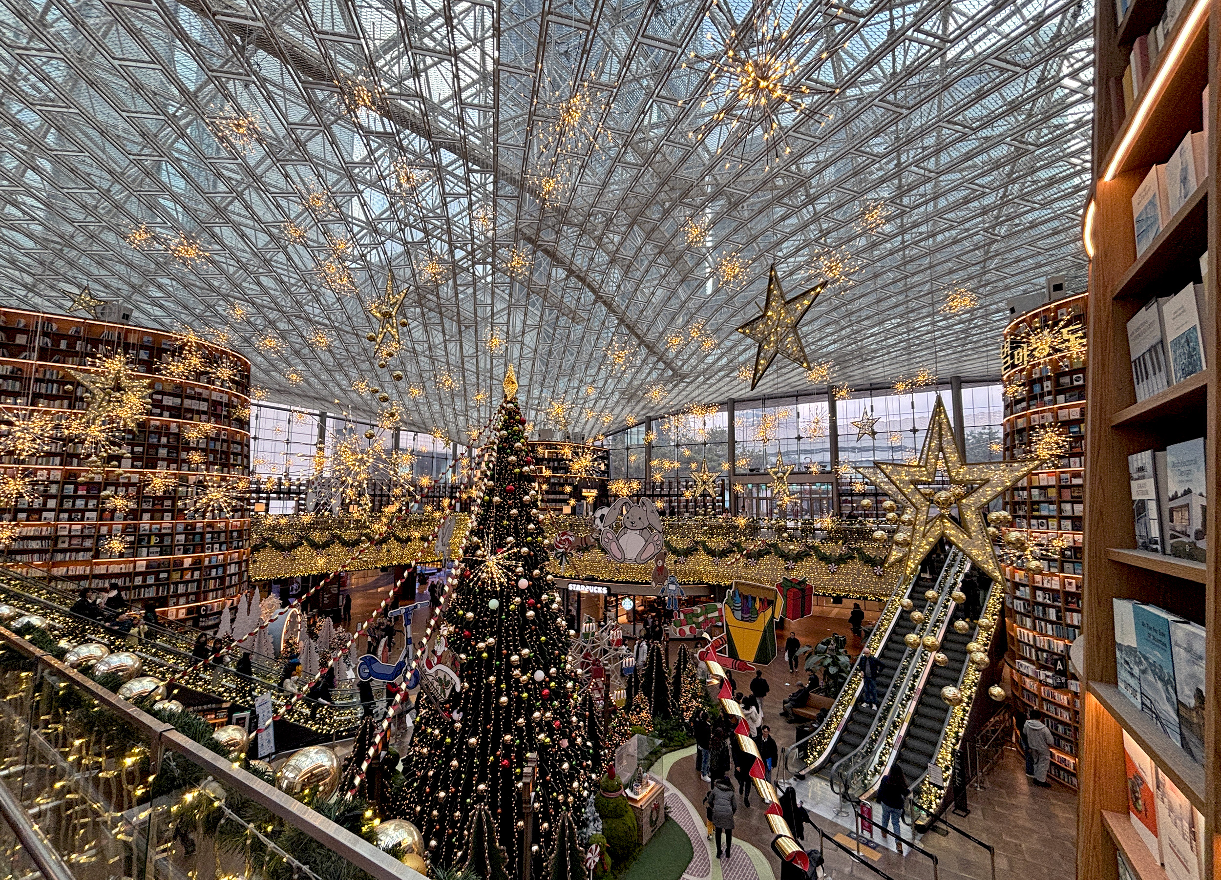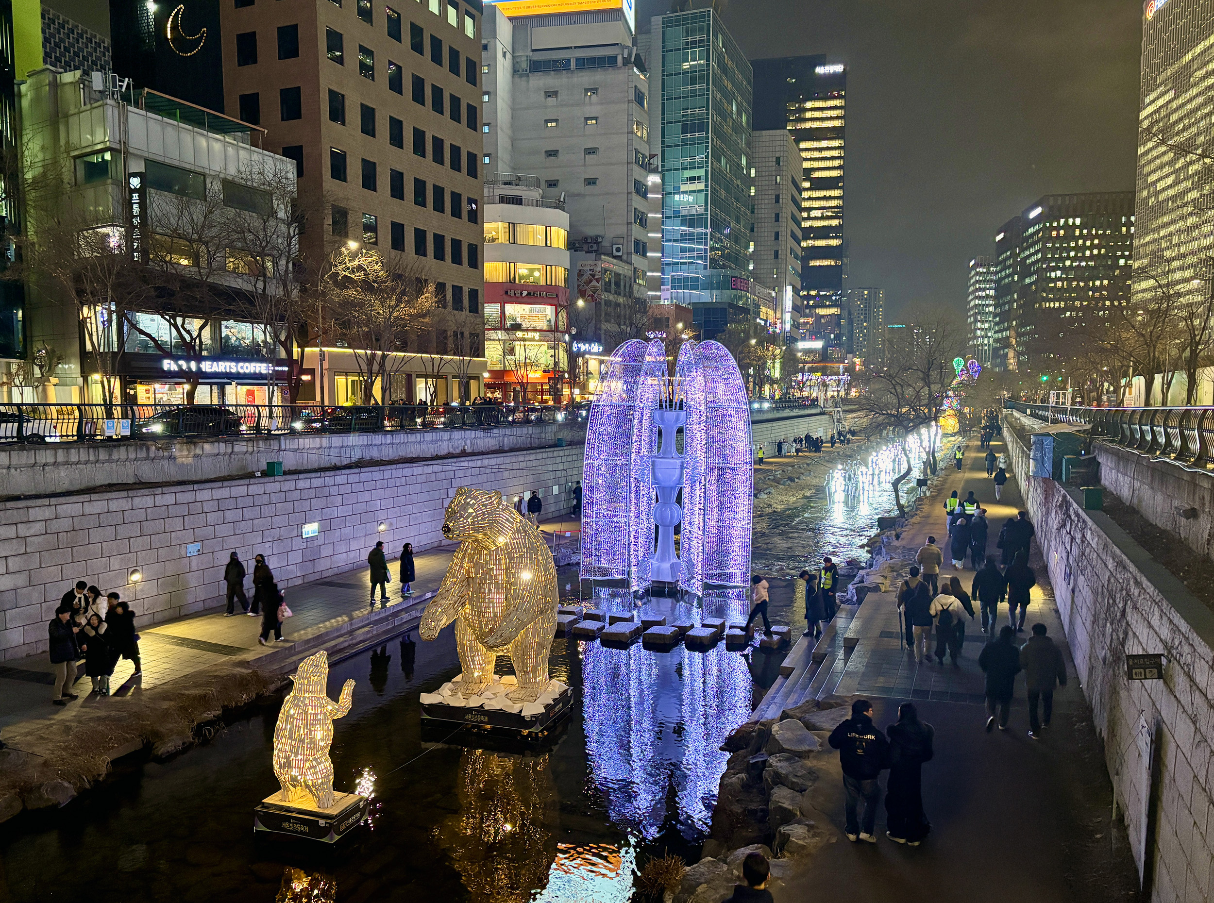 Each winter, Cheonggyecheon Stream plays host to the Seoul Lantern Festival, featuring hundreds of modern light installations, as well as traditional hanji (Korean paper) lanterns, with wide-ranging themes, covering everything from polar bears to ramyun! One of the most magical large-scale displays of light I’ve ever experienced, the festival also included captivating mixed-media works, beautifully woven into the natural and built environment along the stream. The festivities were hardly limited to the lantern fest though. From the custom light arrangements at Hongdae, to the decor at Myeongdong’s night market, to the stunning cardboard cutouts at Starfield Library, the festive cheer was more than abundant across Seoul. If I’d showed up there with no calendar for reference, I could’ve sworn it was Christmas eve.