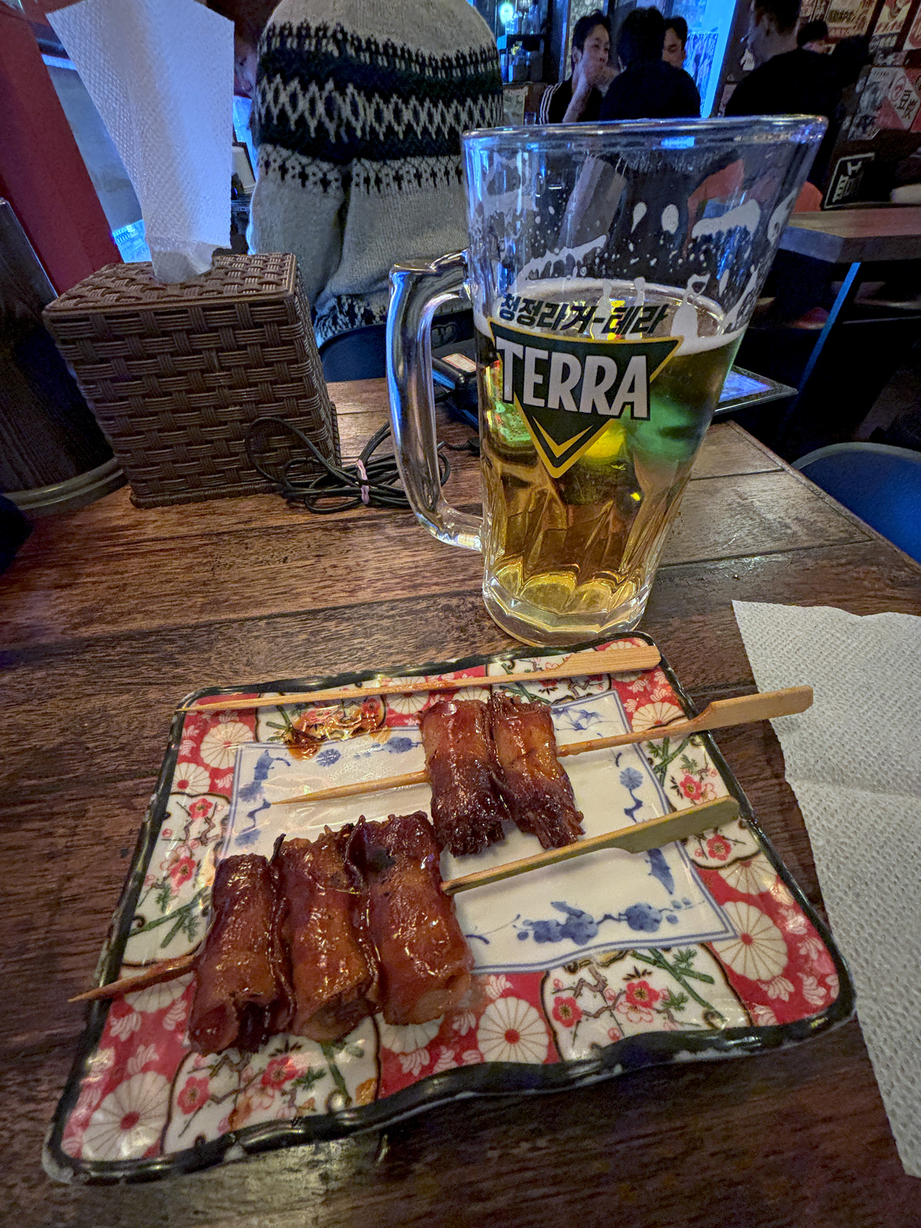 It was most likely that chutney at Mumbai’s Terminal 2 that did the trick. A miserable first leg ensued, with nausea and cold sweats dominating, and not a wink of shut-eye as a result. While in transit at Bangkok’s Suvarnabhumi, a little sleep was made up for, but having starved myself for the better part of a fairly lengthy travel day, I was glad to be walking up that flight of steps, into the warm embrace of an Izakaya-style bar. Skewers of enoki mushroom wrapped in pork belly were hurriedly summoned, along with a pint of Terra to wash it all down. A fairly audacious order, no doubt, given the fragile state of my stomach. Thankfully, I survived.